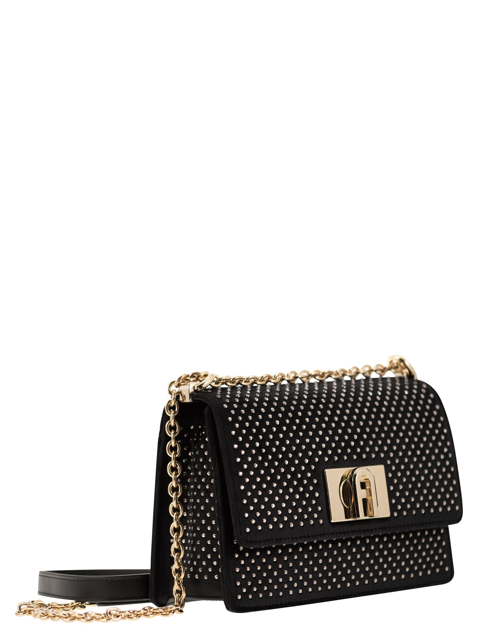 Perfetta capacità per piccoli oggetti ed effetti personali: Furla 1927 è una mini borsa da indossare sulla spalla o sopra la spalla. Realizzato in velluto morbido e setoso-morbido, si distingue per i suoi strass tono-su tono applicati, rendendolo l'accessorio scintillante perfetto per illuminare qualsiasi look. - Tasca aperta interiore - Tasca posteriore aperta esterna - spalla a catena regolabile con scissione in pelle - fissaggio con fila con ID designer di logo arco: Bafkaco BX1472 O6000