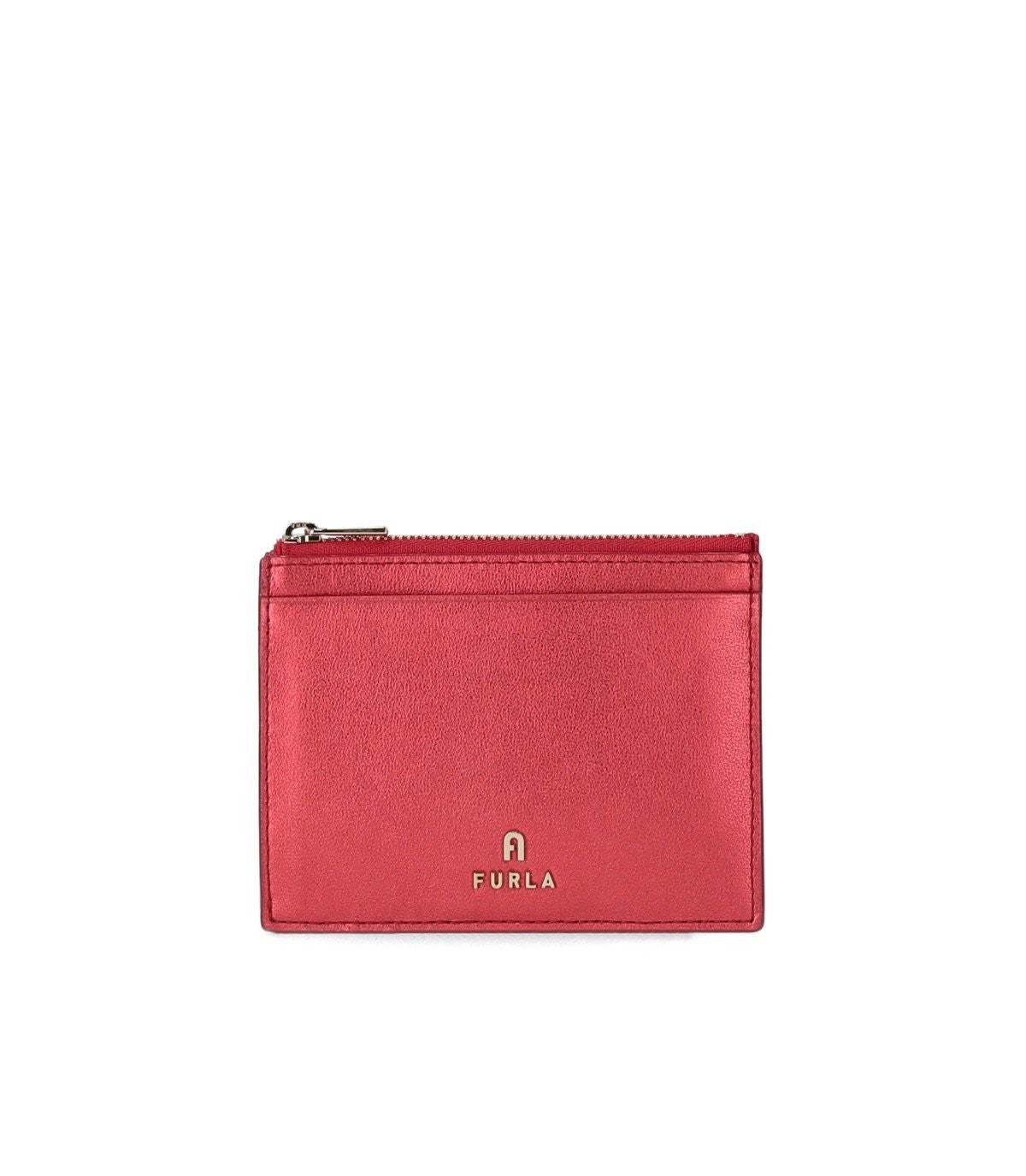 Camelia L Holder card di Furla realizzato in pelle laminata rossa. Hardware dorato, logo frontale e chiusura a zip. Interni con rivestimento viscoso, scompartimento anteriore e slot di carta sul retro. Misura 13x10x1,5 cm. Composizione: 100% in pelle. Composizione interna: viscosa al 100%.