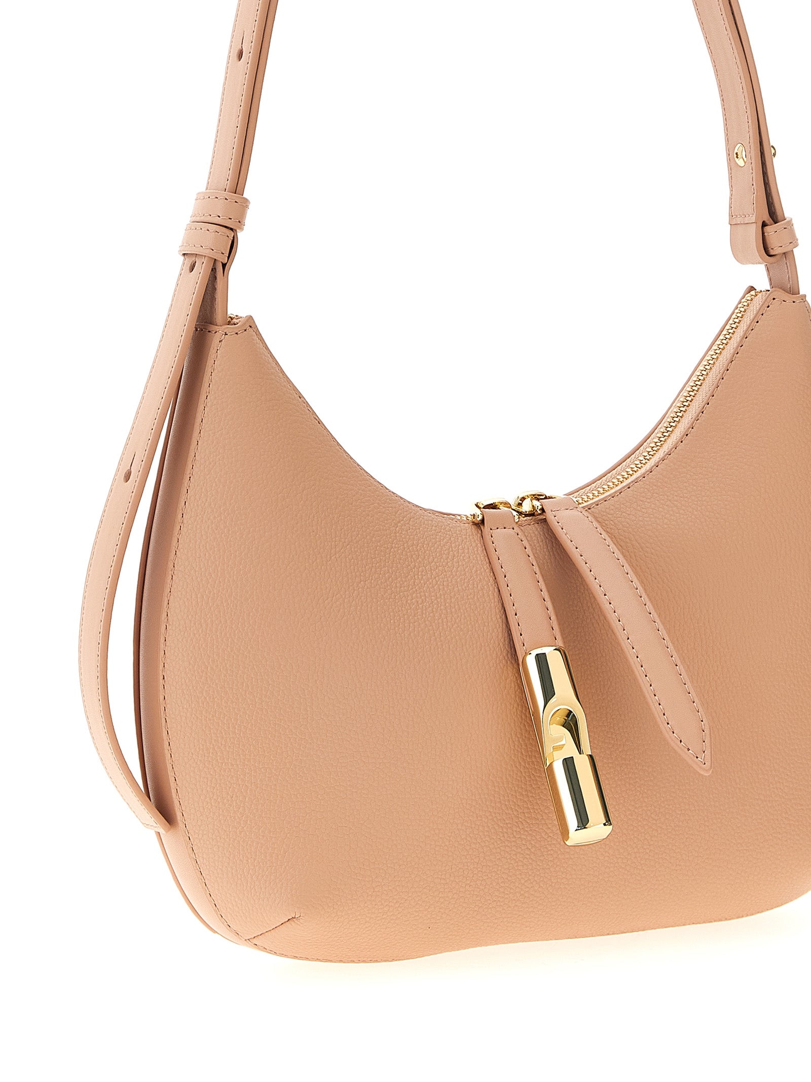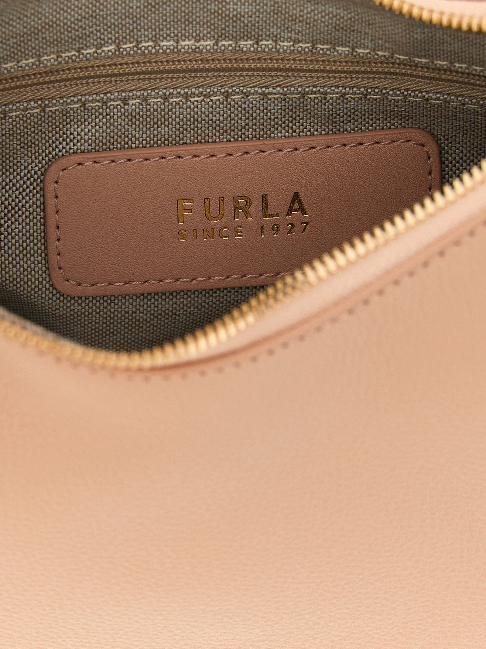 Borsa a tracolla in pelle martellare Goccia, spalla in pelle liscia regolabile, chiusura a zip e cravatta con hardware in metallo cilindrico con logo ARCO.