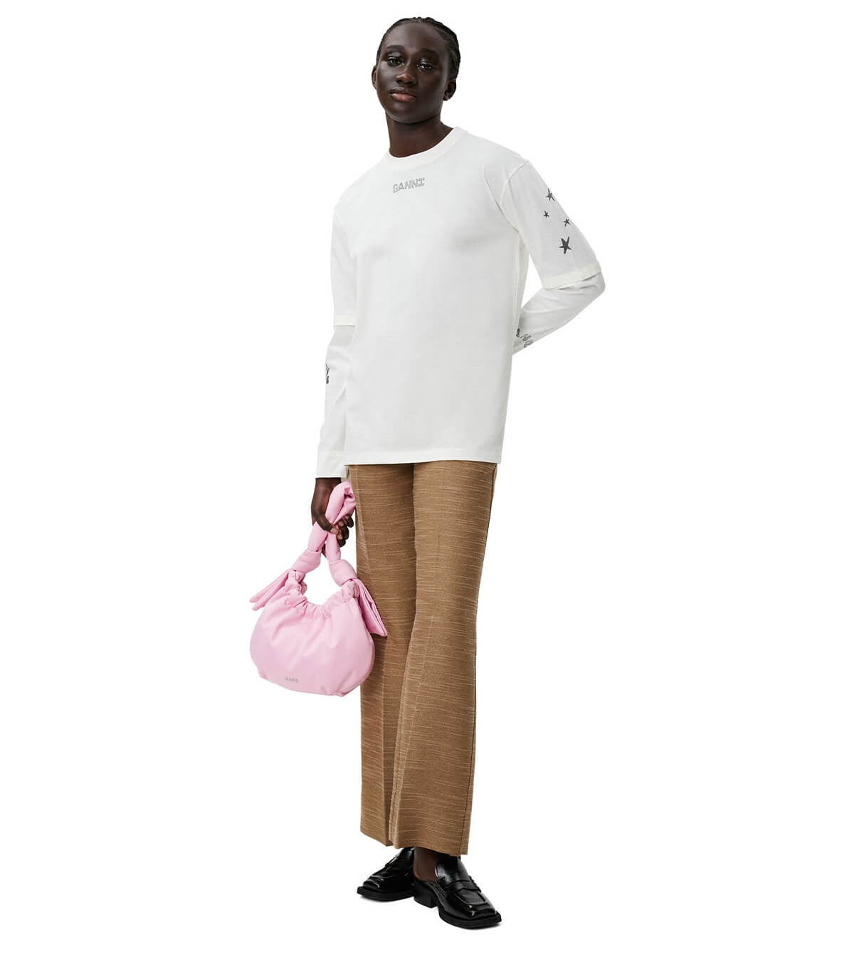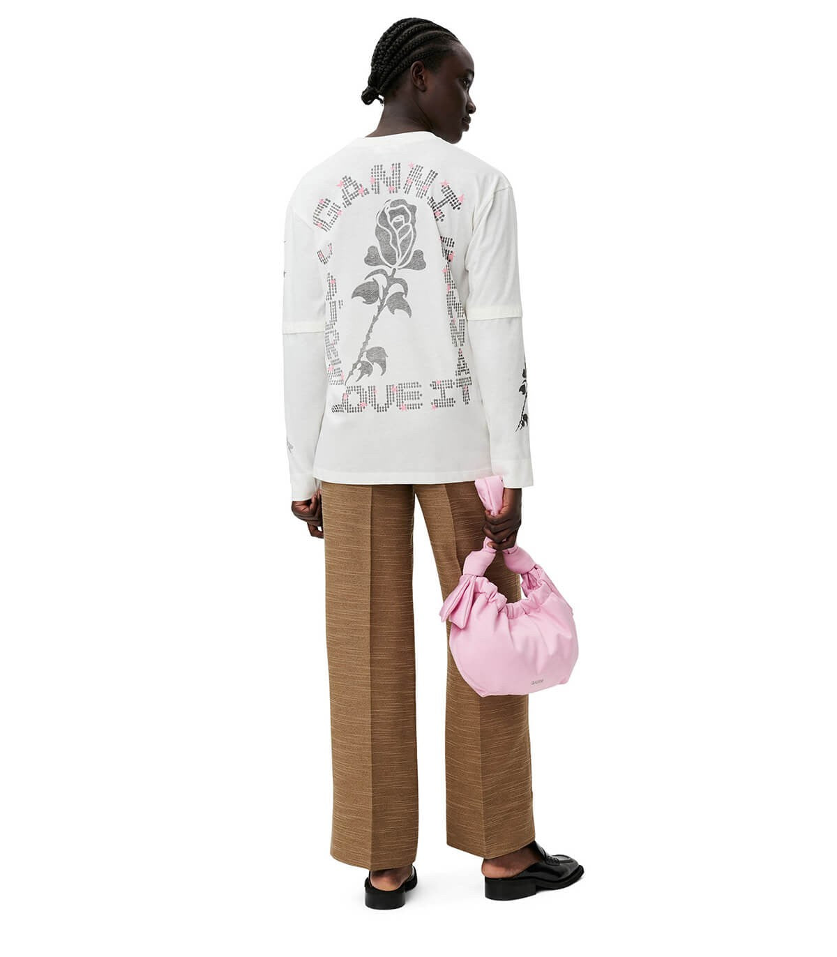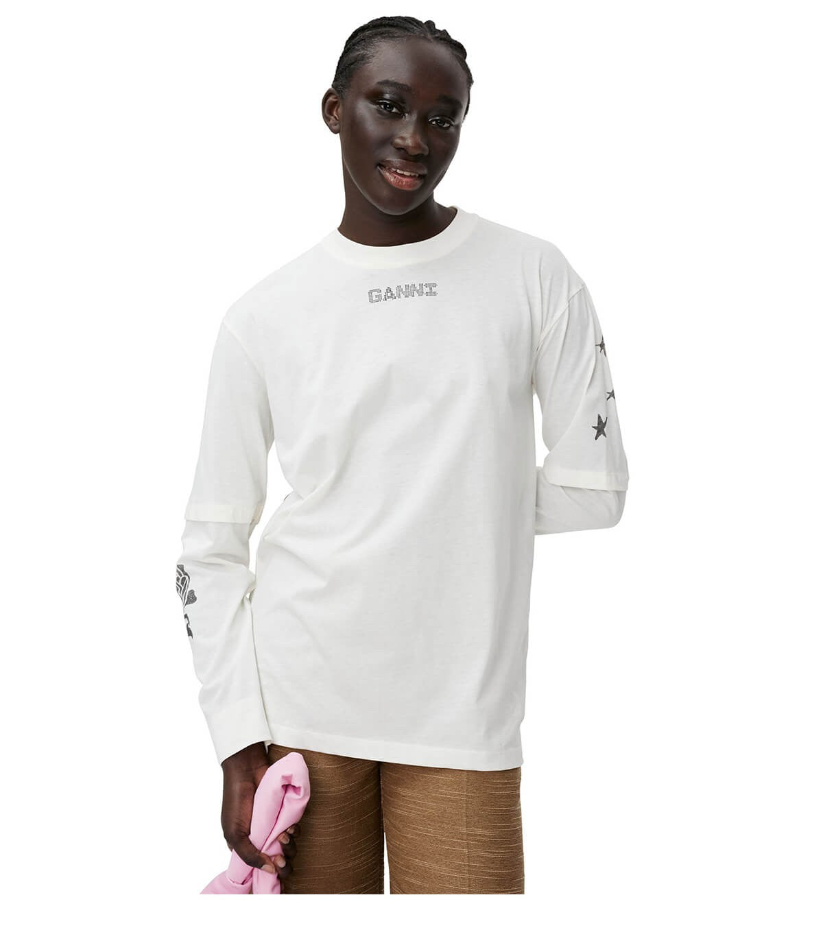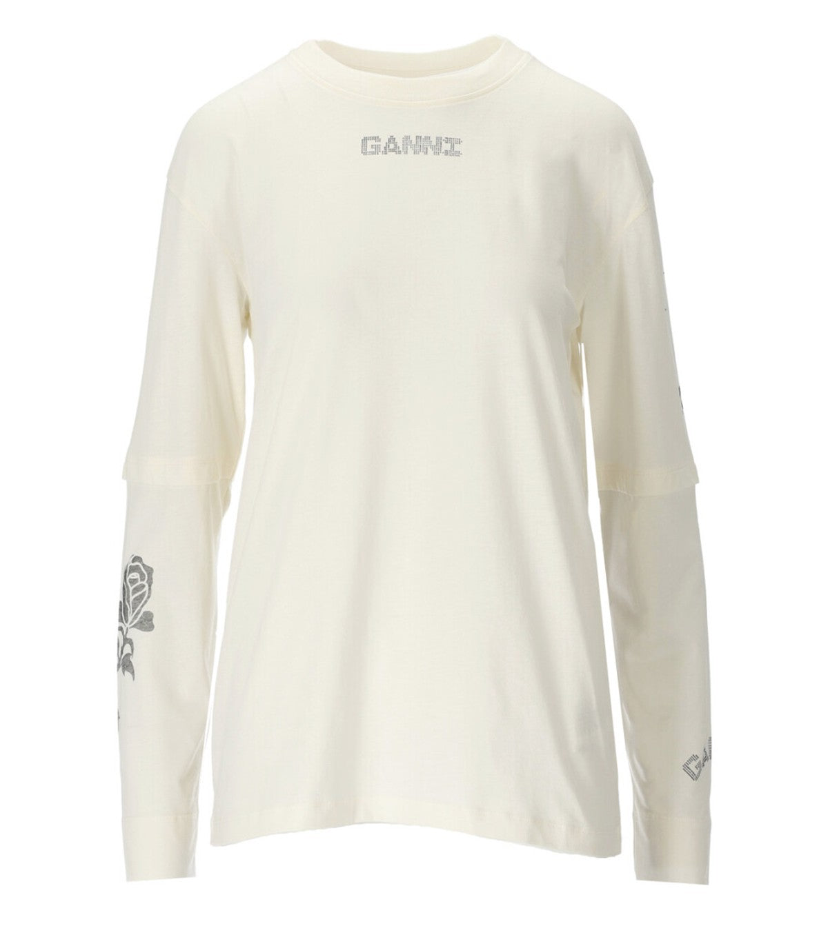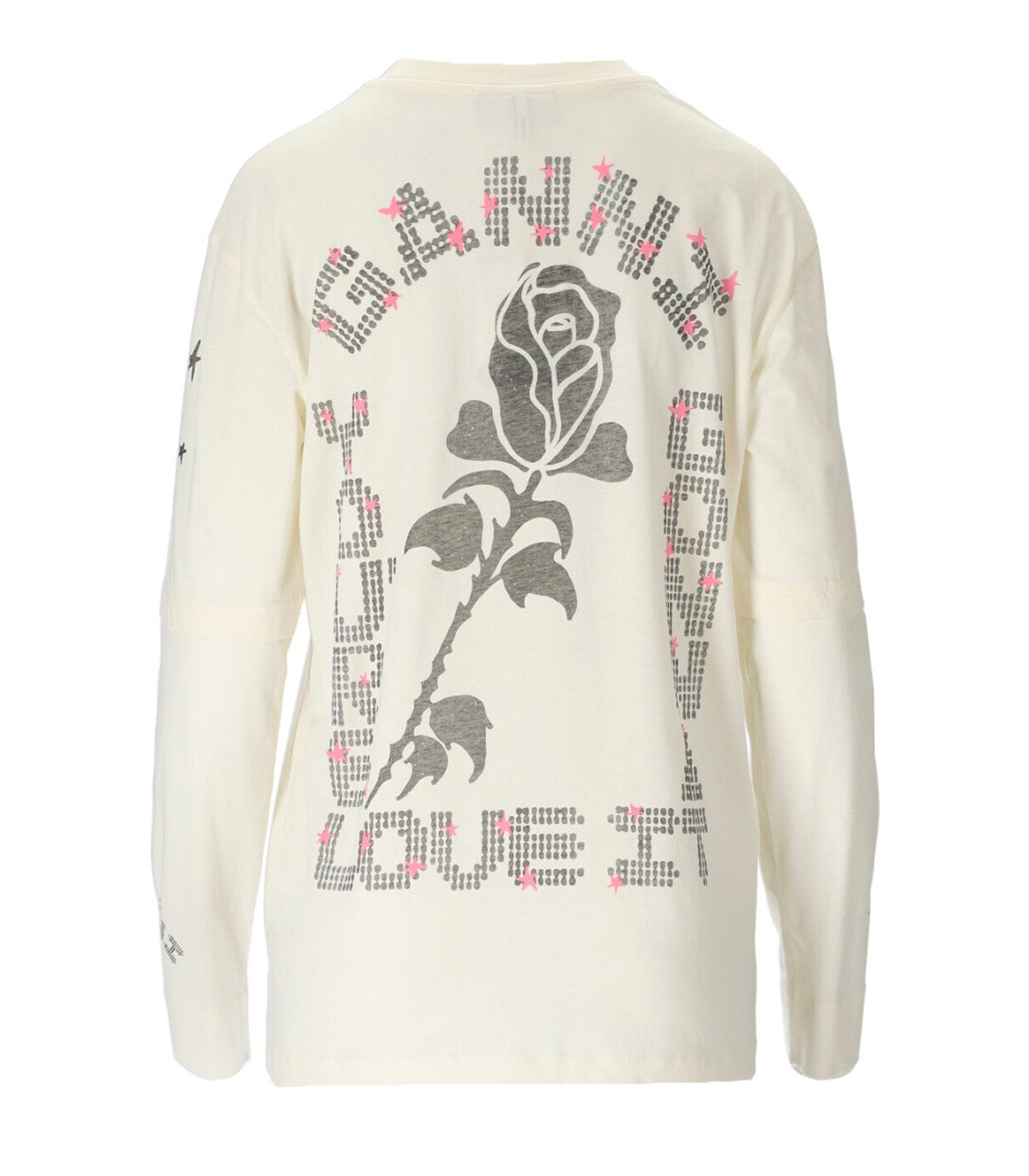 T-shirt di Ganni CreWneck in cotone organico color crema con stampe a logo contrastanti. Vestibilità morbida. Il modello è alto 177 cm e indossa dimensioni S.