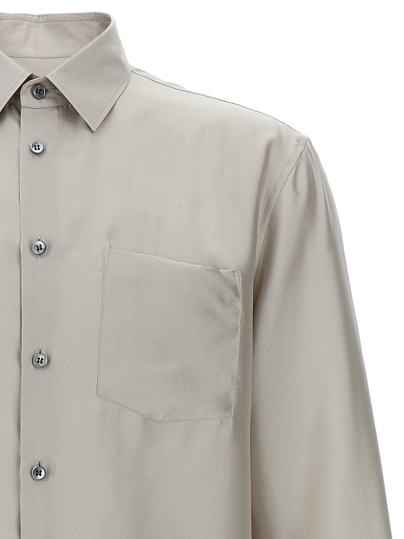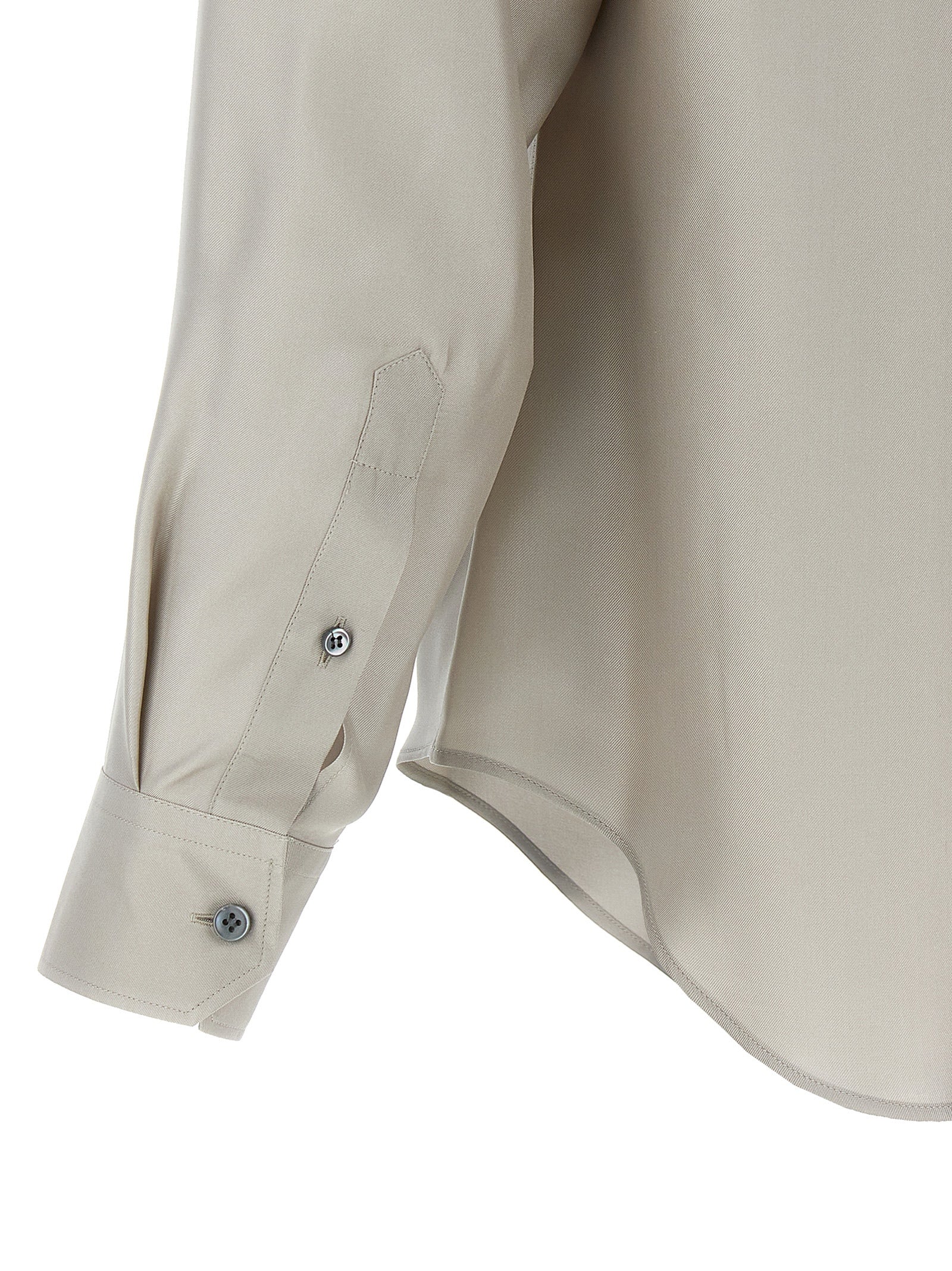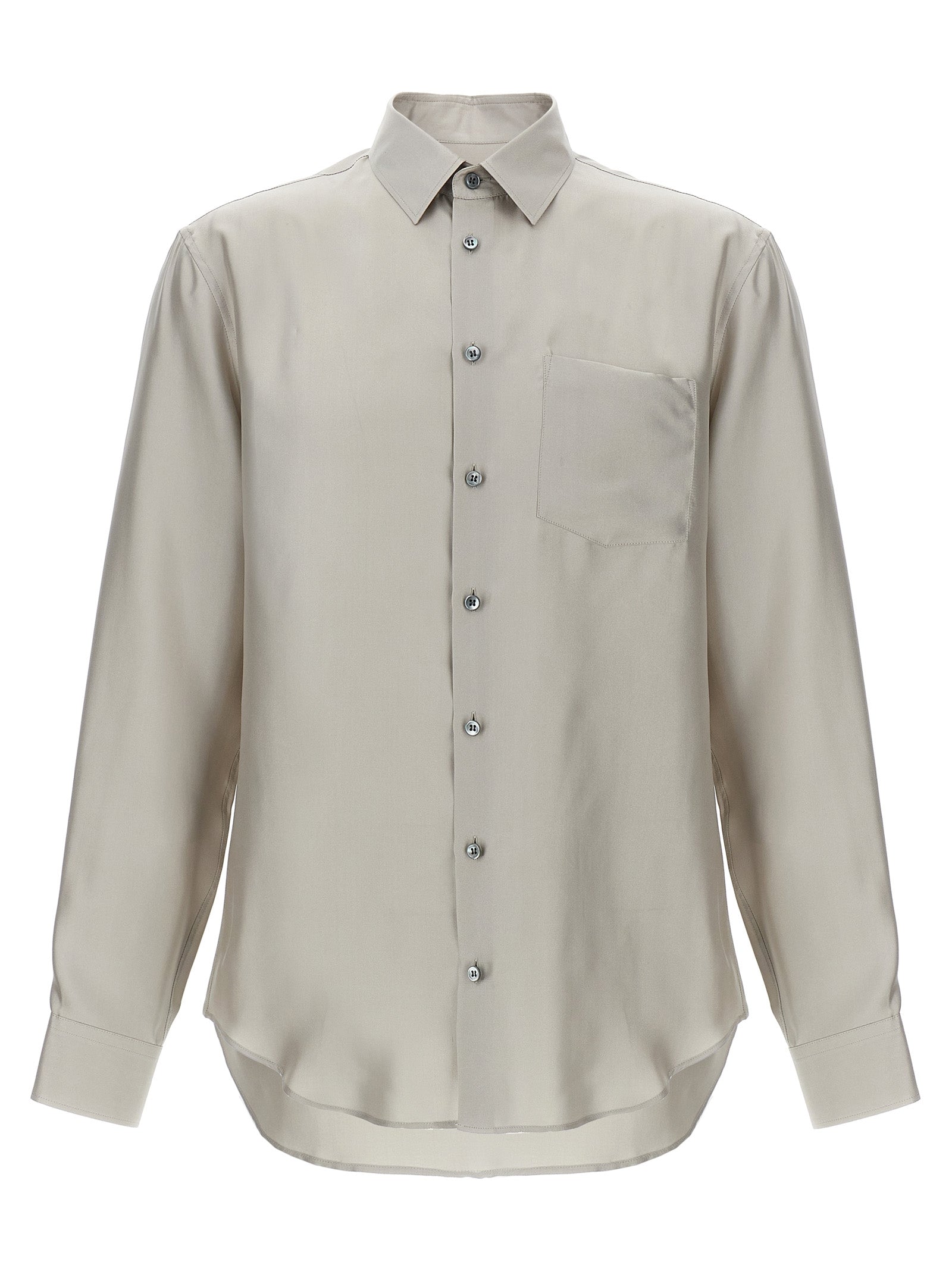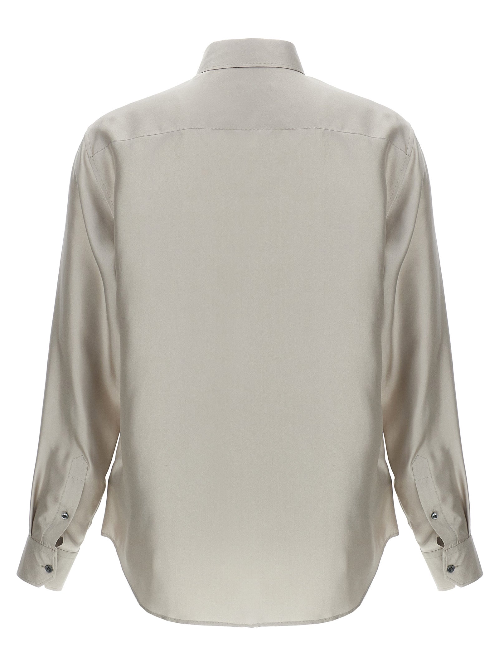 Camicia di seta, tasca anteriore, chiusura dei bottoni, maniche confuse lunghe.