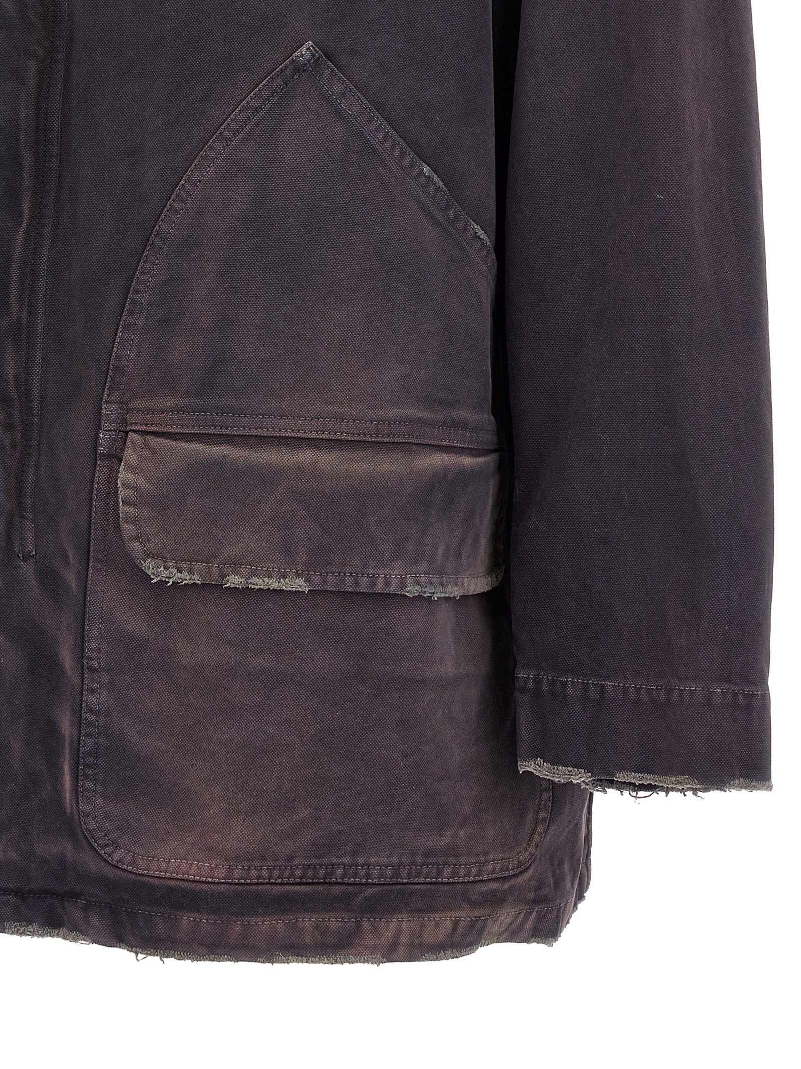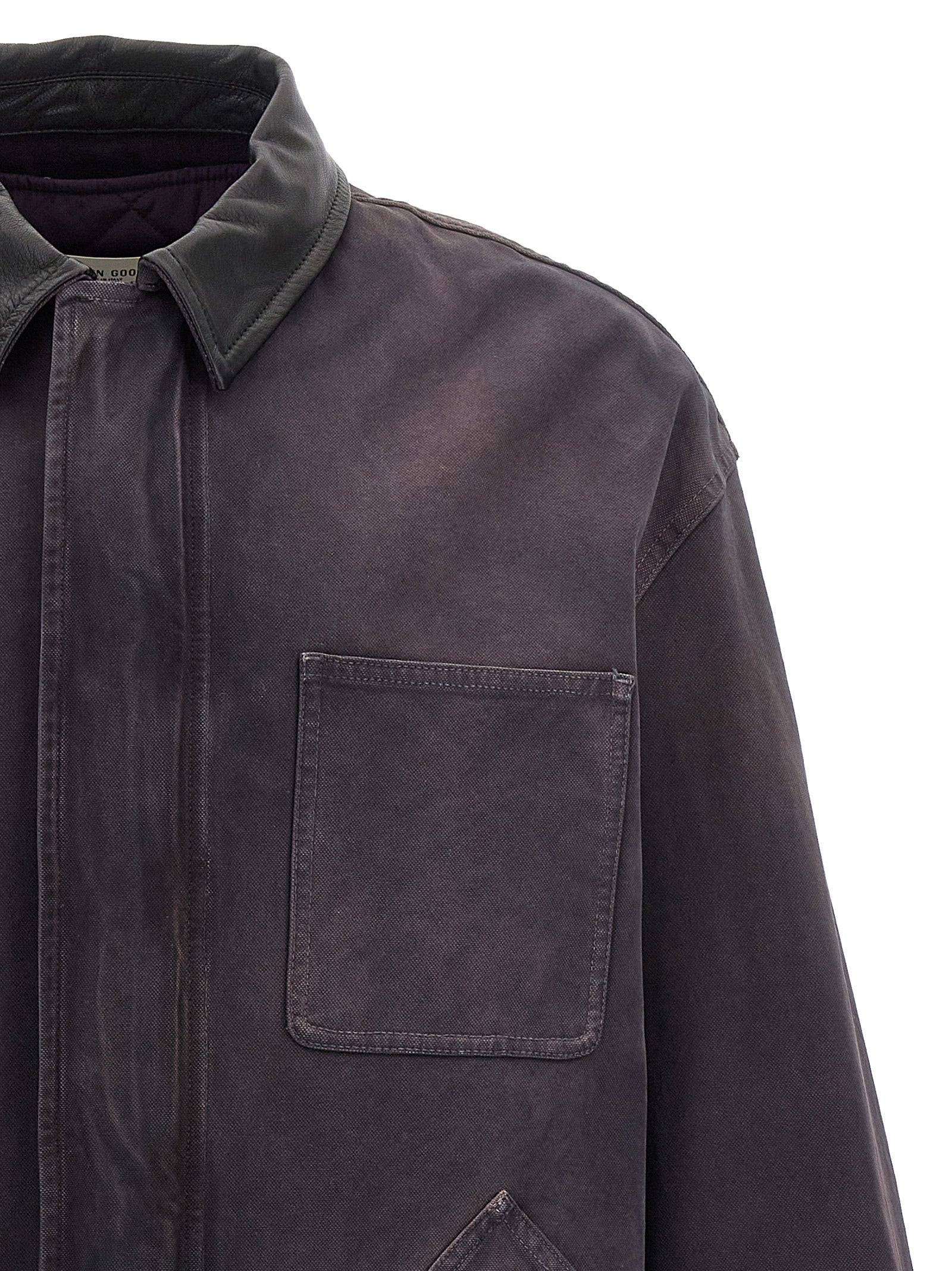 Giacca di Newton in denim in cotone a effetto usato con dettagli in difficoltà, colletto in pelle vintage, chiusura a zip e bottoni a scatto, tasche, maniche lunghe, giubbotto interno leggermente imbottito.