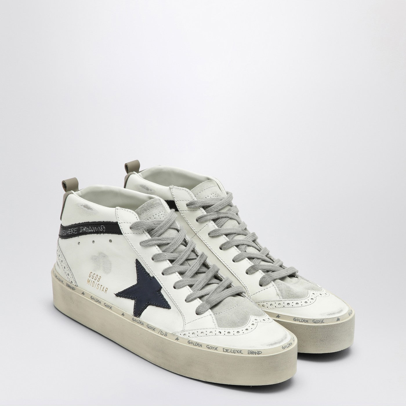 Sneaker di Golden Goose in pelle bianca con pannelli in pelle scamosciata grigia, fissaggio allacciato, toppa a stella in pelle blu sul lato, iscrizione a logo sul lato, punta rotonda perforata, stampa logo sul tallone, lavoro di lavoro vintage e suola in gomma.