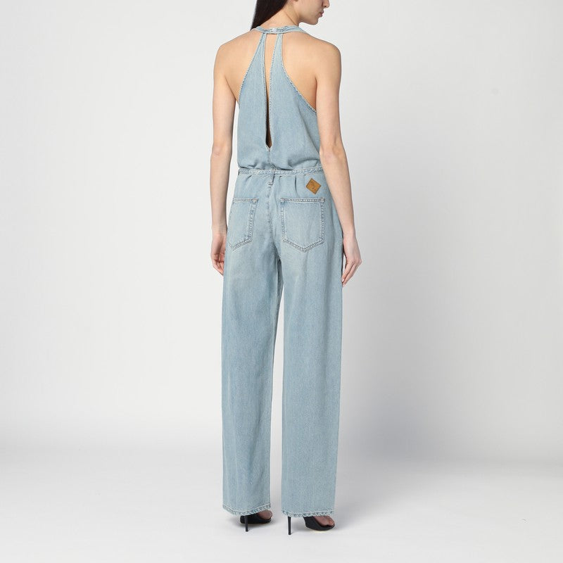 Salto in cotone in denim in azzurro, caratterizzata da una cintura in vita regolabile, back-a vaga a V, tasche Welt a due laterali, due tasche applicate sul retro, patch di logo posteriore, ritagli di fondo e pulsanti a scatto sul retro.
