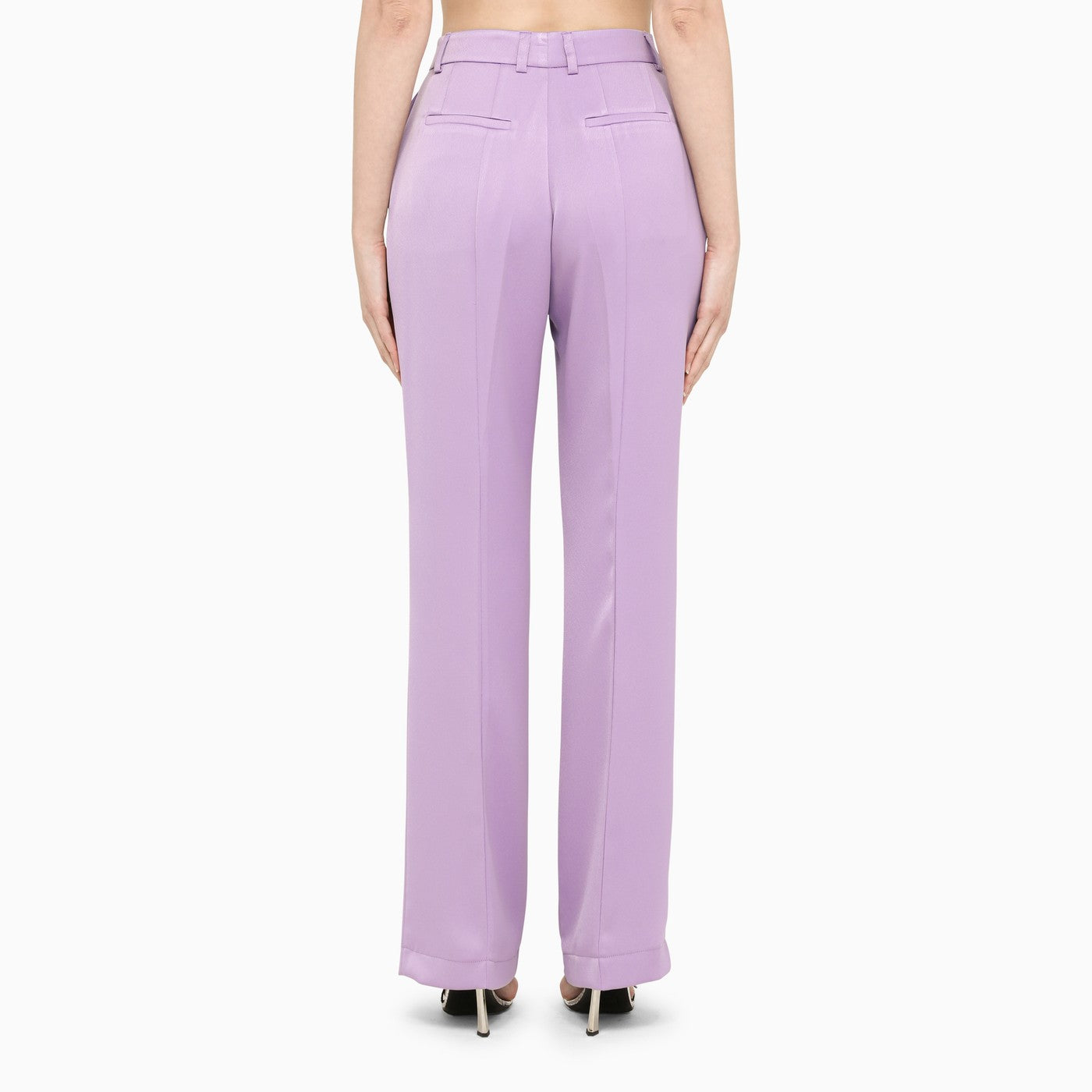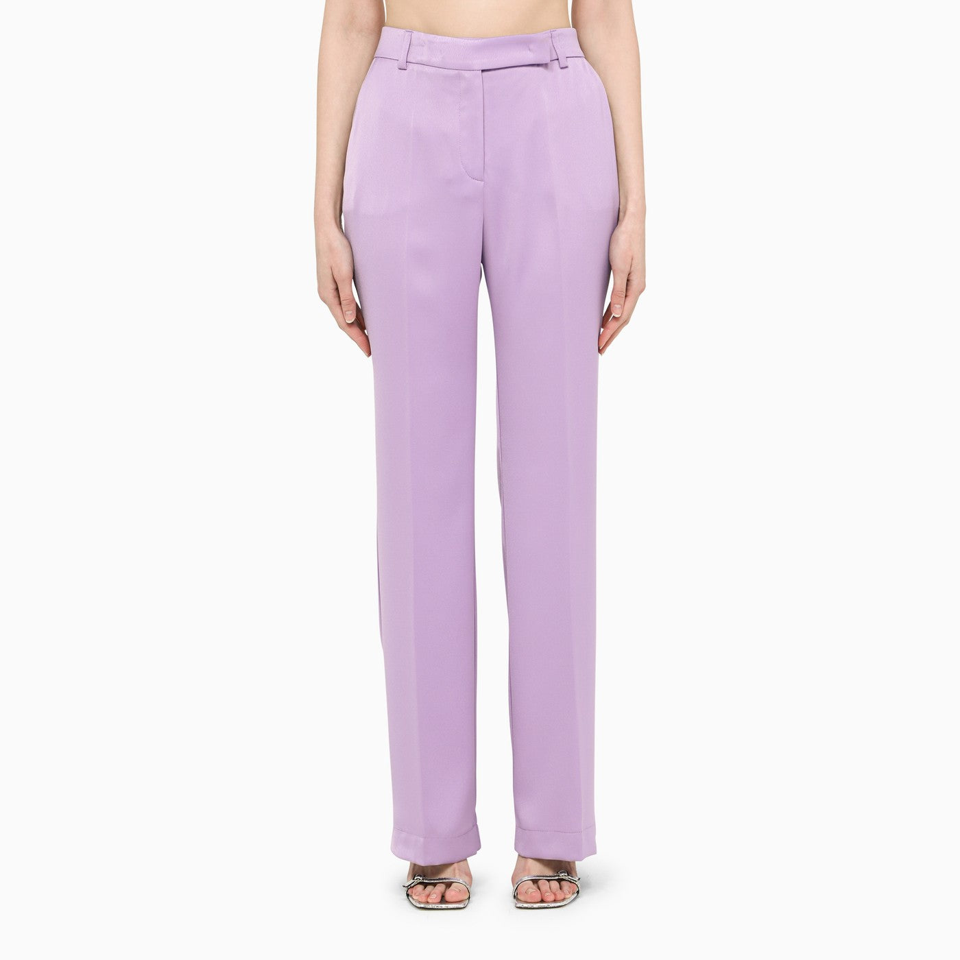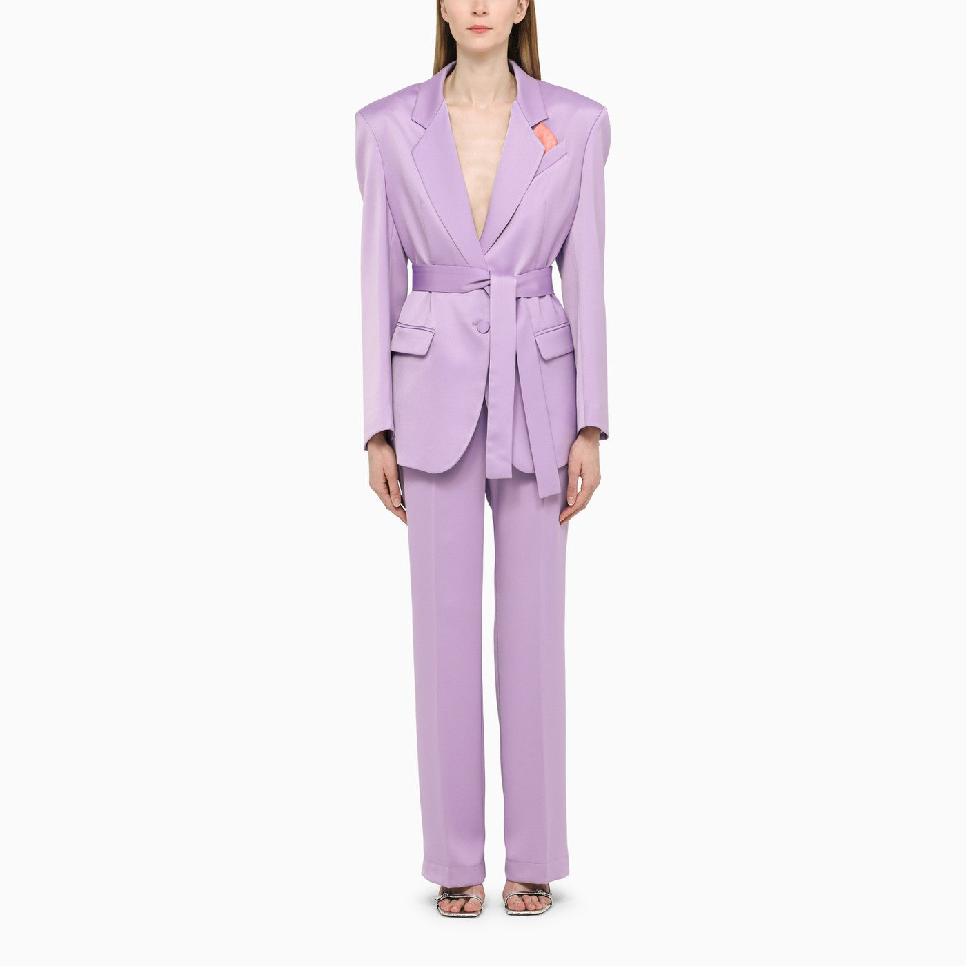 Studio di Lilac Satin Hebe HEBE con giacca con epaulette imbottite e cintura in vita, tasca del seno, due tasche a flap anteriori e polsini abbottonati. Abbinamento di pantaloni normali a vita alta con fissaggio nascosto, cicli a cinghia, due tasche a soffietto e tasche Welt sul retro.