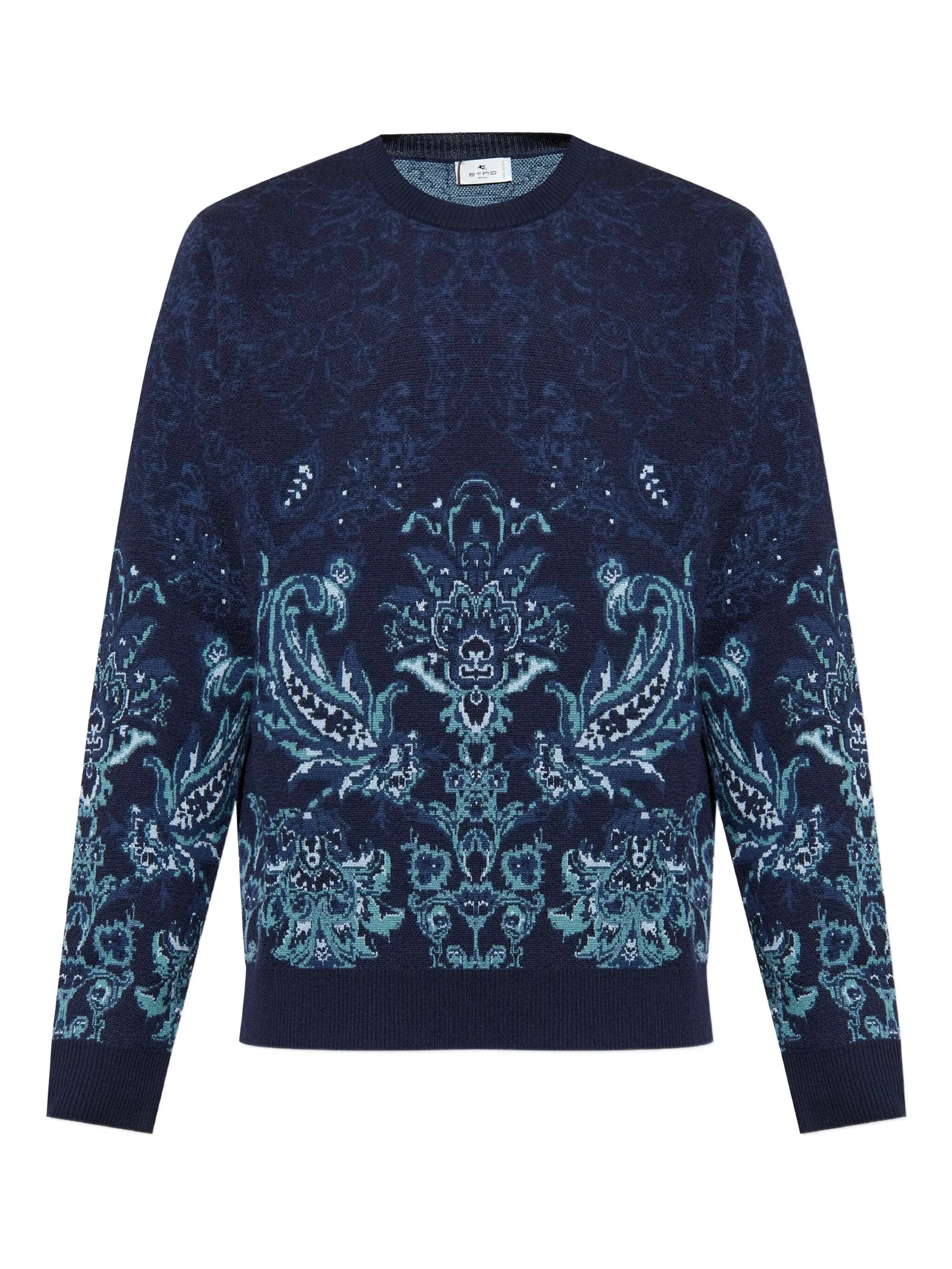 Maglione jacquard ETRO in pura lana, realizzato in Italia. Design floreale su base blu navy, con girocollo, maniche lunghe e finiture a costine. Morbido, caldo e sofisticato: perfetto per distinguersi con eleganza.