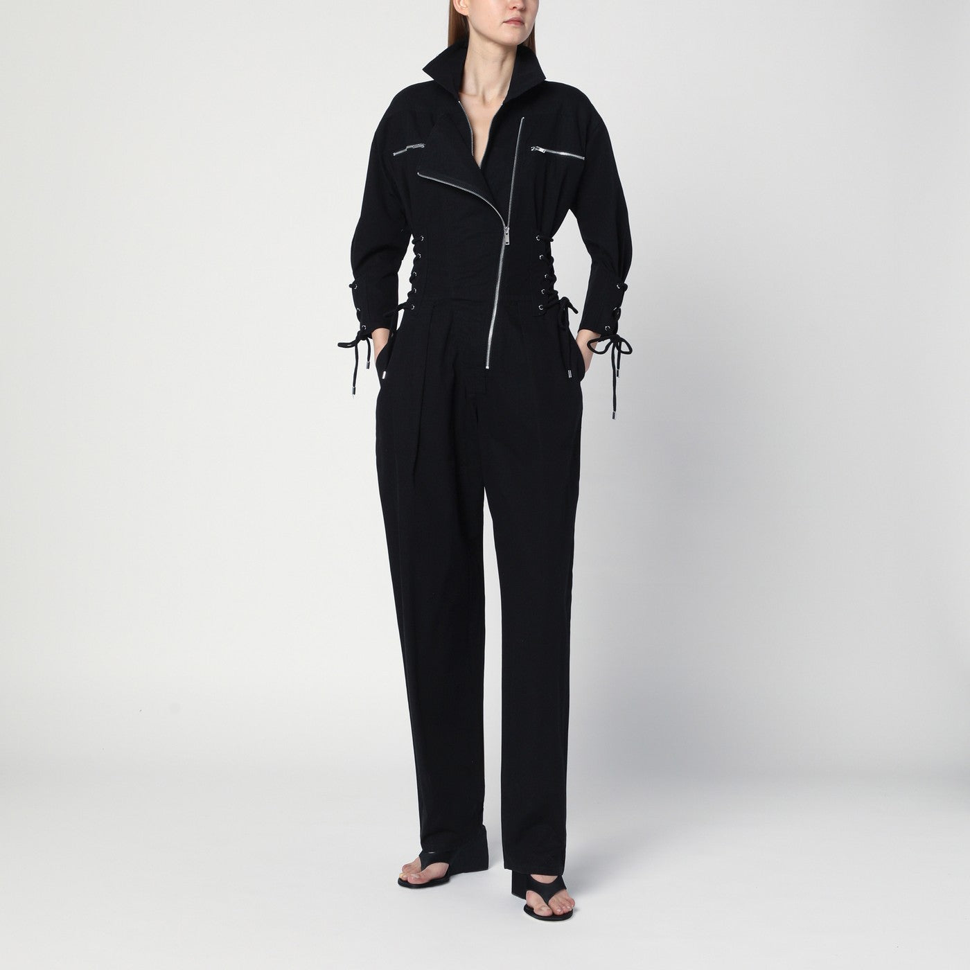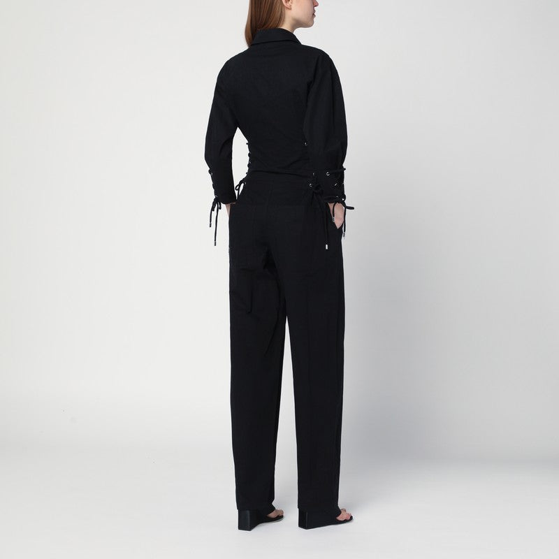Black cotton jumpsuit by Isabel Marant, characterized by details with laces and eyelets, shirt collar, asymmetric visible zip closures at the front, zip chest pockets, three-quarter sleeves with ties at the bottom, pleating at the front and two back pockets.