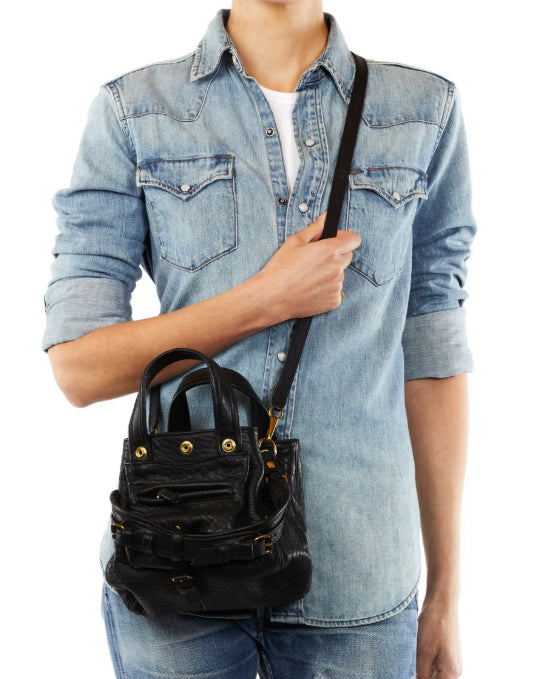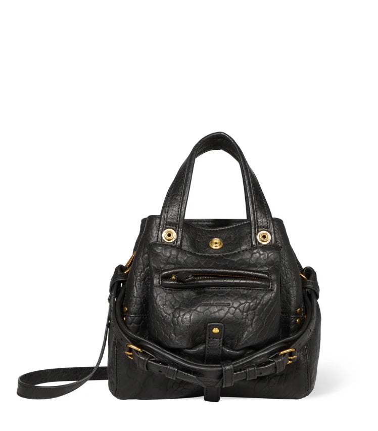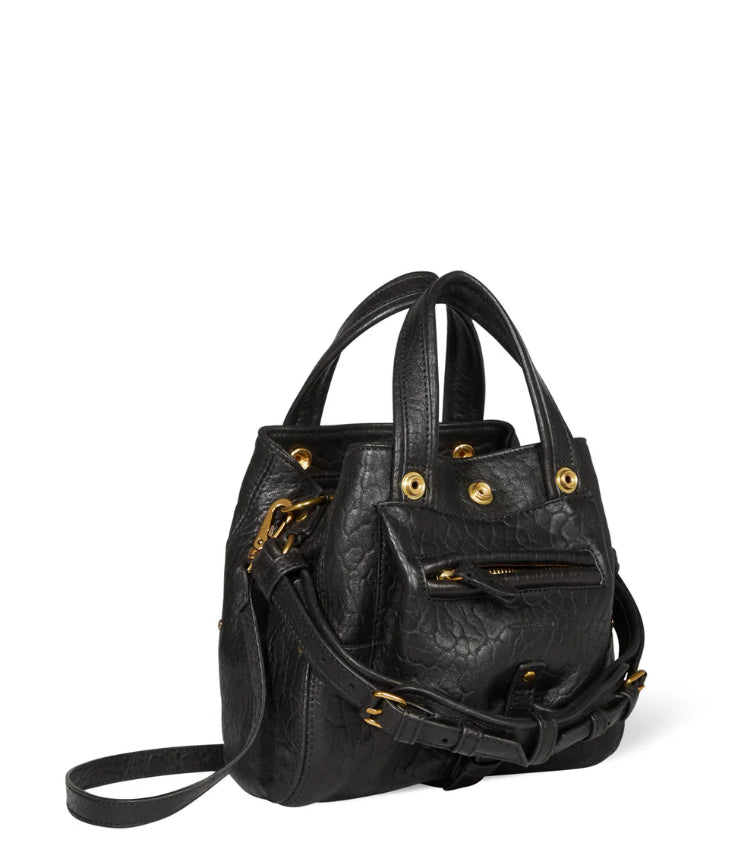 Due maniglie in pelle sulla parte superiore della borsa, altezza 9 cm. Una tracolla in pelle rimovibile e regolabile di 130 cm massimo. Una tasca esterna zippata sulla parte anteriore della borsa. Una tasca interna. Un anello chiave all'interno della borsa.
