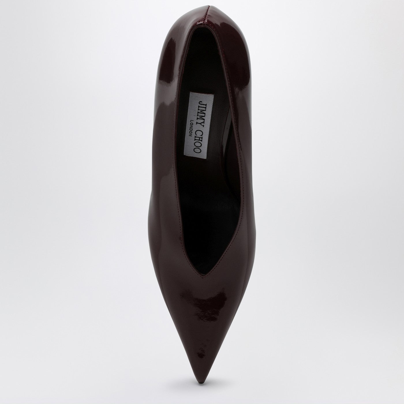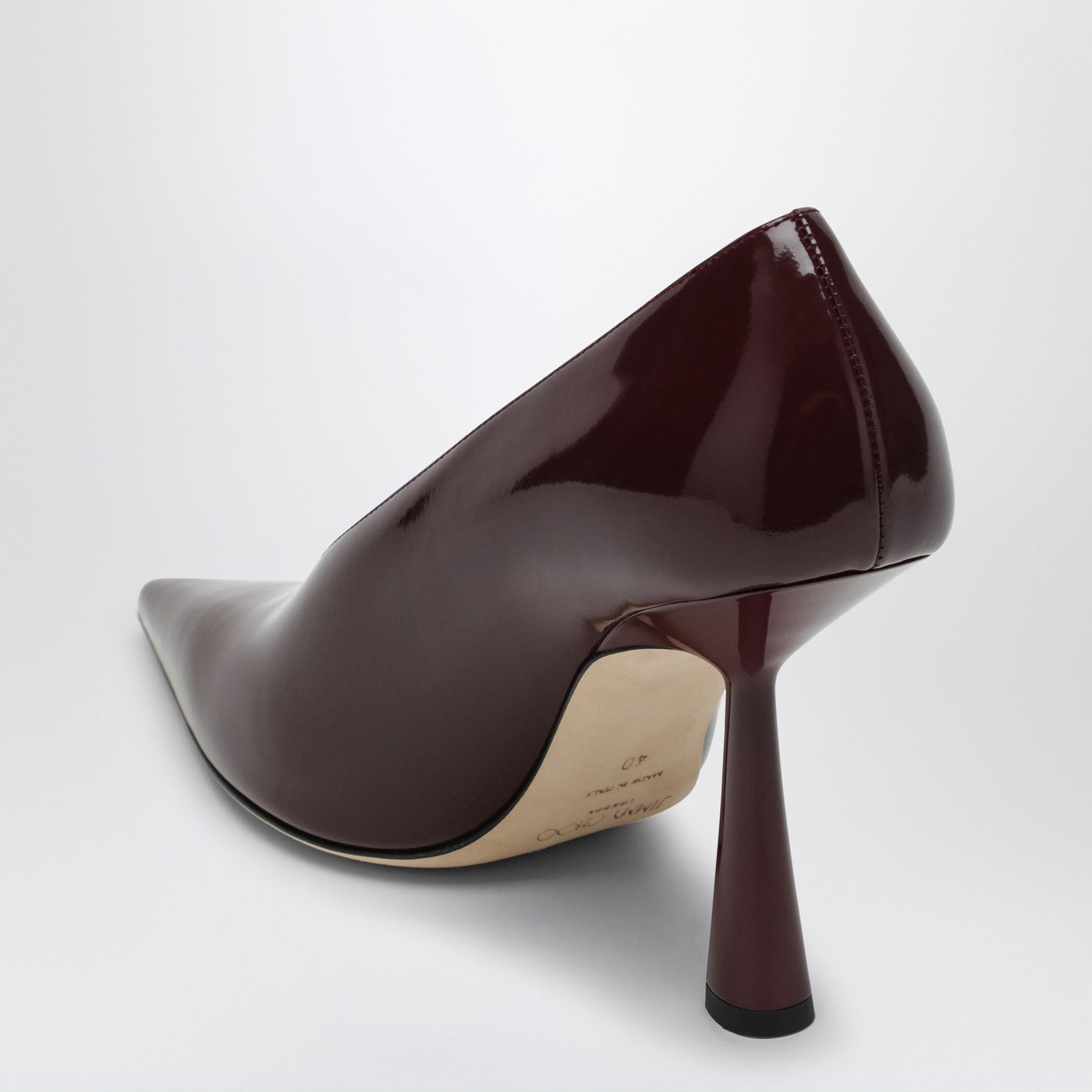 Pompa in pelle di brevetto bordeaux di Jimmy Choo con un design appuntito, un tallone alto e una suola in pelle.