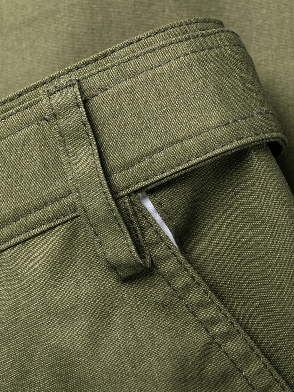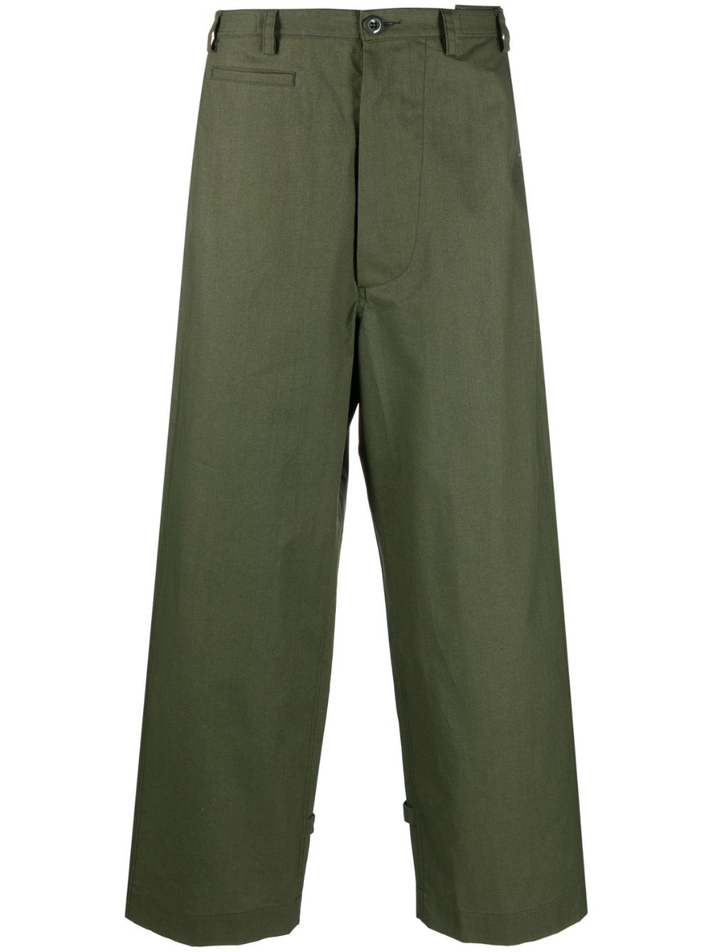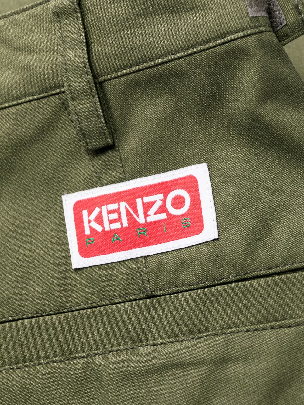 mid-rise wide-leg cotton trousers from KENZO featuring khaki, cotton, mid-rise, belt loops, logo patch to the rear, concealed fly and button fastening, front welt pocket, two side inset pockets, two rear welt pockets and wide leg.