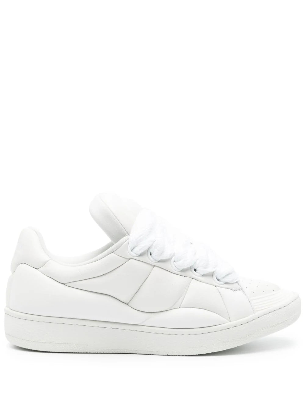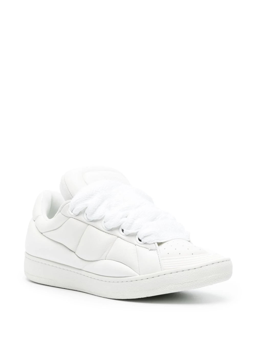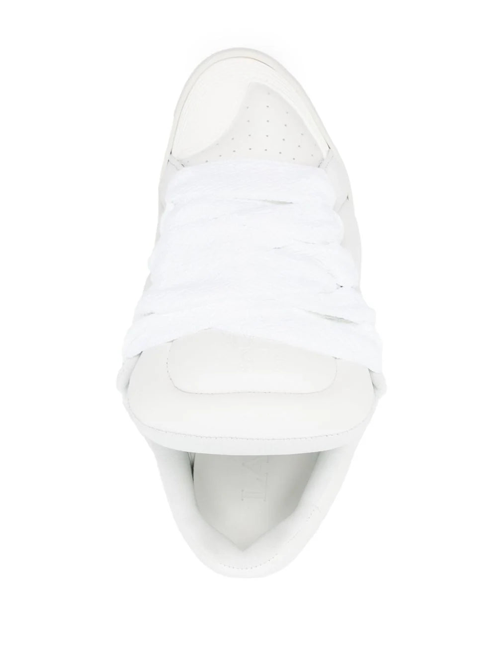 Bianco, pelle di vitello, inserimento di design, punta perforata, lingua con logo in rilievo, logo sul tallone, punta rotonda, chiusura del pizzo anteriore, sola logo e suola in gomma piatta.