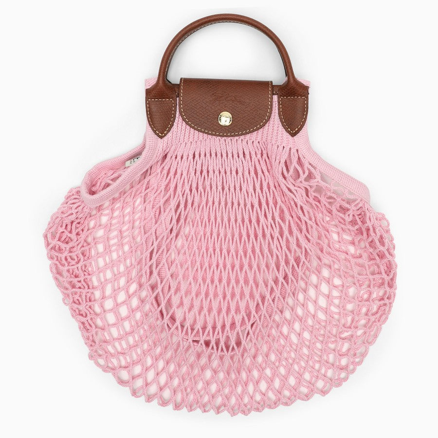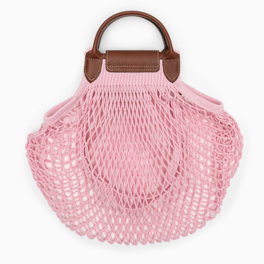 Grande borsa a tracolla di Longchamp in tela rosa realizzata con lavorazione a maglia aperta e pelle marrone, con logo in rilievo sul davanti, contrasto, cuciture, fissaggio anteriore-box-stud, due maniglie top arrotondate e spalla singola.