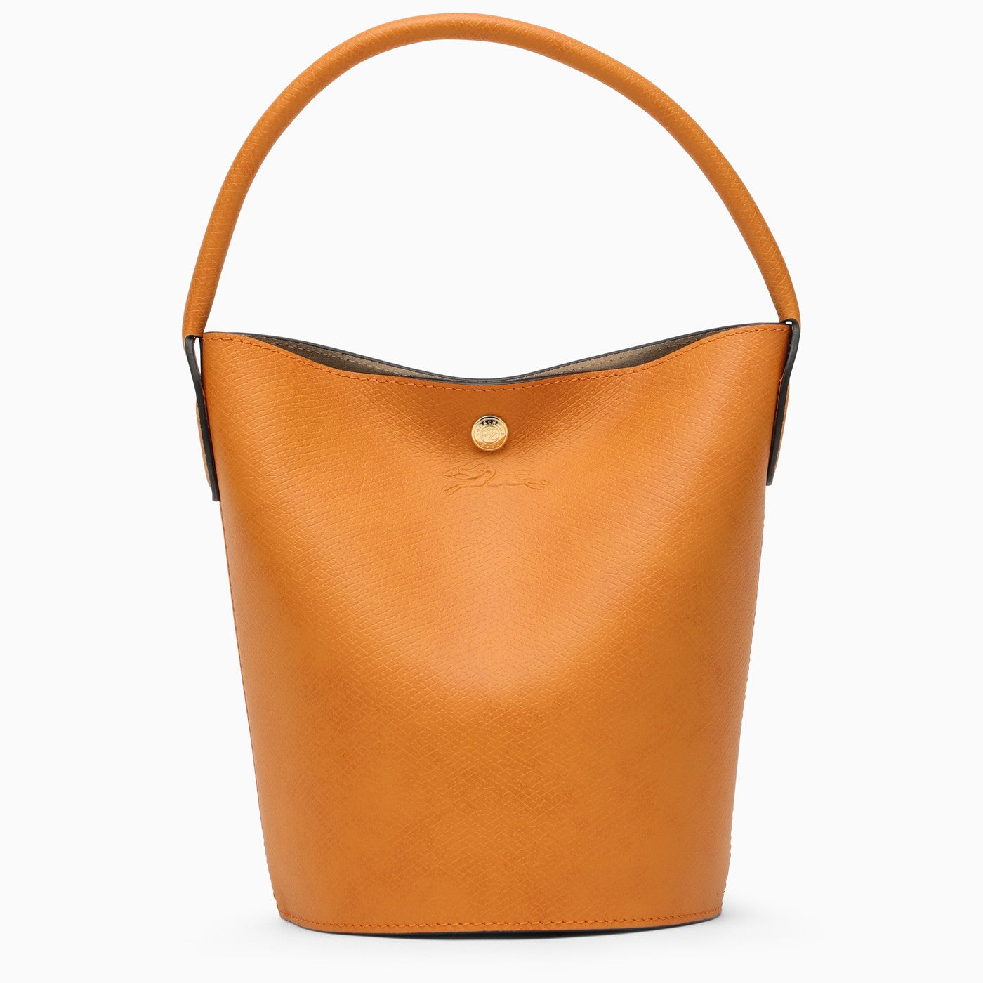 Borsa per secchio in pelle color albicocche di Longchamp con chiusura a stallone, inserti dorati e tasca piatta interna.