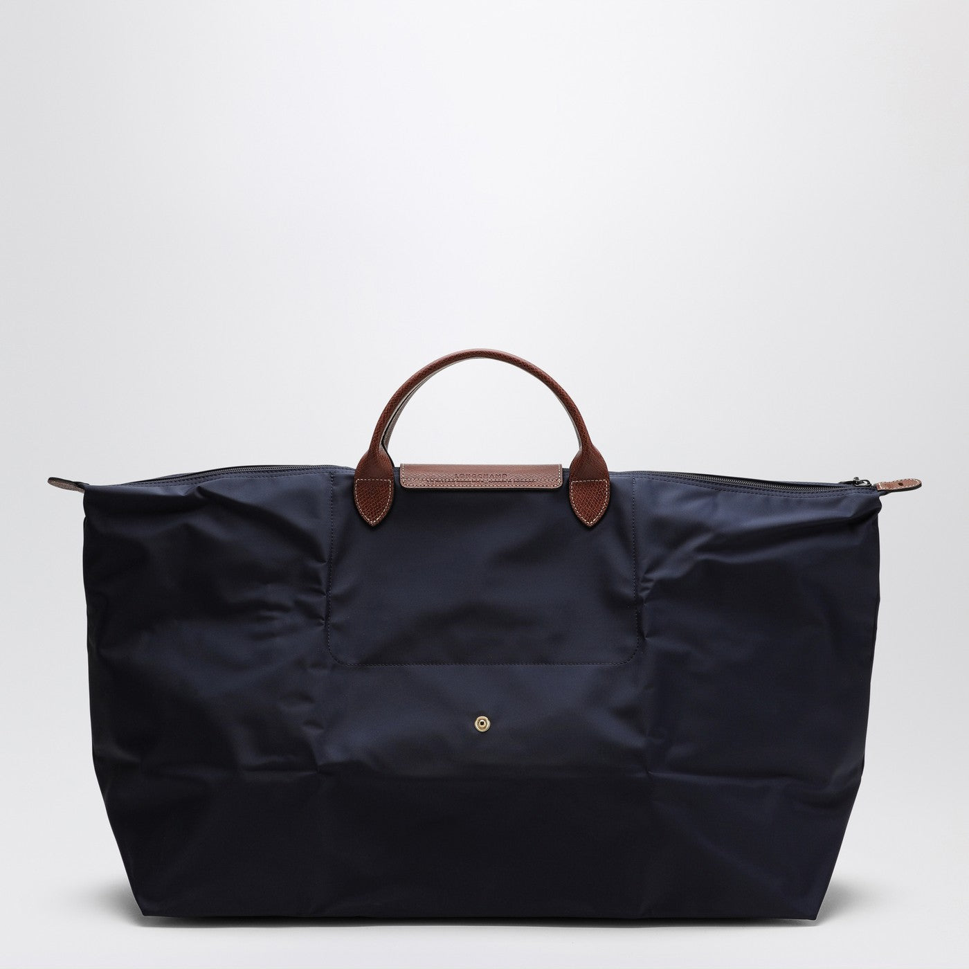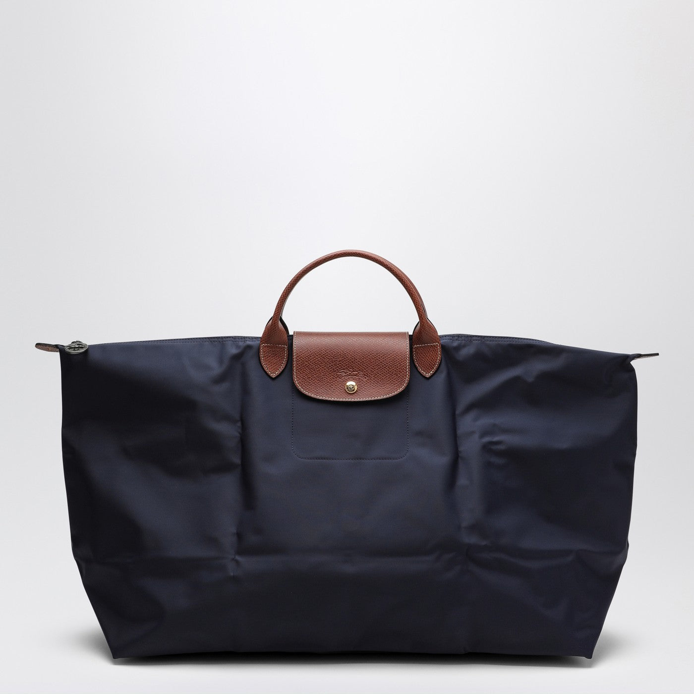 Borsa da viaggio in tela in poliammide riciclata blu da Longchamp con dettagli in pelle marrone, due maniglie superiori, pulsante a scatto e fissaggio con zip e due tasche piatte interne. Modello pieghevole.