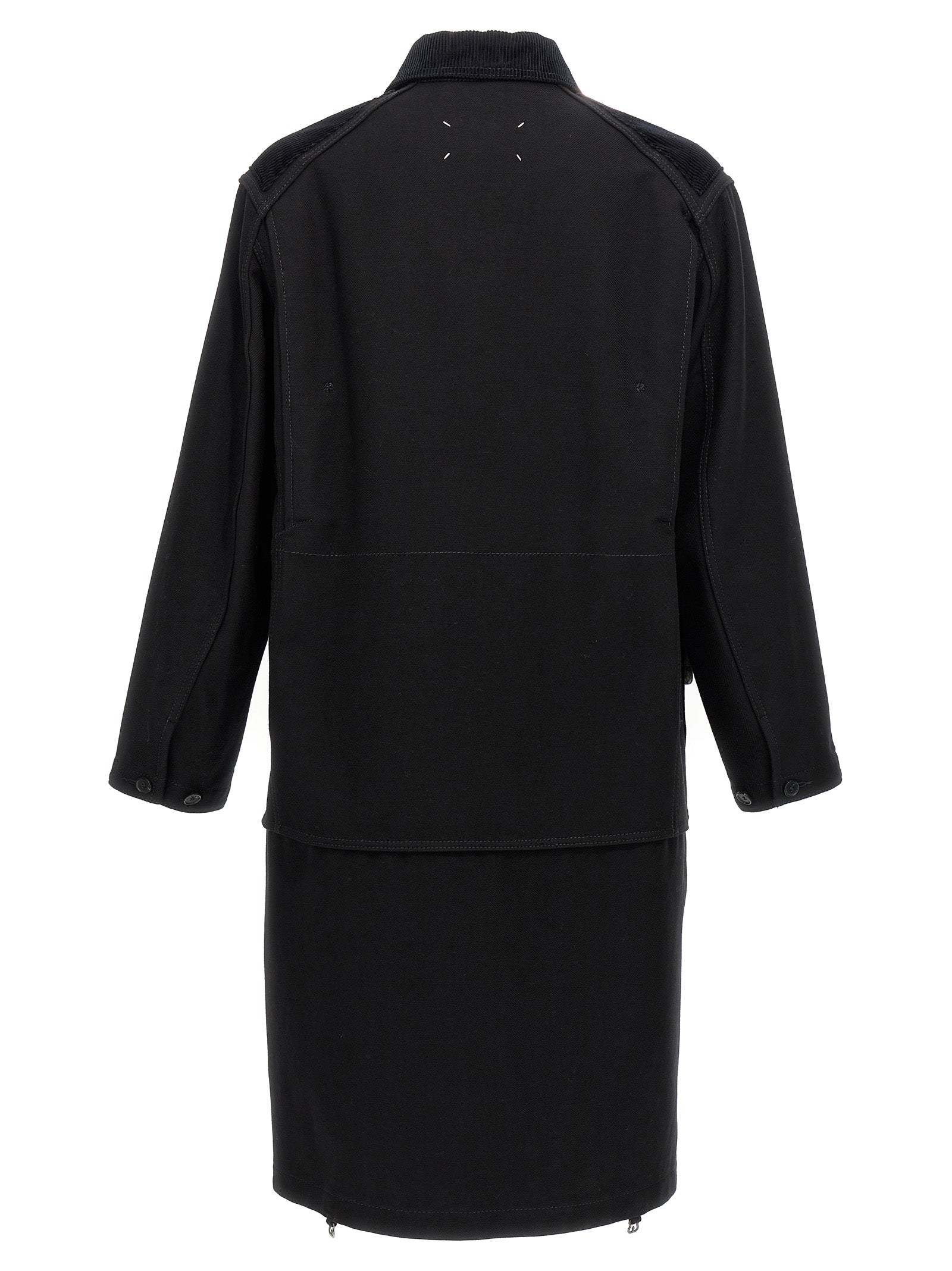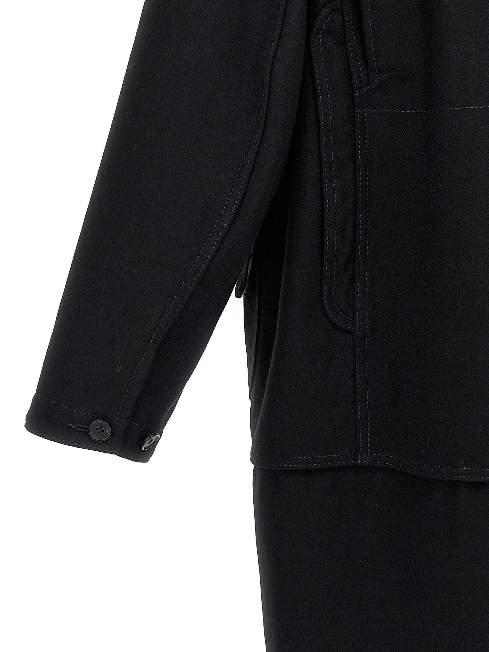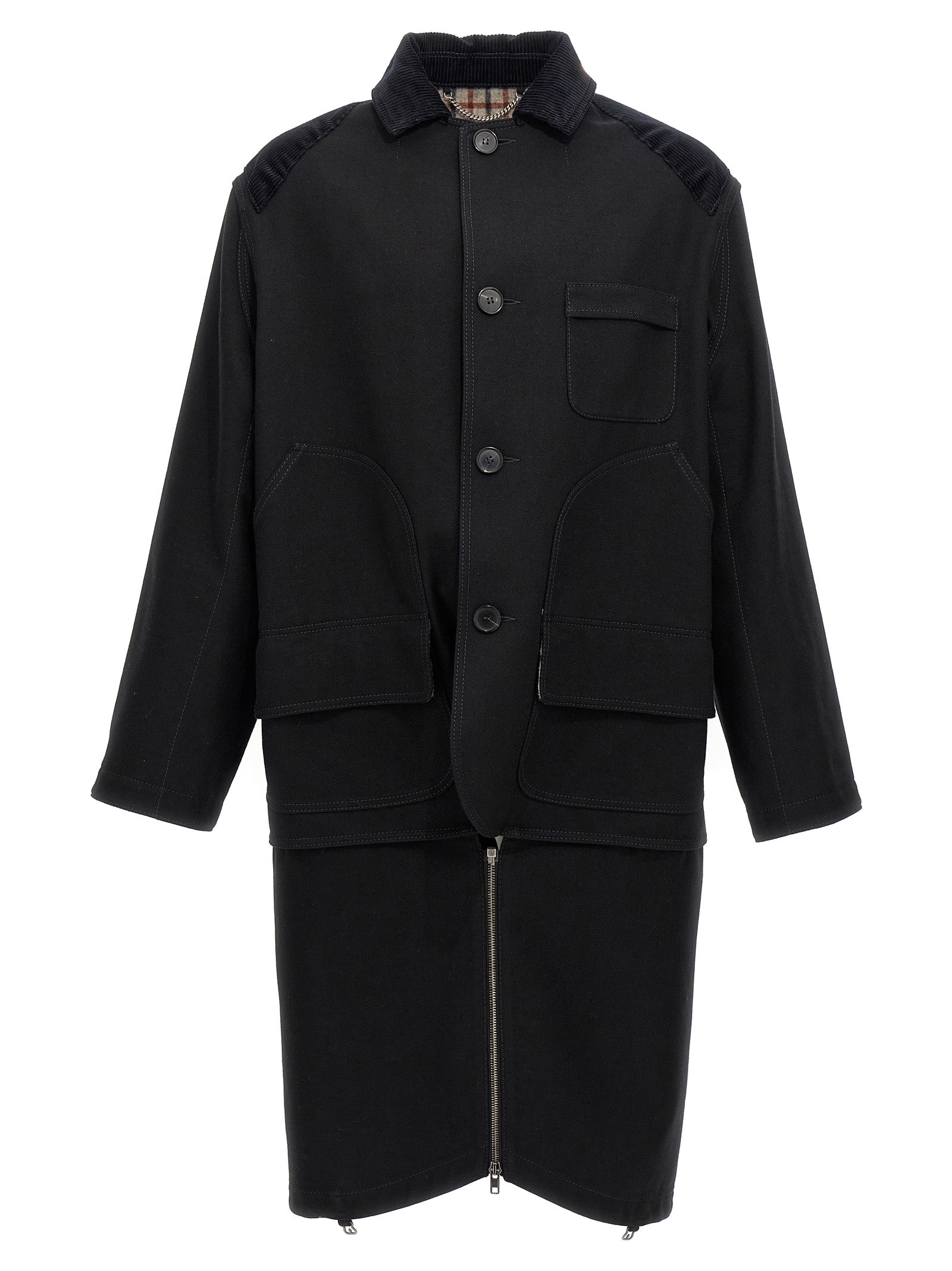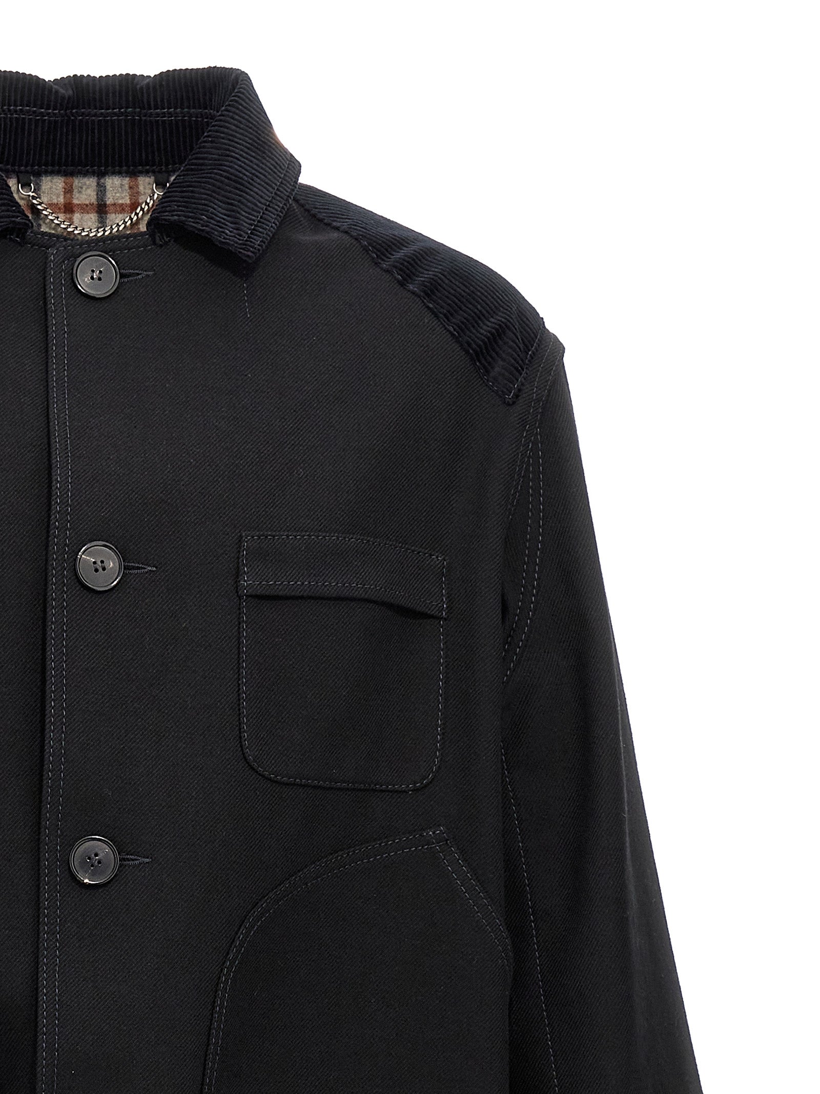 Lana a petto singolo e cotone di cotone, pulsante e chiusura a zip, tasche, maniche lunghe, inserti in velluto a coste.