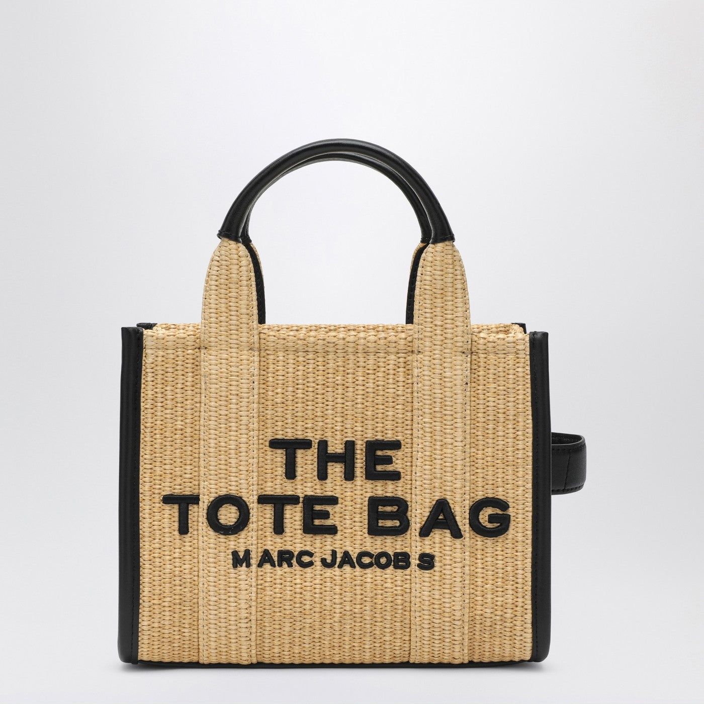 Piccola borsa a mano di Marc Jacobs in Beige Rafia, caratterizzata da due maniglie superiori, chiusura a zip, spalla regolabile e rimovibile, dettagli contrastanti e lettere a logo frontale contrastante.