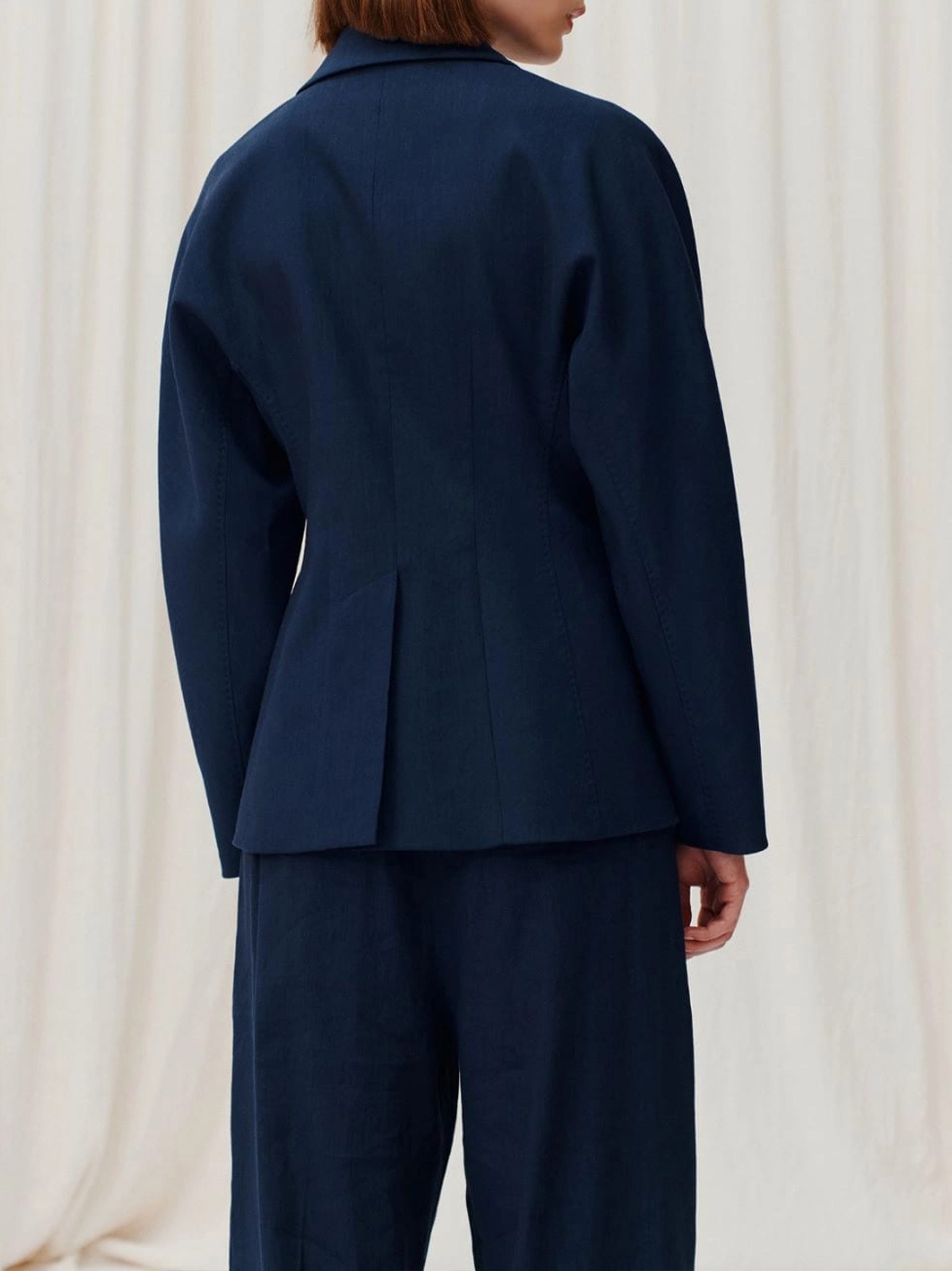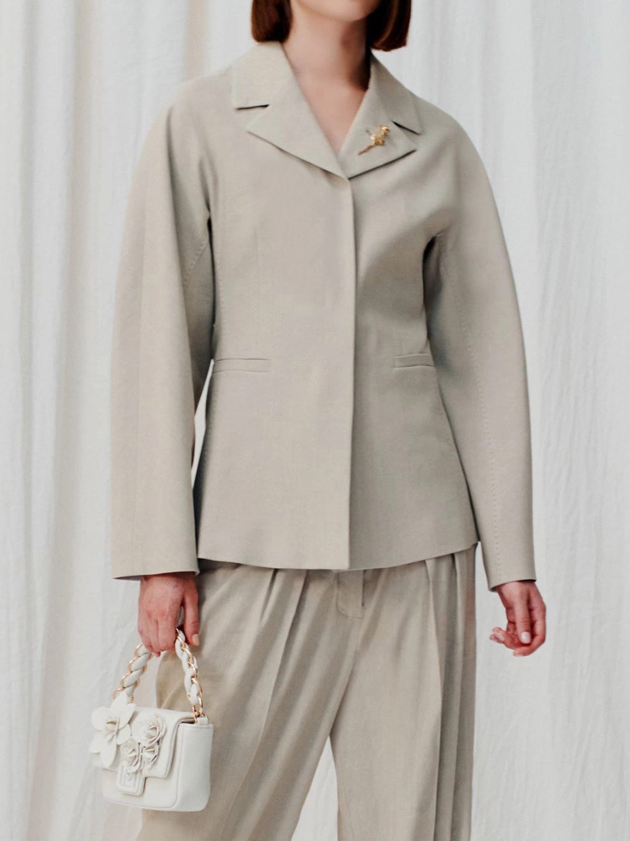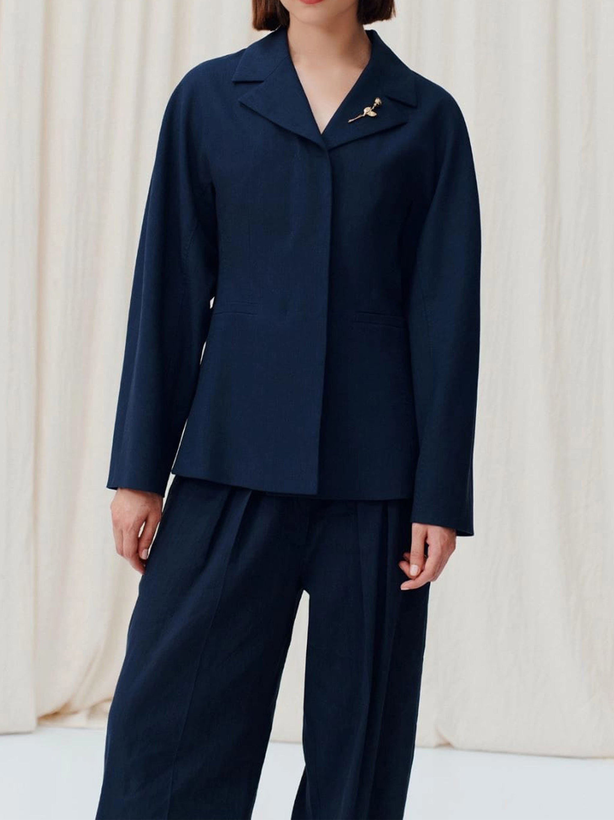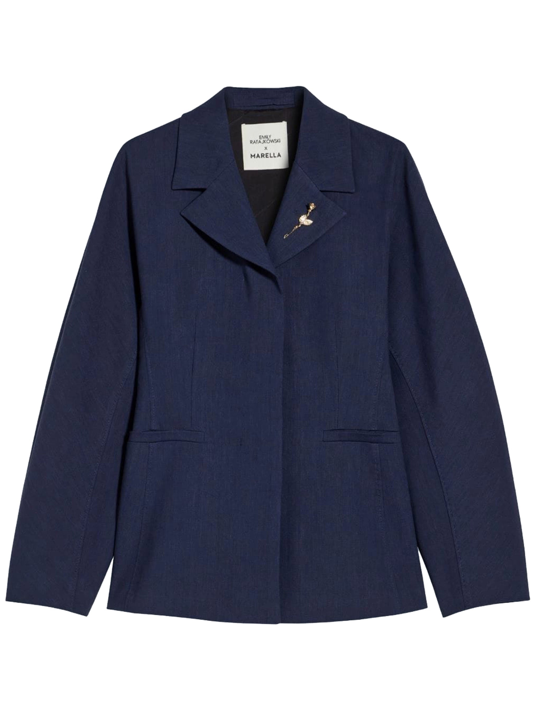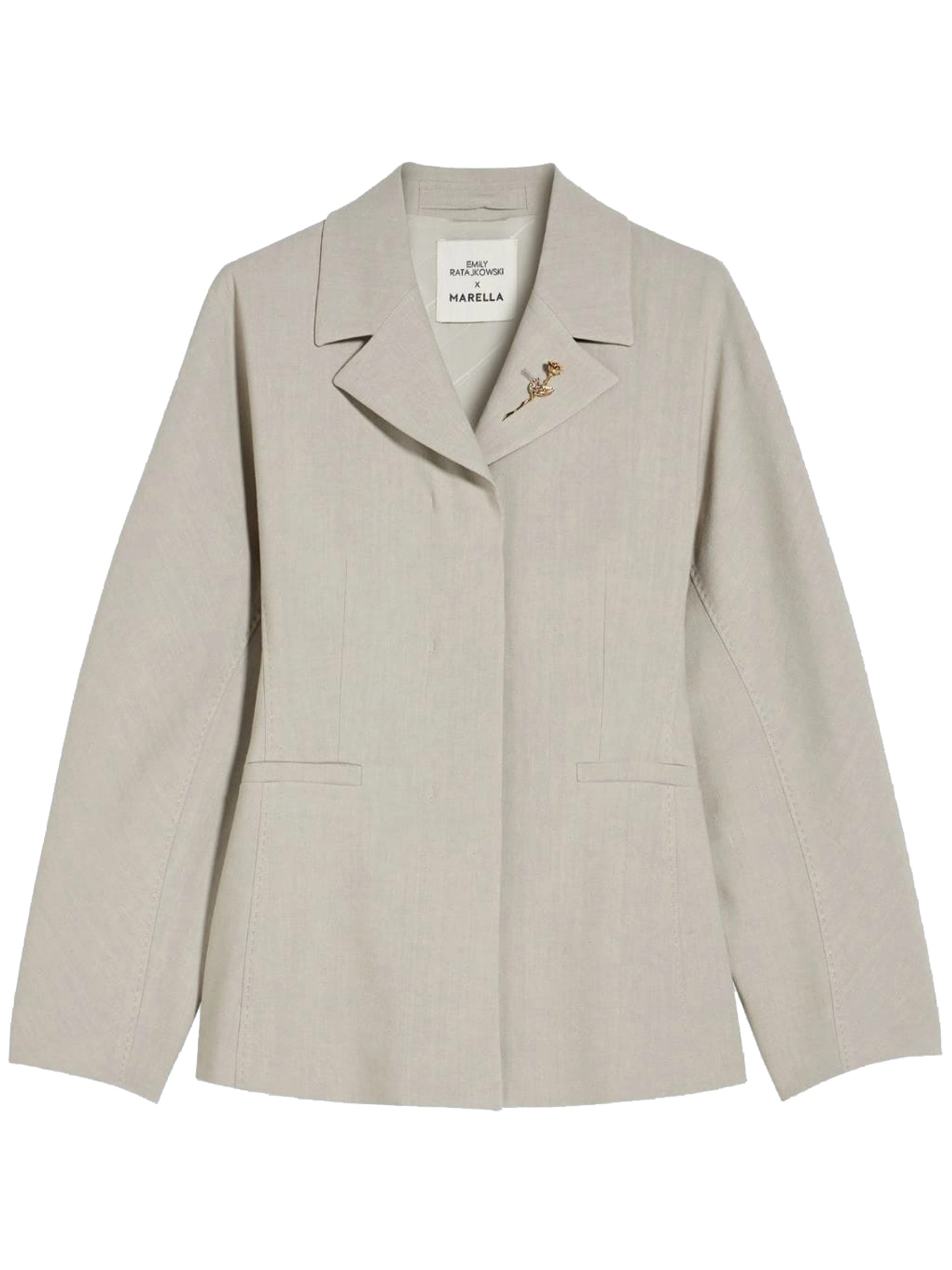 Il blazer rounded di Marella ridefinisce l`eleganza con una silhouette fluida e sofisticata. Realizzato in lino e viscosa stretch, presenta una costruzione a kimono con abbottonatura nascosta e un fit morbido. Il rever essenziale è impreziosito da una spilla dorata a forma di rosa, per un tocco distintivo e raffinato.