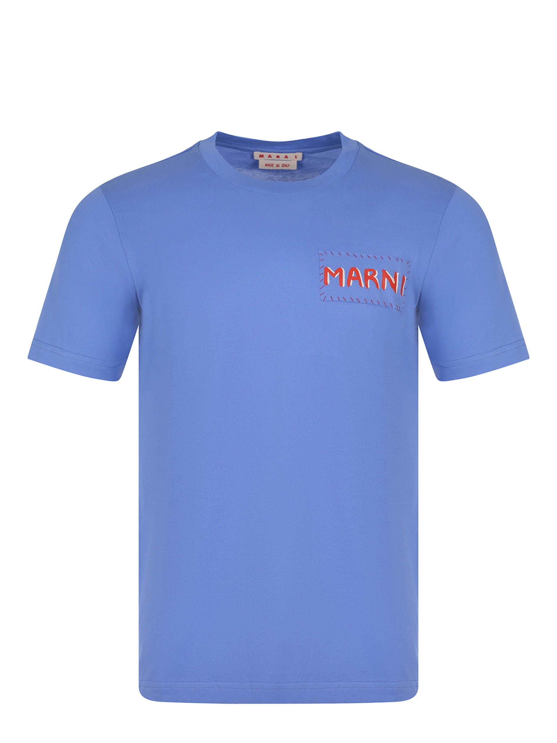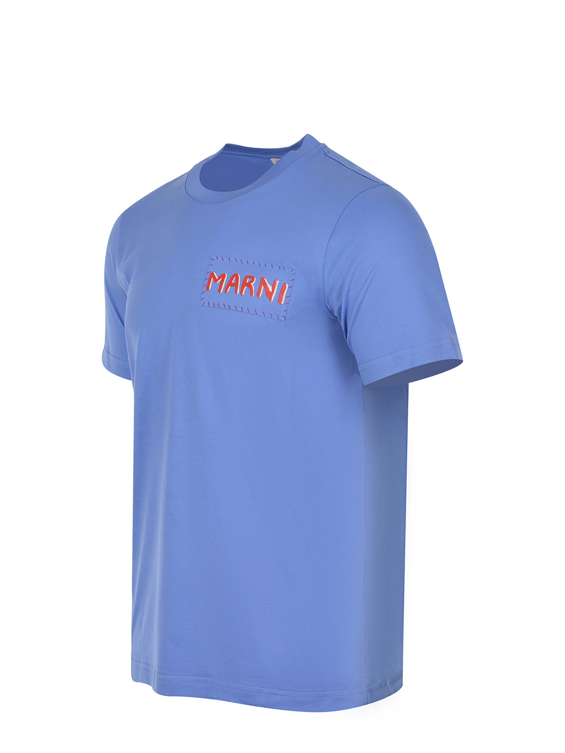 Maglietta Marni fatta di cotone Liliac blu. Maniche corte. Collo dell'equipaggio a coste. Etichetta a mano sul petto con logo stampato a contrasto. 100% di cotone realizzato in Italia