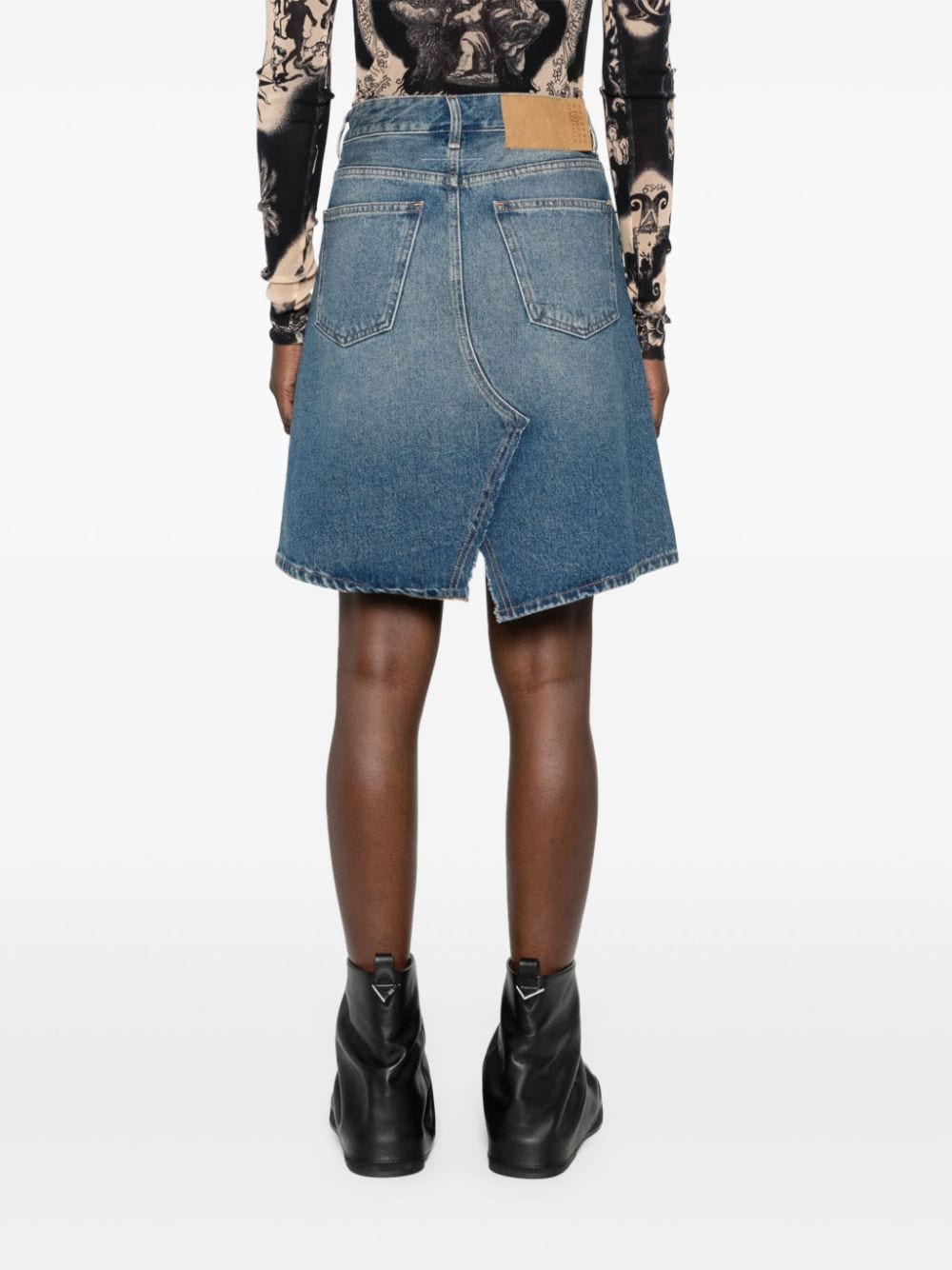 Indaco Blue Cotton Sbianco di denim Lavato a contrasto Cintura di cucitura Canca classiche Classiche tasche a cinque tasche Rivet Effetto di frusta alle cosce Flitta anteriore patch di logo a metà lunghezza sulla fessura posteriore nascosta con zip e fissaggio a bottone