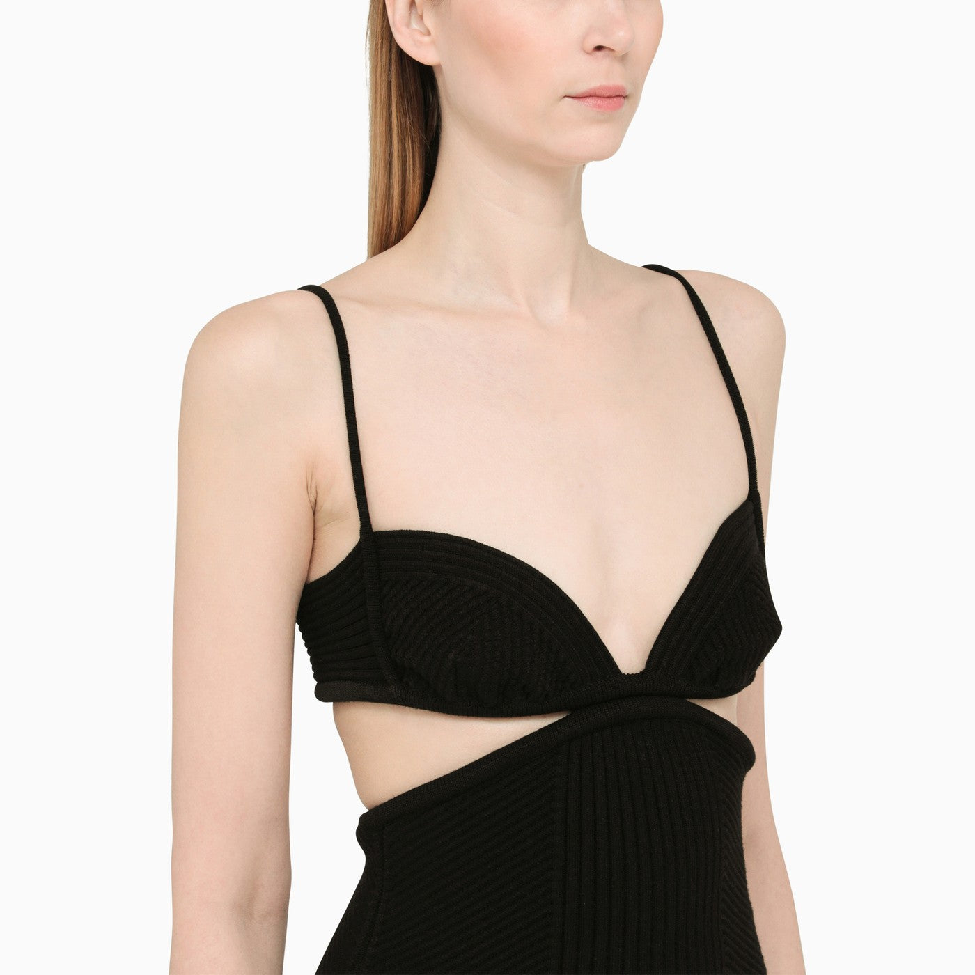 Abito corto nella maglia viscosa nera da bianco sporco con un design a coste, spalline sottili, un dettaglio ritagliato e una vestibilità sottile.