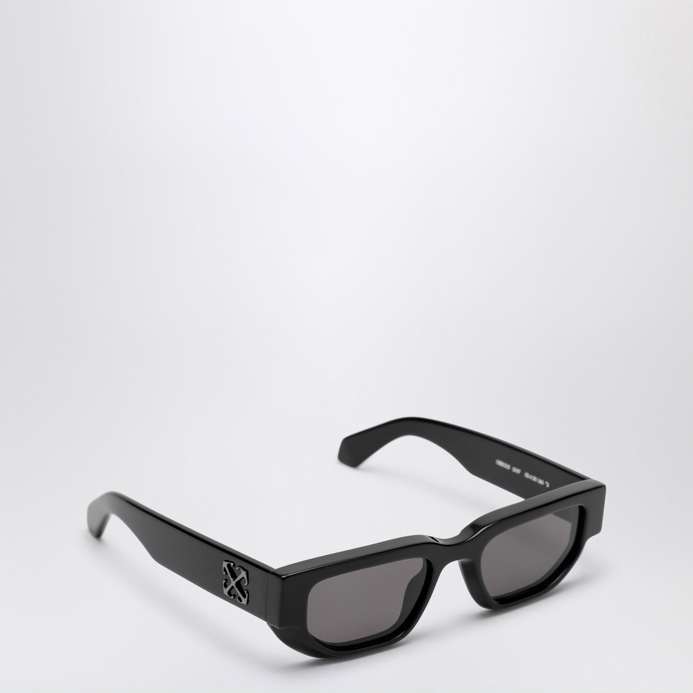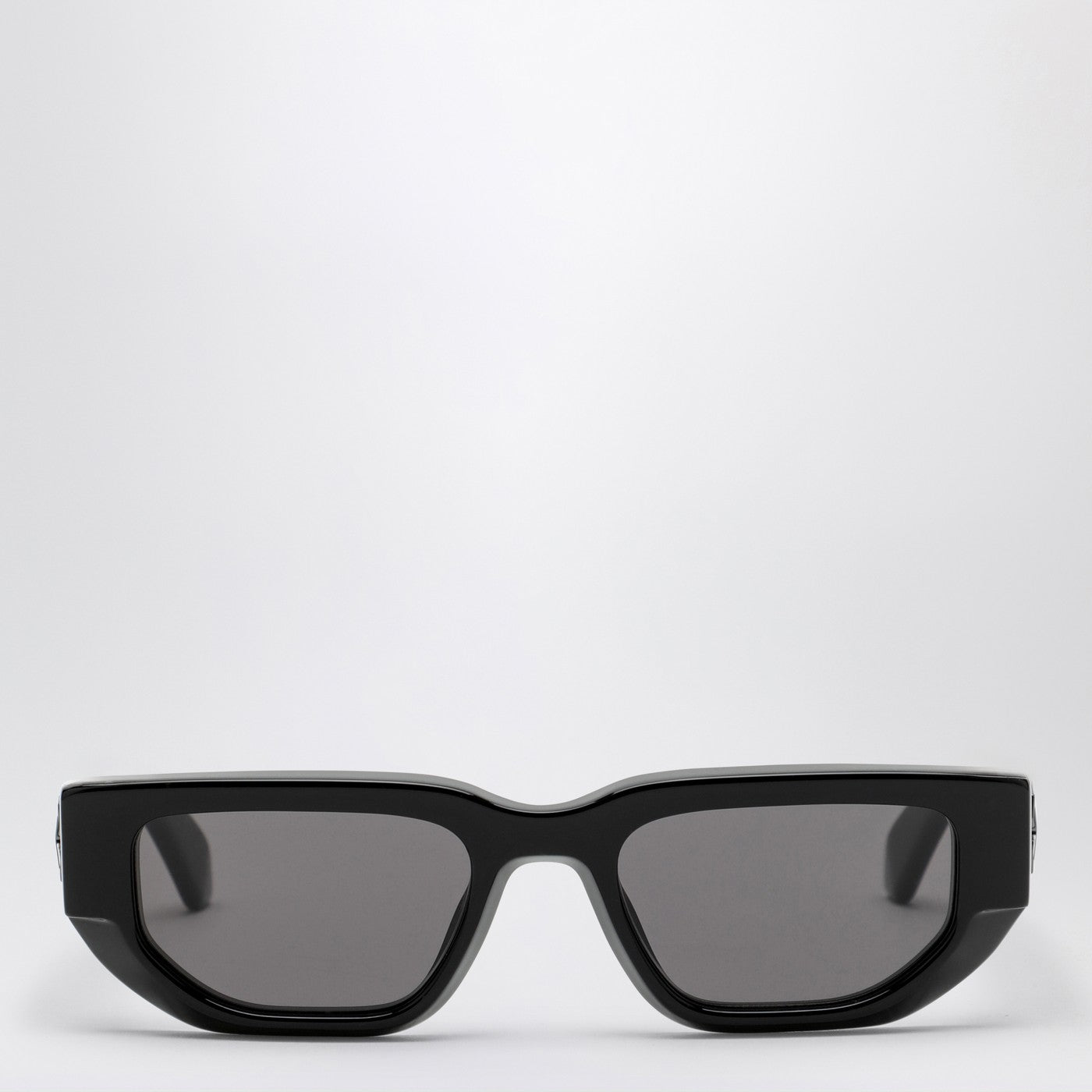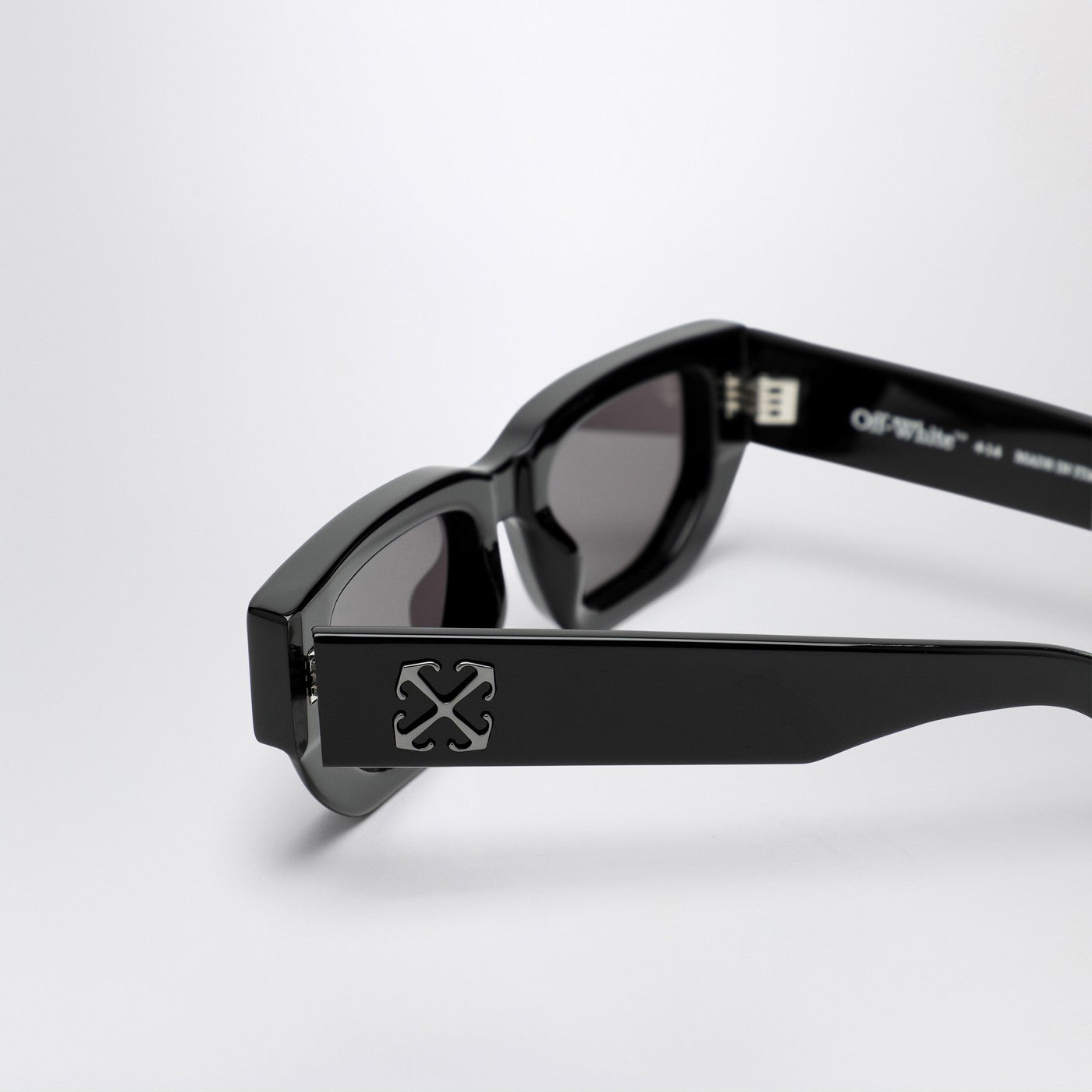 Occhiali da sole acetato nero di bianco sporco con lenti nere, con una cornice geometrica a occhio gatto con design sfaccettato e logo per motivi freccia sui templi.