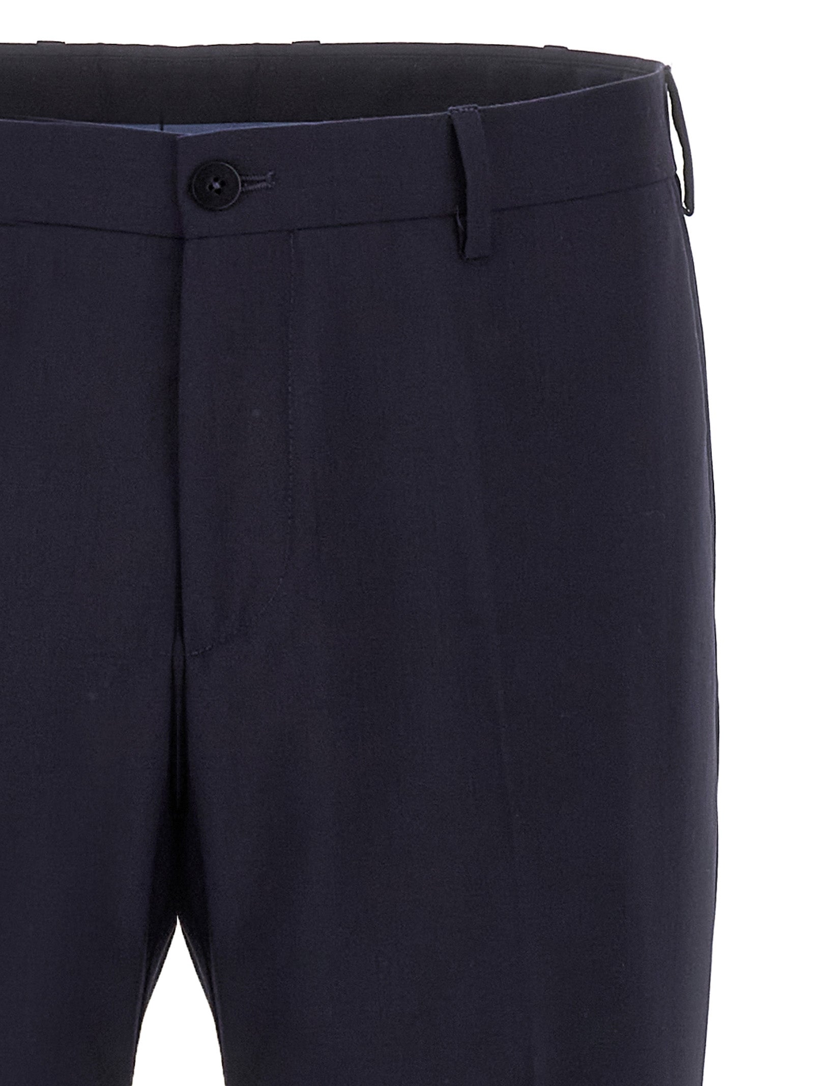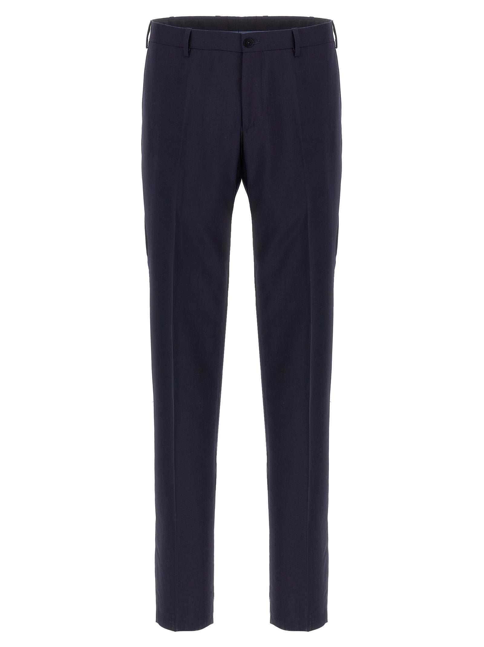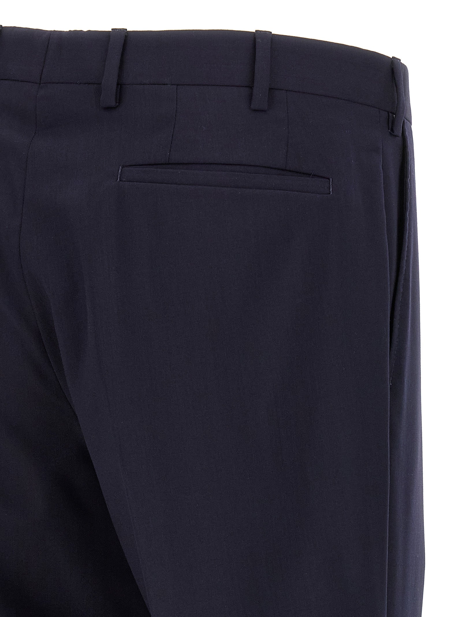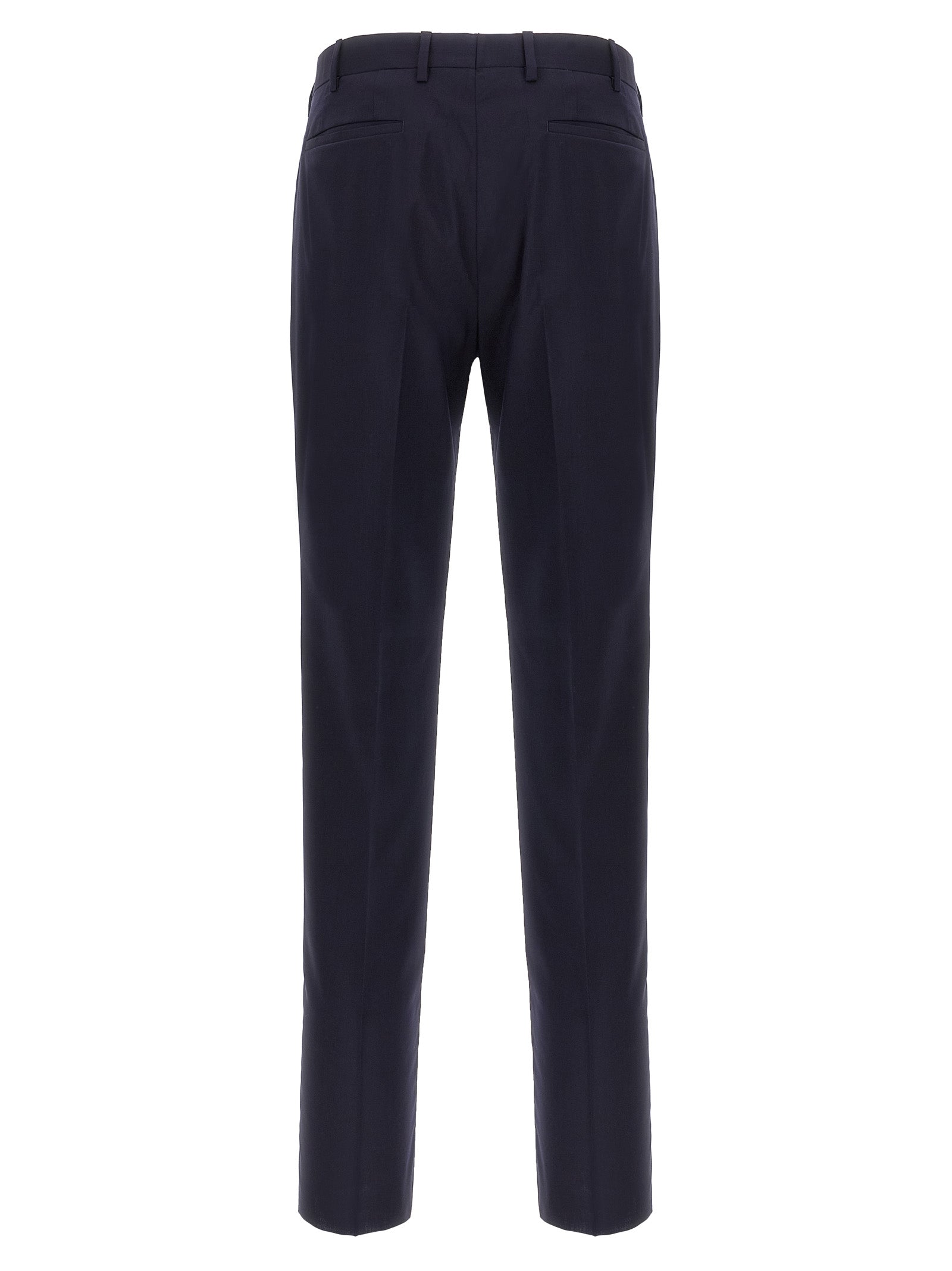 Pantaloni di lana, piega allungata, tasche "americane" anteriori, tasche posteriori, chiusura di zip e bottoni anteriori, fodera per la viscosa.