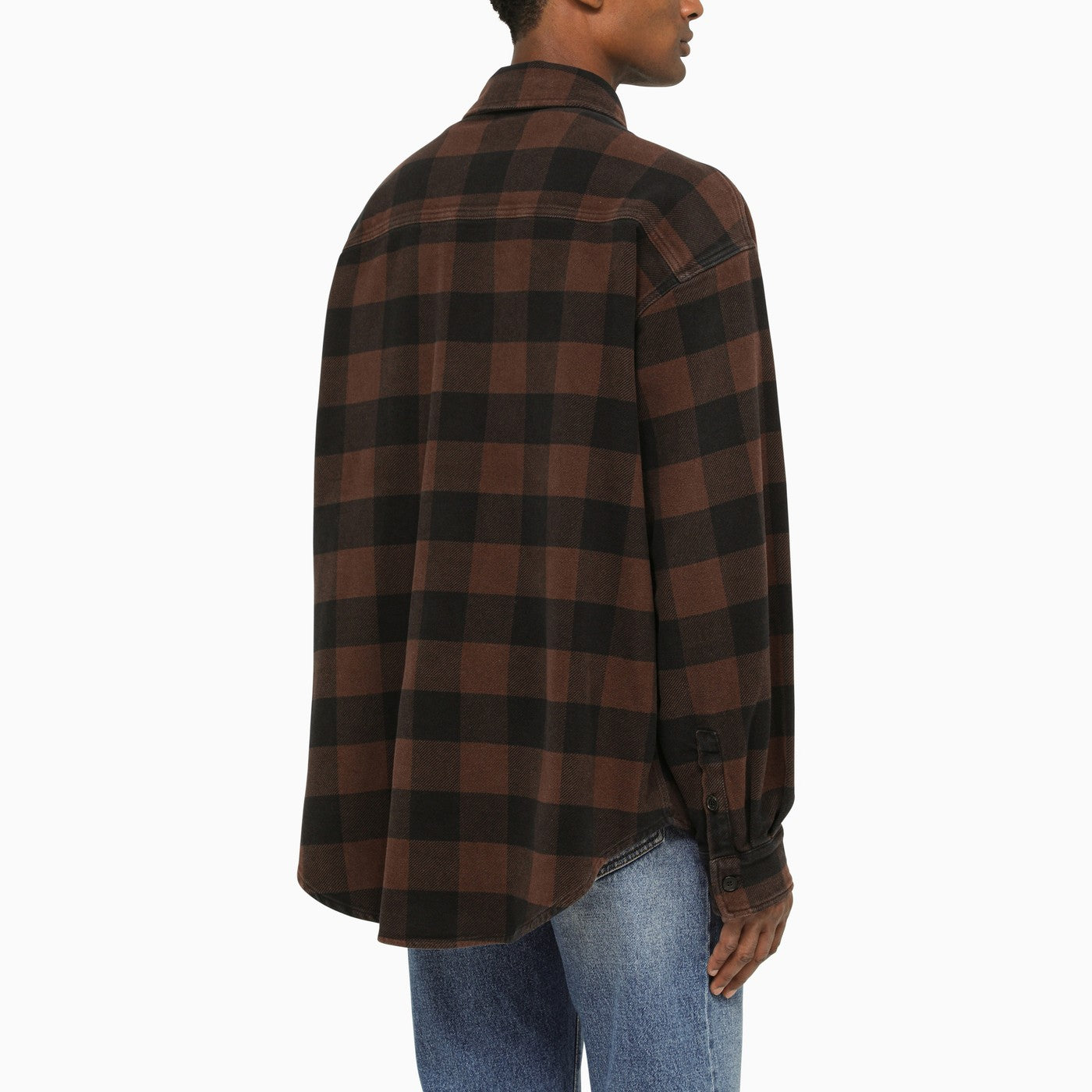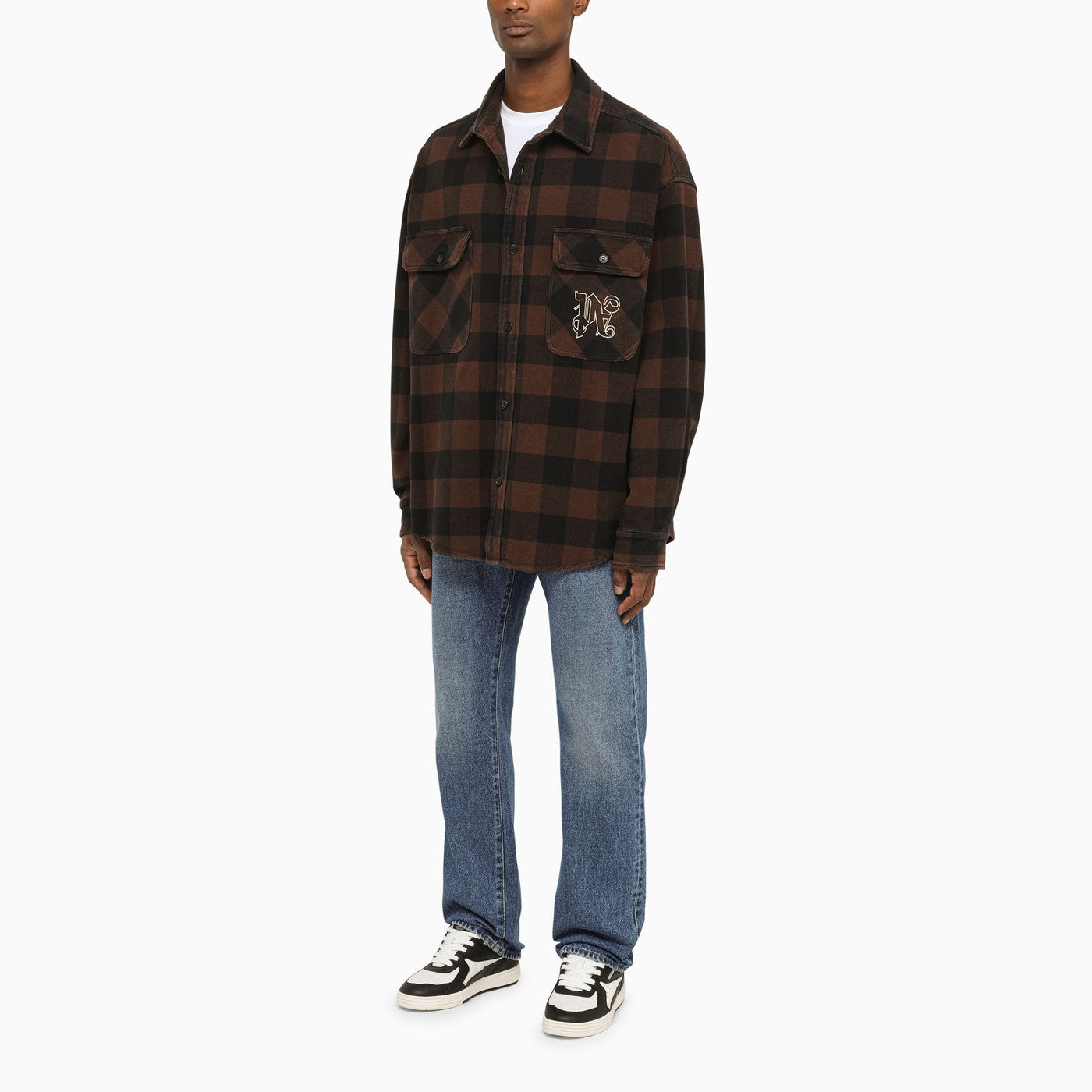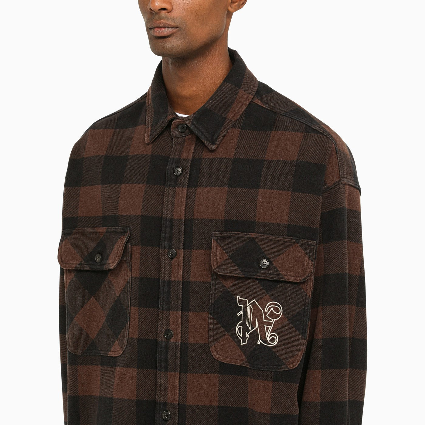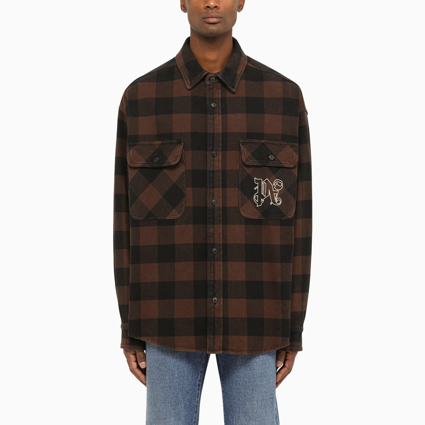 Modello di controllo in cotone marrone camicia regolare di angeli di palma con maniche lunghe, due grandi tasche a patta e bottoni sul davanti, ricami anteriori e orlo arrotondato.