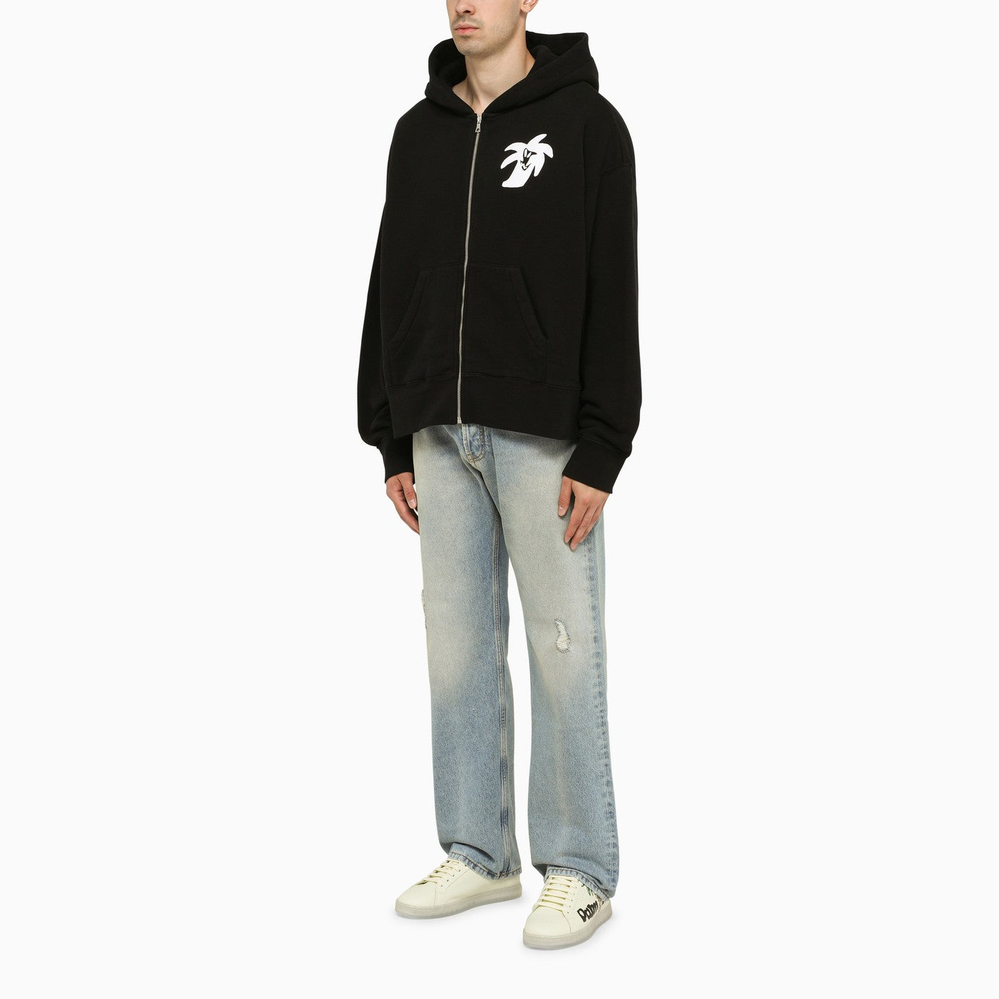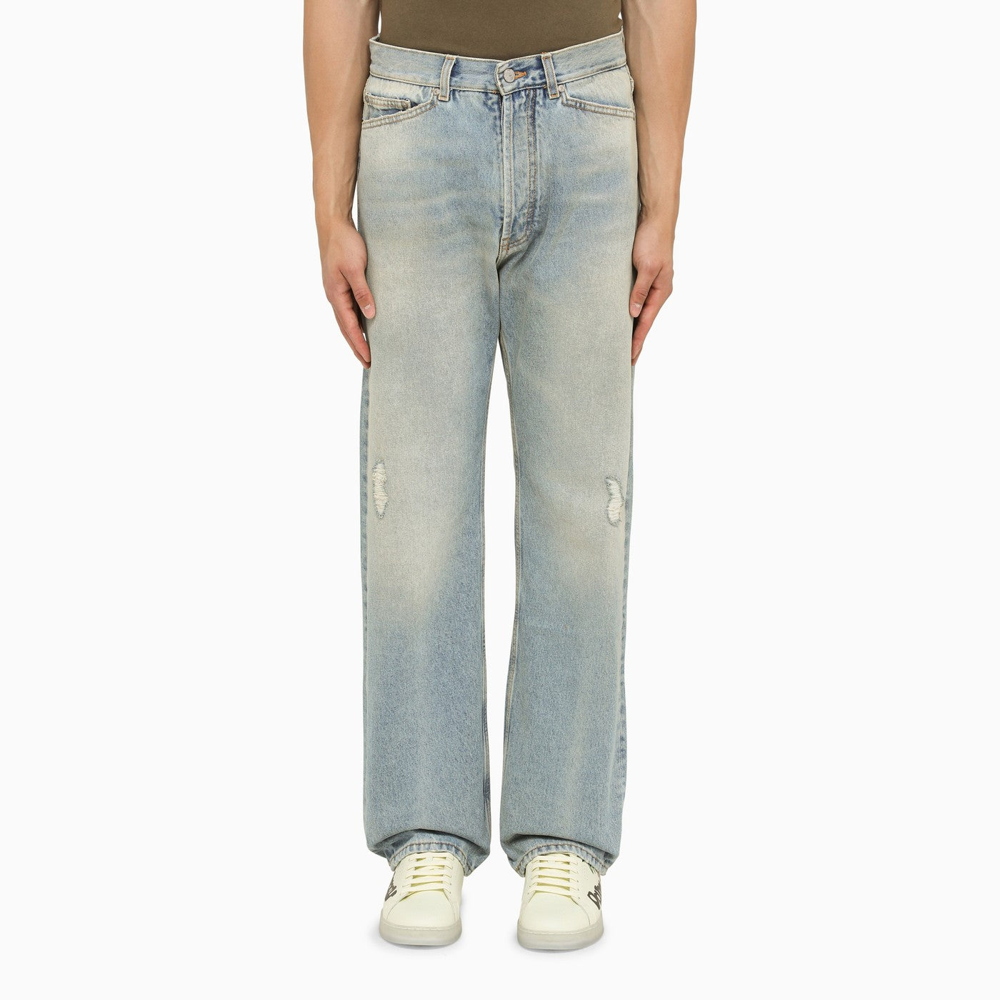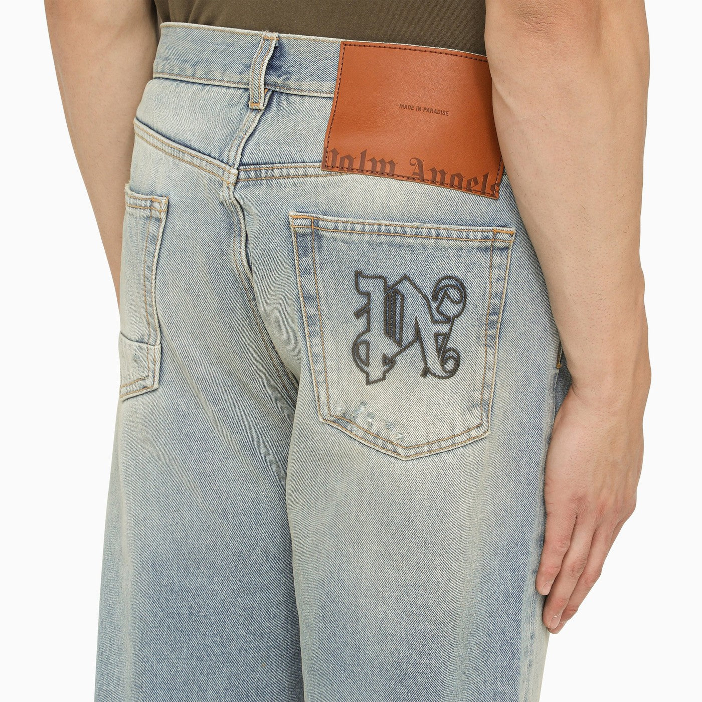 Jeans regolari di denim in cotone azzurro di angeli di palma con usura localizzata, stampa monogramma, tasche anteriori e posteriori e patch di logo in pelle.