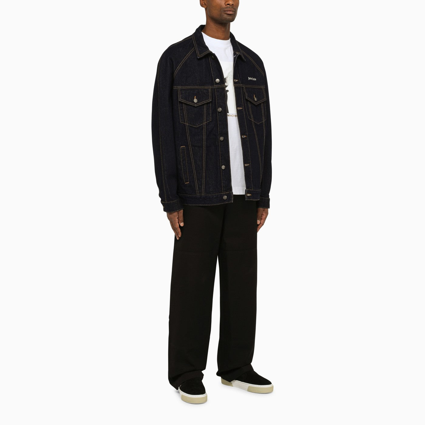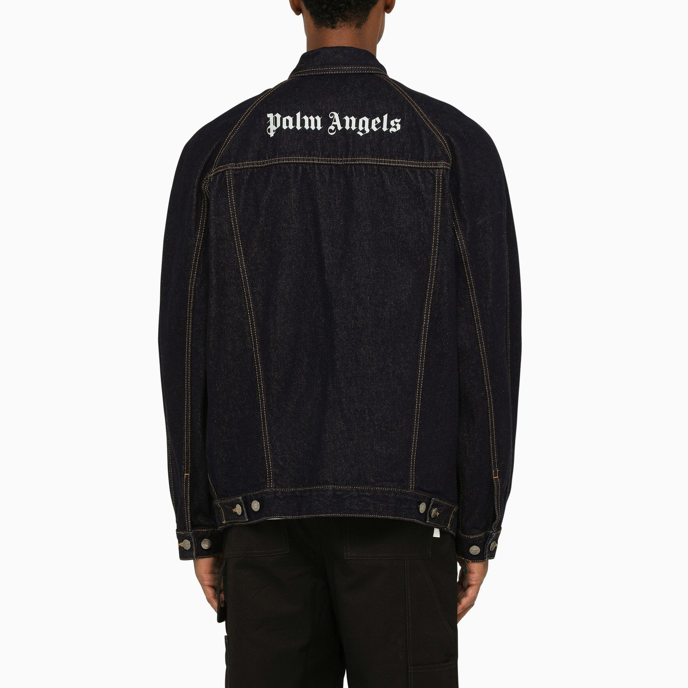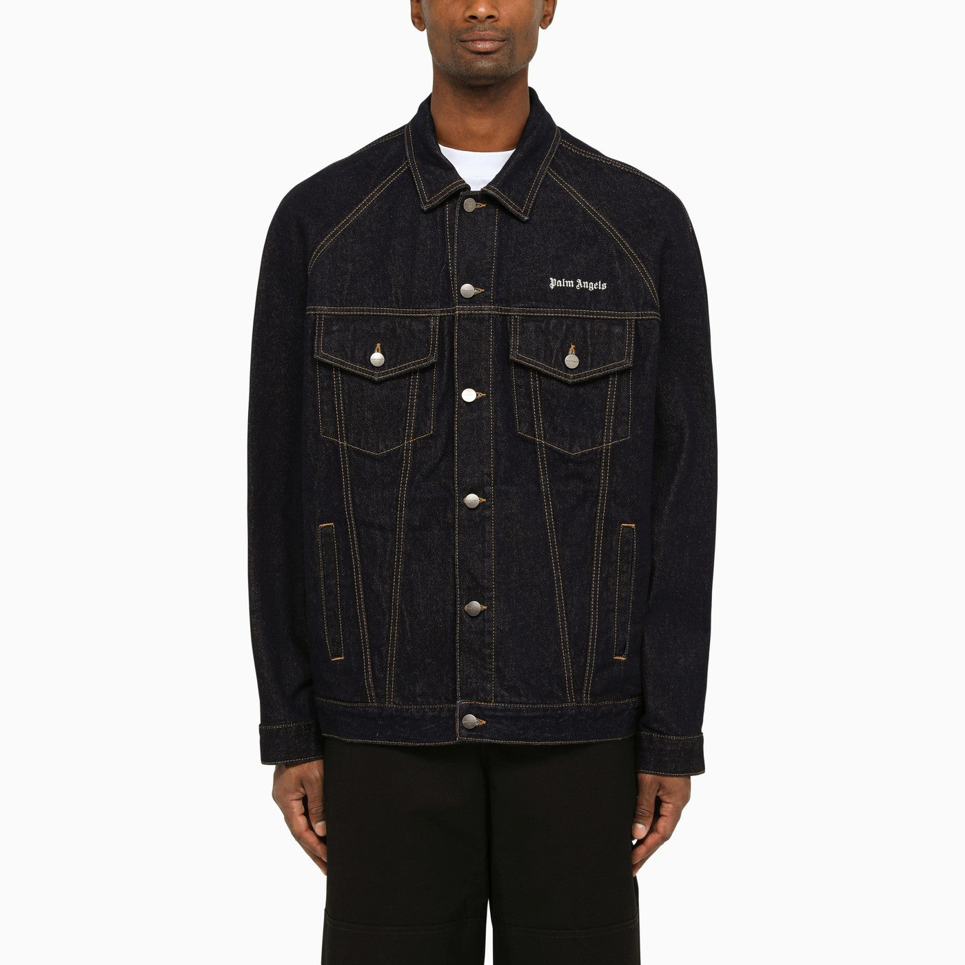 Giacca di jeans di cotone blu di palma Angels, con cuciture a contrasto, fissaggio a bottone, due tasche a marcia anteriore, due tasche a flap e logo sul fronte e sul retro.