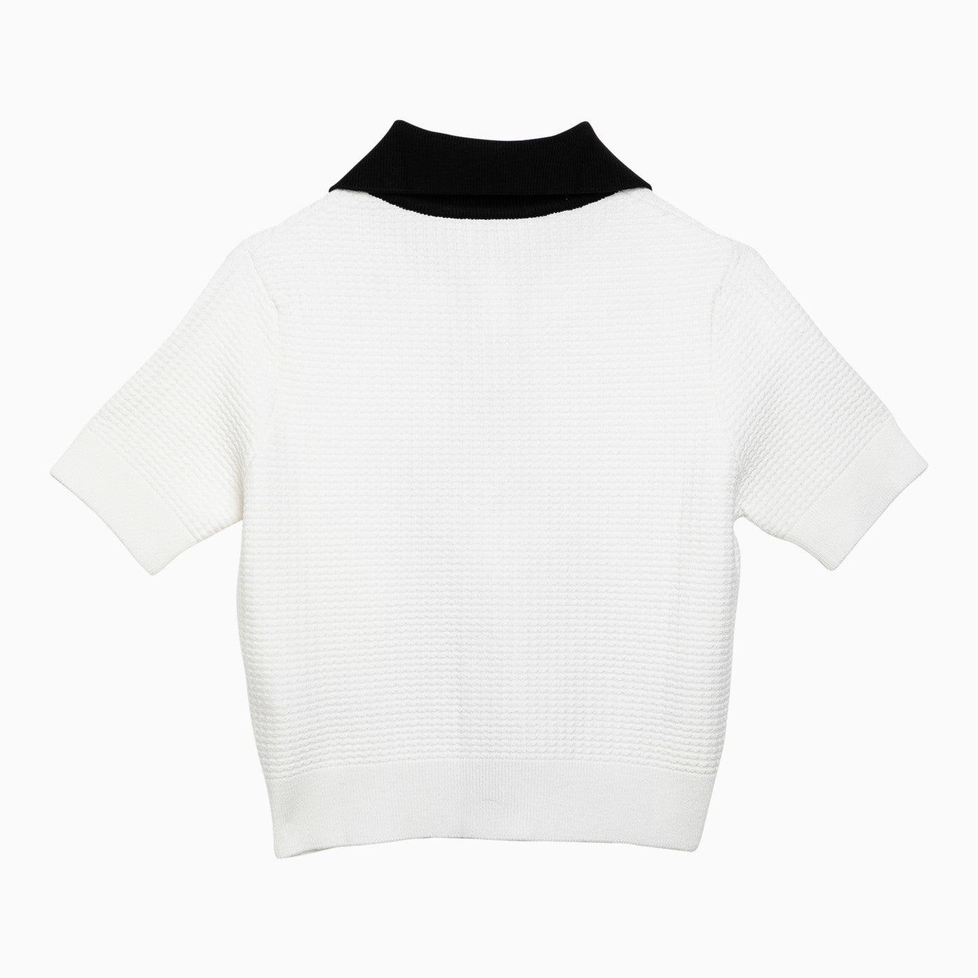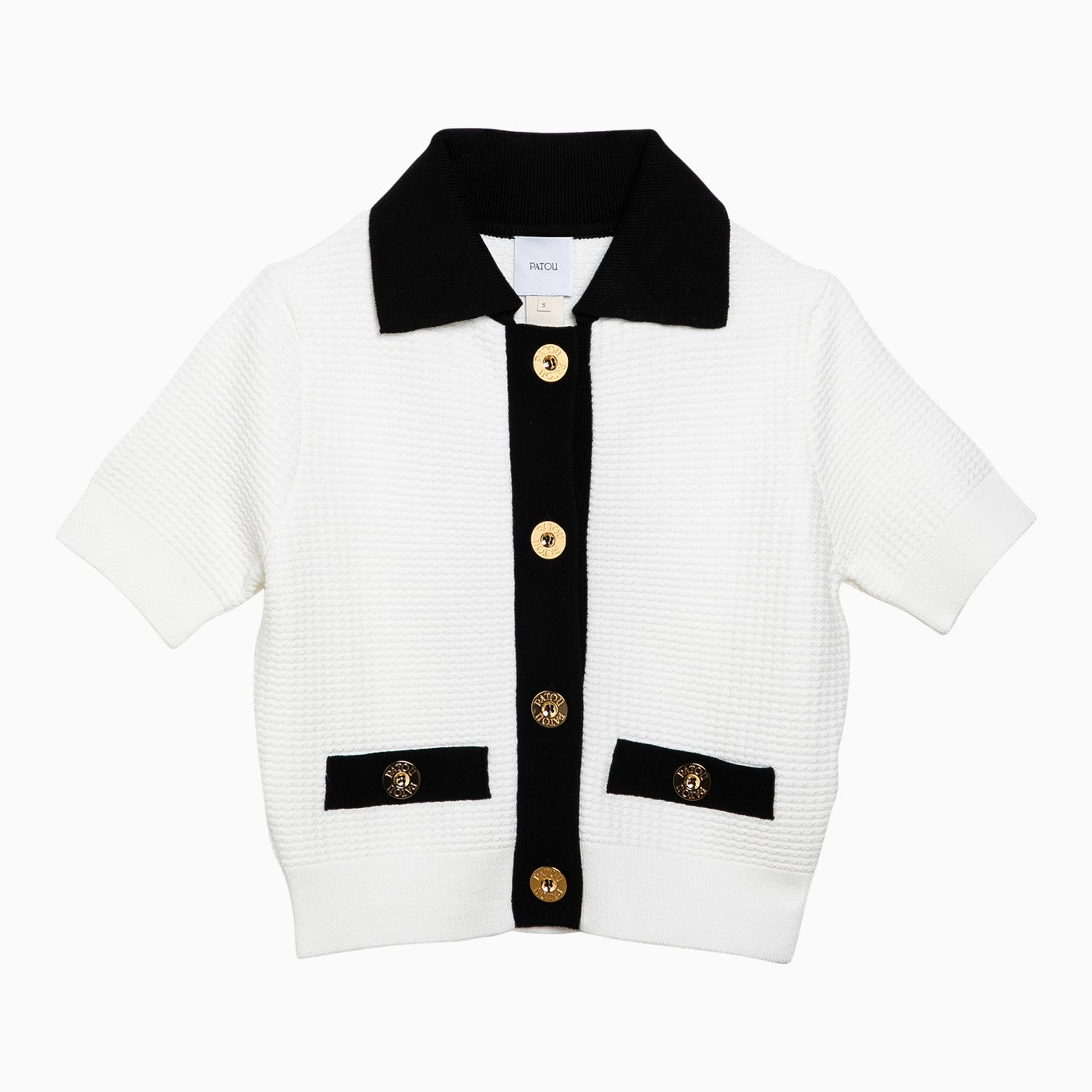 Cardigan di cotone bianco di Patou, dispone di un colletto a camicia, maniche corte, un fissaggio anteriore con bottoni in oro stampati con logo, due tasche anteriori con bottoni d'oro e bordi a coste.