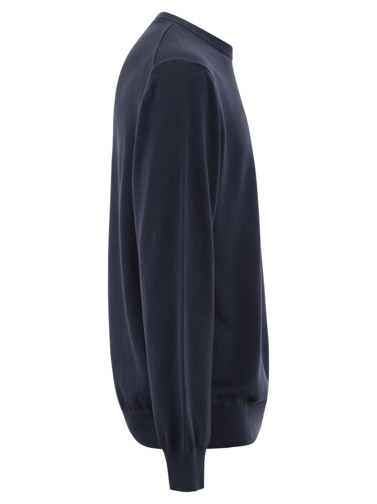 I capi di questa collezione sono ispirati all'eleganza senza tempo. Jumper di cotone tinto di indumenti, collo dell'equipaggio e con il distintivo iconico sulla spalla. - badge iconico - GUIDO DELLA - MIGLIO DI CAGHE CREW IN COTTON CAUDATO CAUDE - COLLARE COSTA, SUGGERIMENTI E FOLCHI