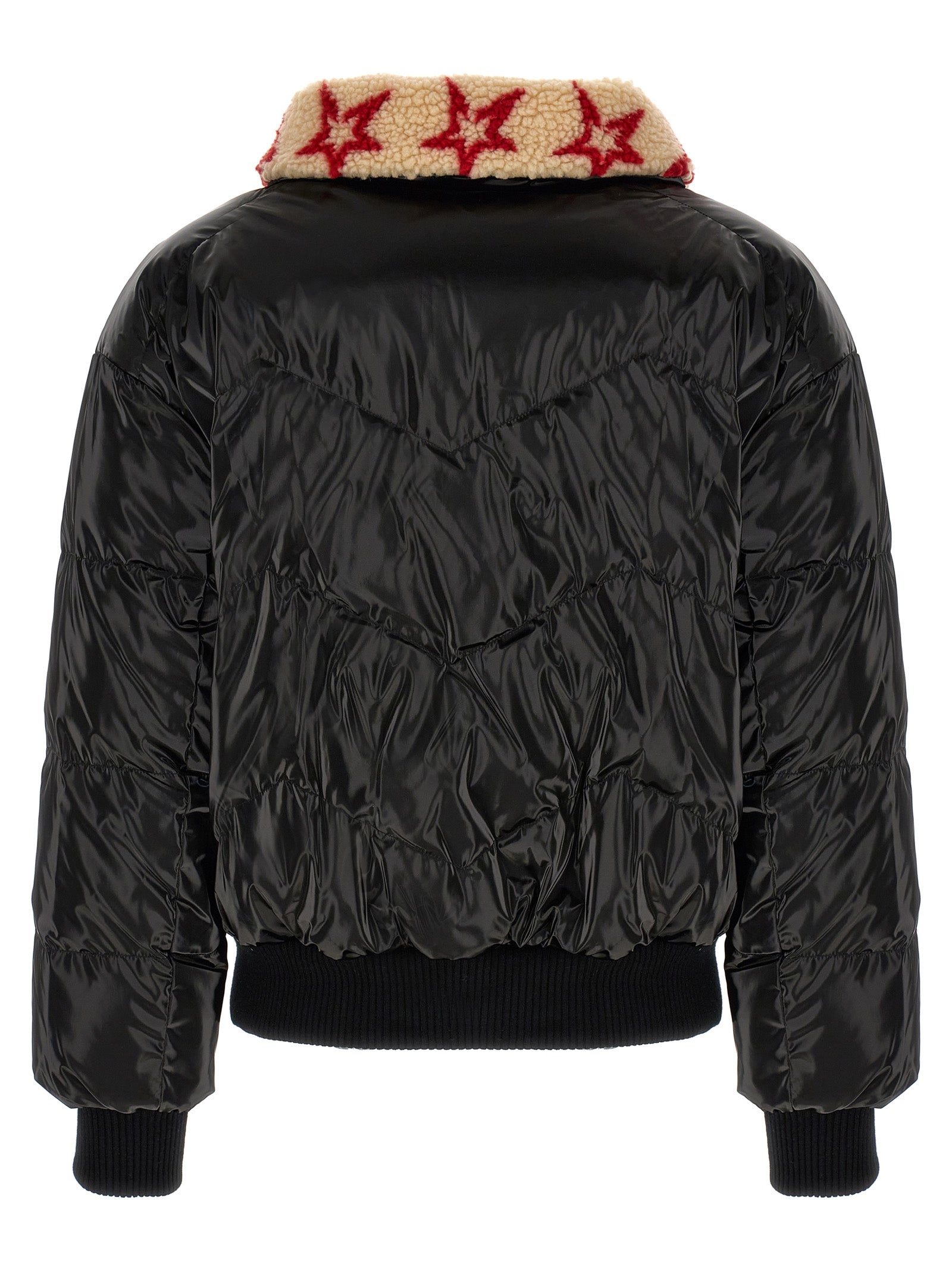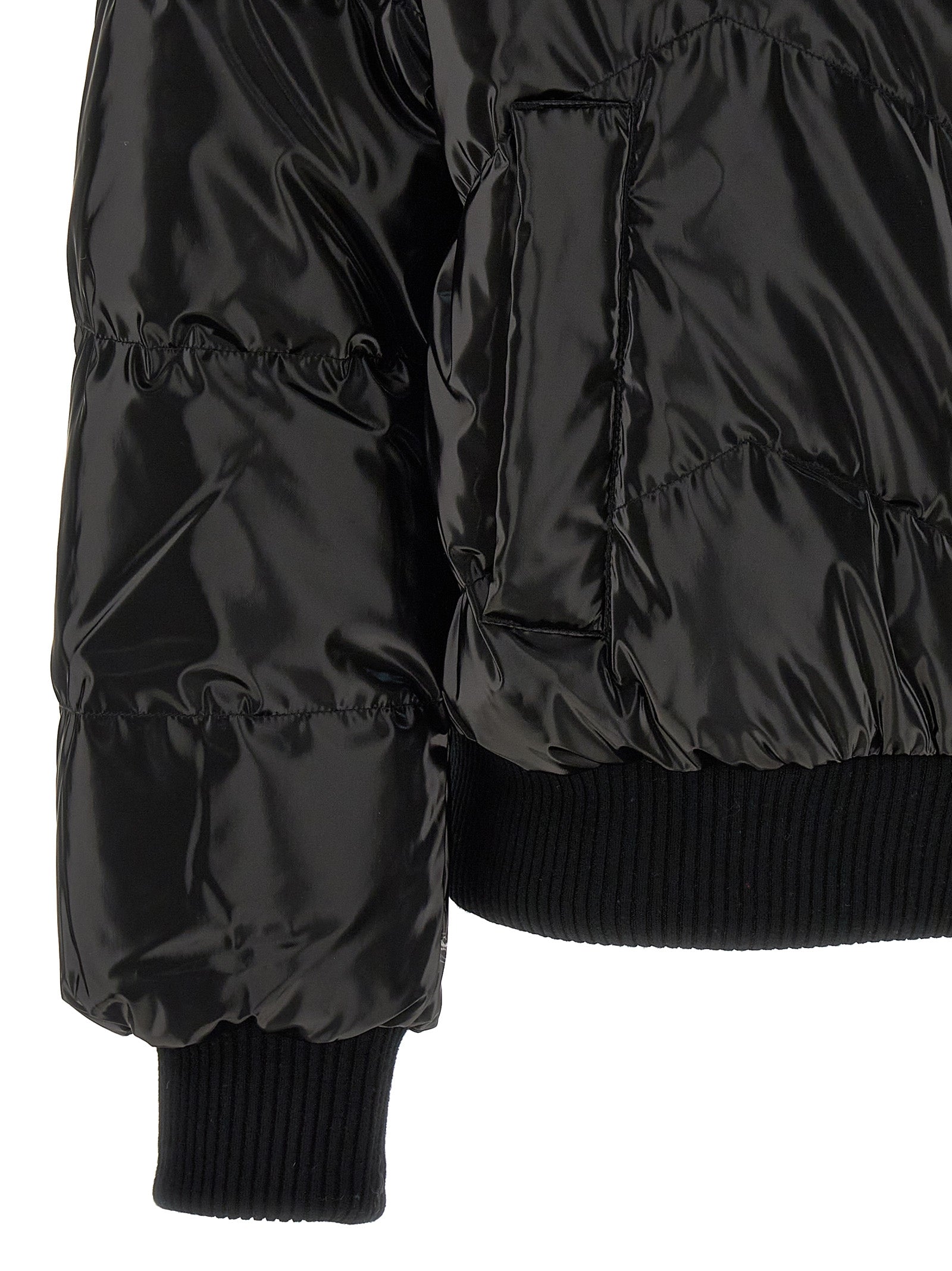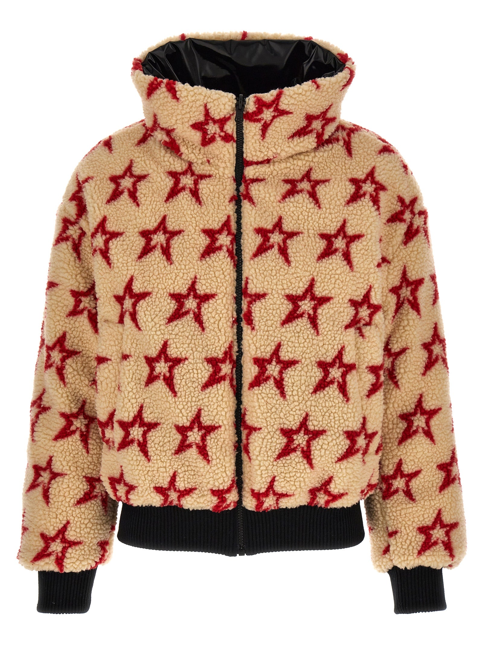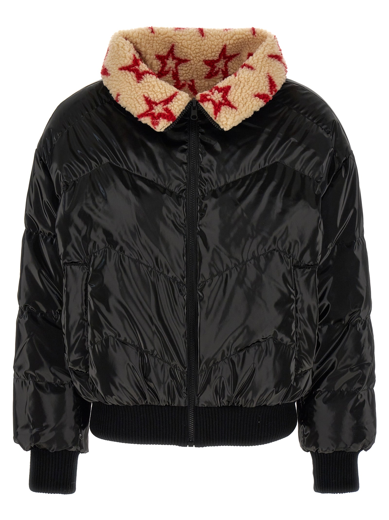 Giacca reversibile in nylon shiny in nylon in nylon con fodera di shearling stampata, chiusura a zip, tasche, maniche lunghe con polsini a maglia.