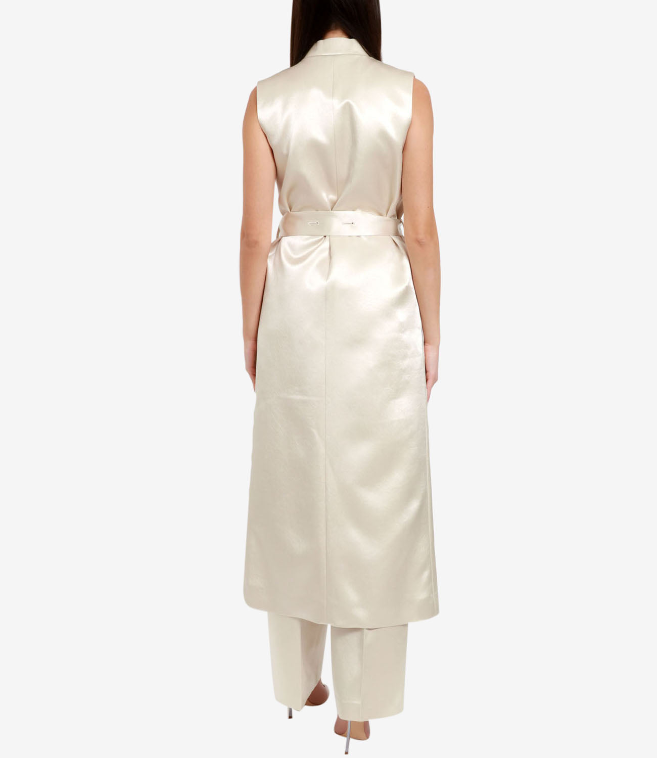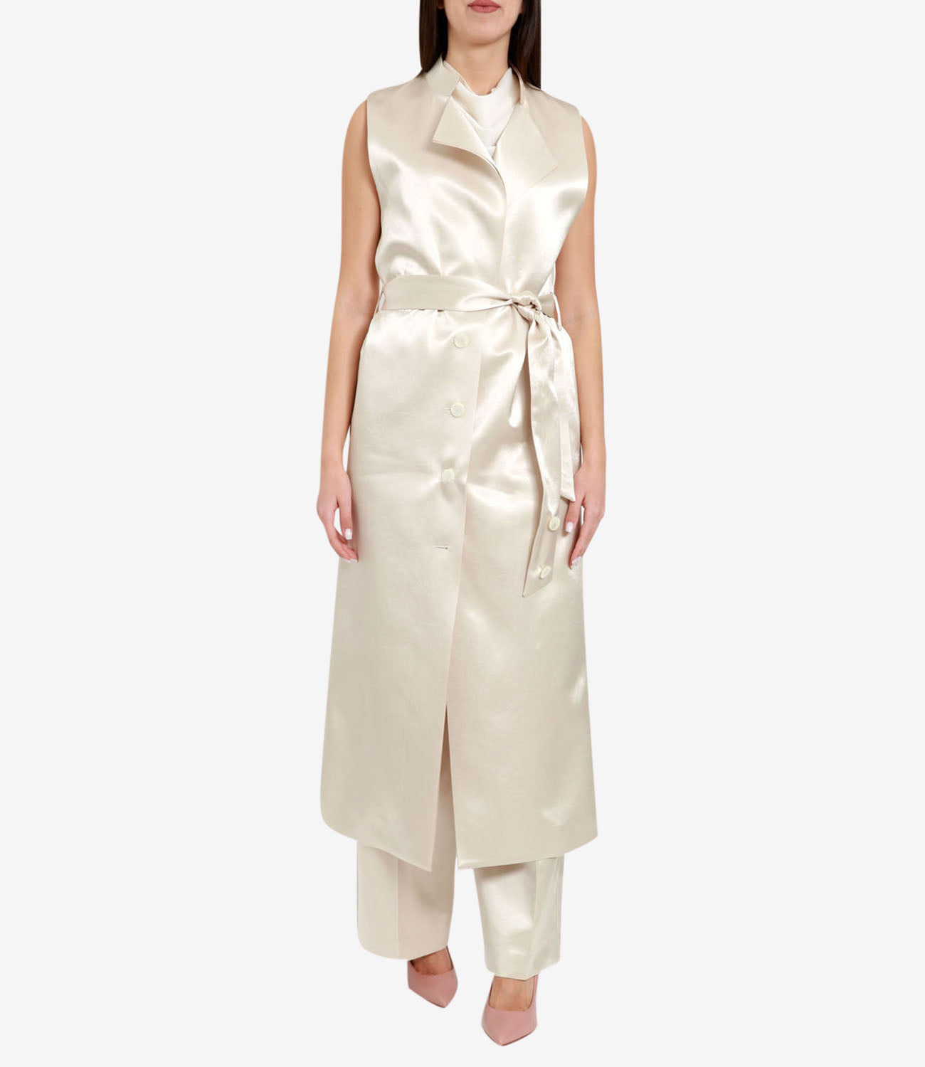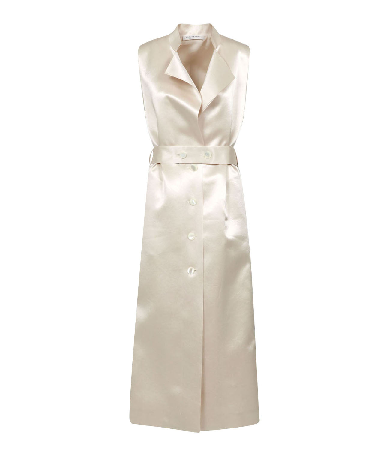 - Duchesse - Tessuto di finitura lucida - Modello extra -lungo - Collar di la riseggio morbido - senza maniche - Closura anteriore con bottoni ricoperti di tessuto abbinato - cintura con anelli sulla parte laterale