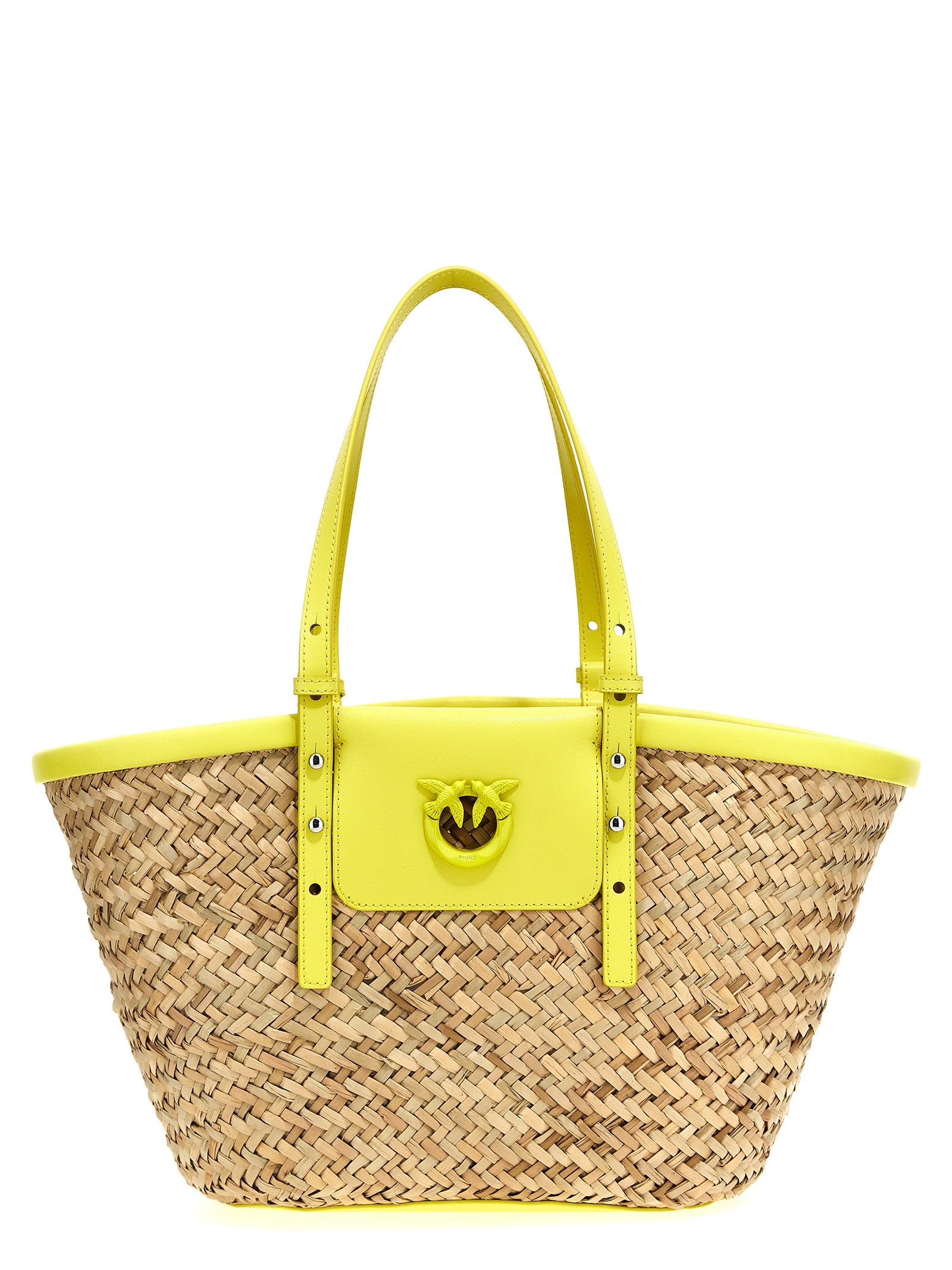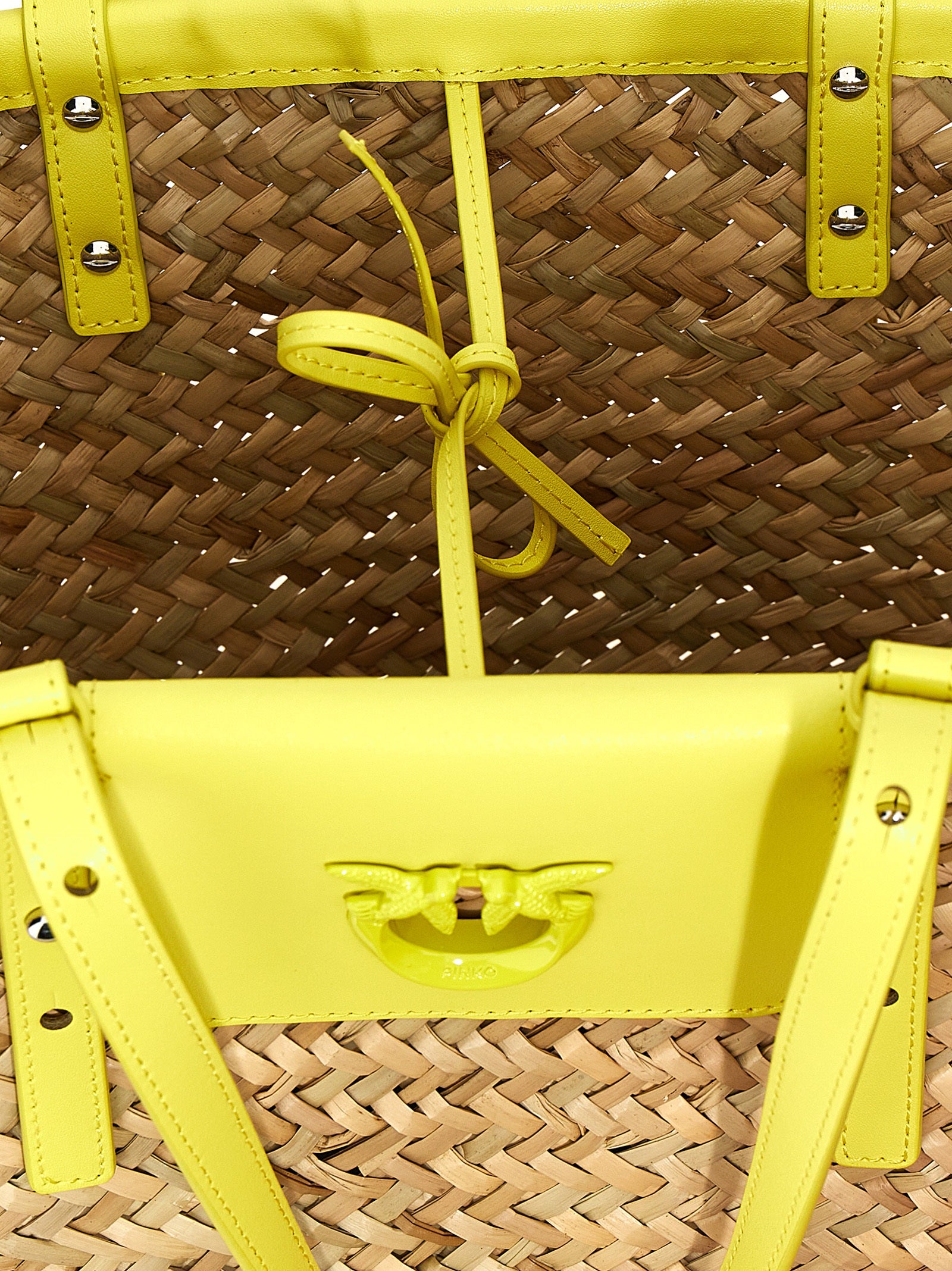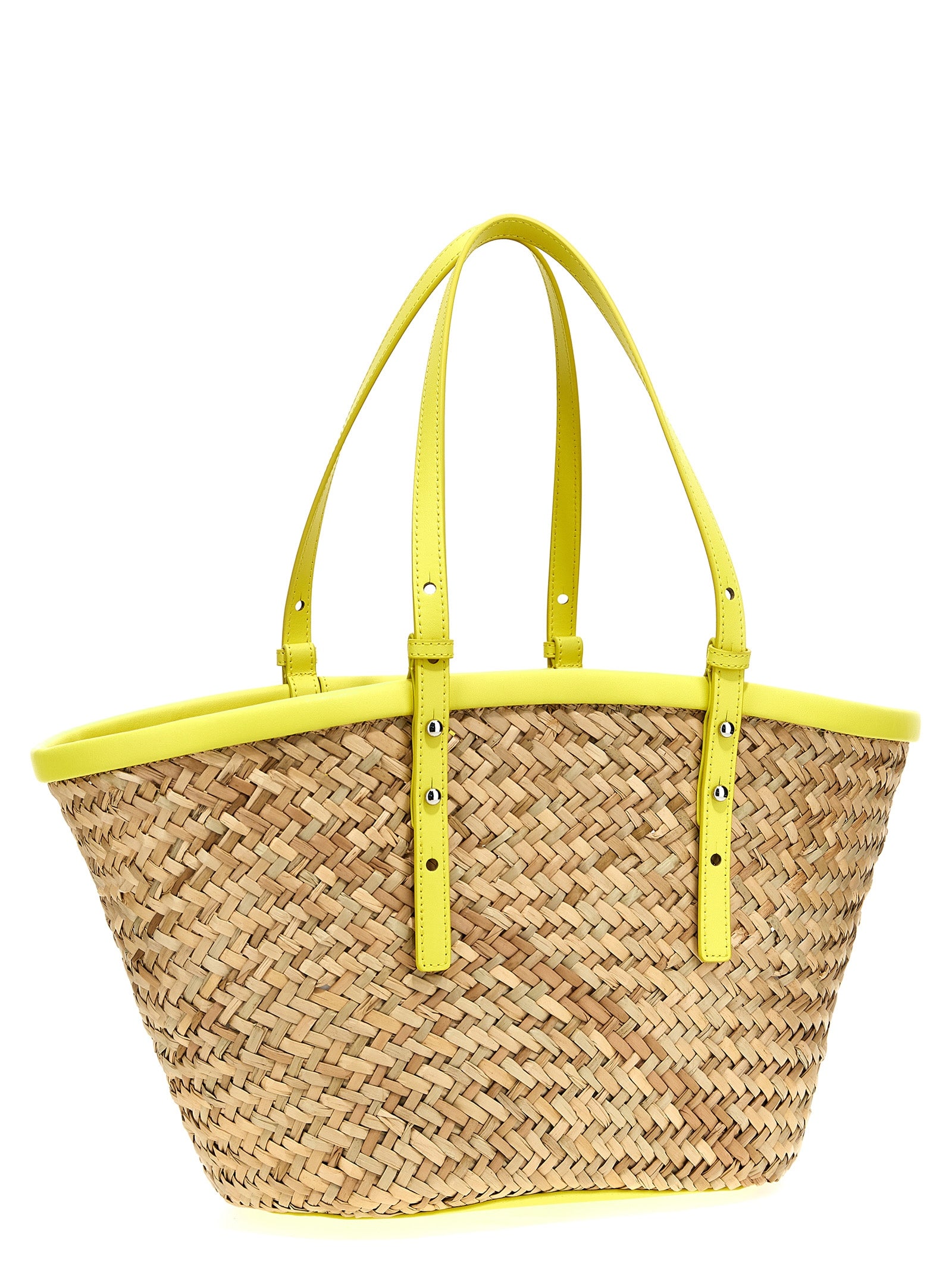 Borsa da secchio "Love Summer" in rafia tessuta con dettagli in pelle, dettagli sul logo anteriore, tracolla regolabile.