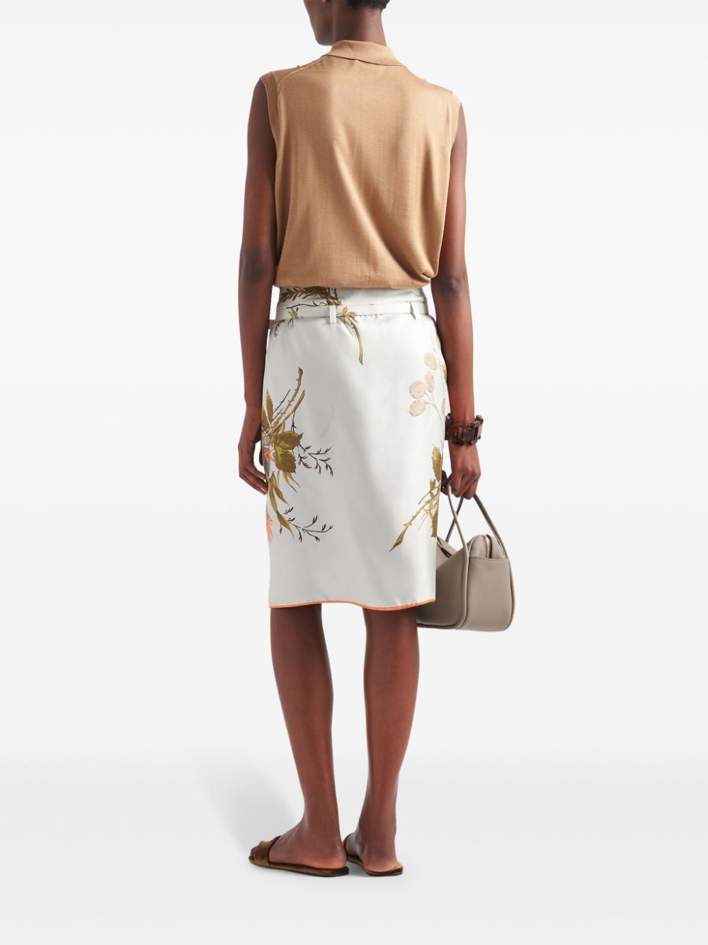 white/multicolour silk twill weave all-over floral print belted waist concealed side fastening straight hem mid-length