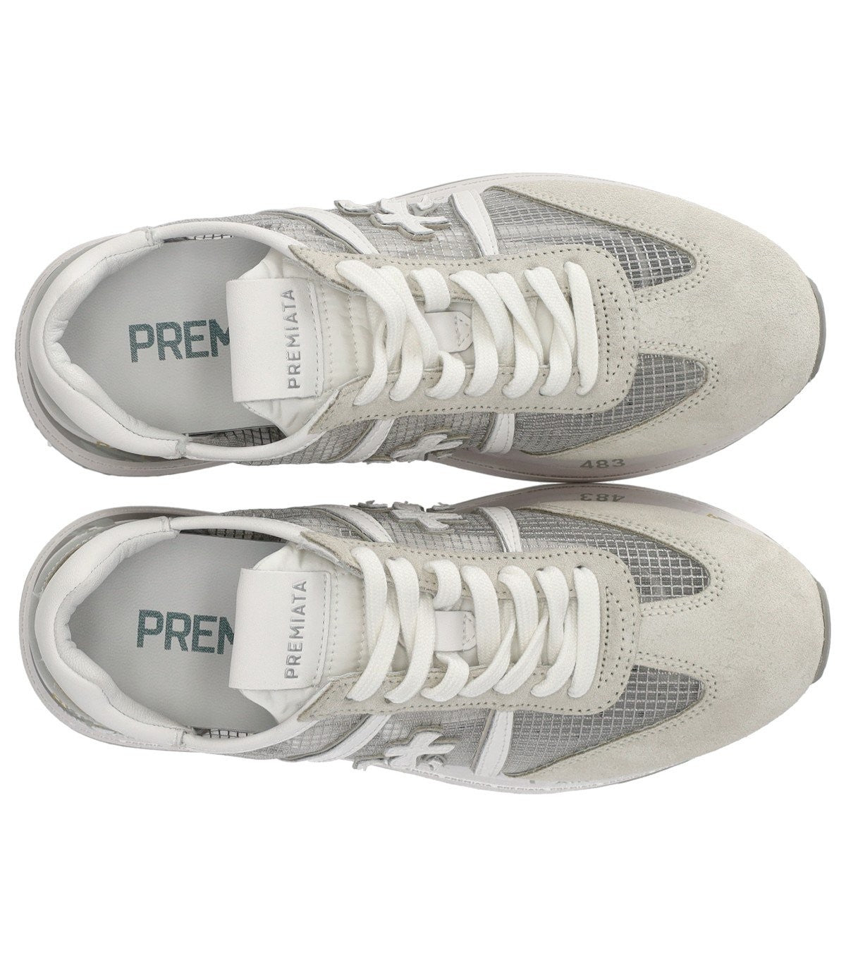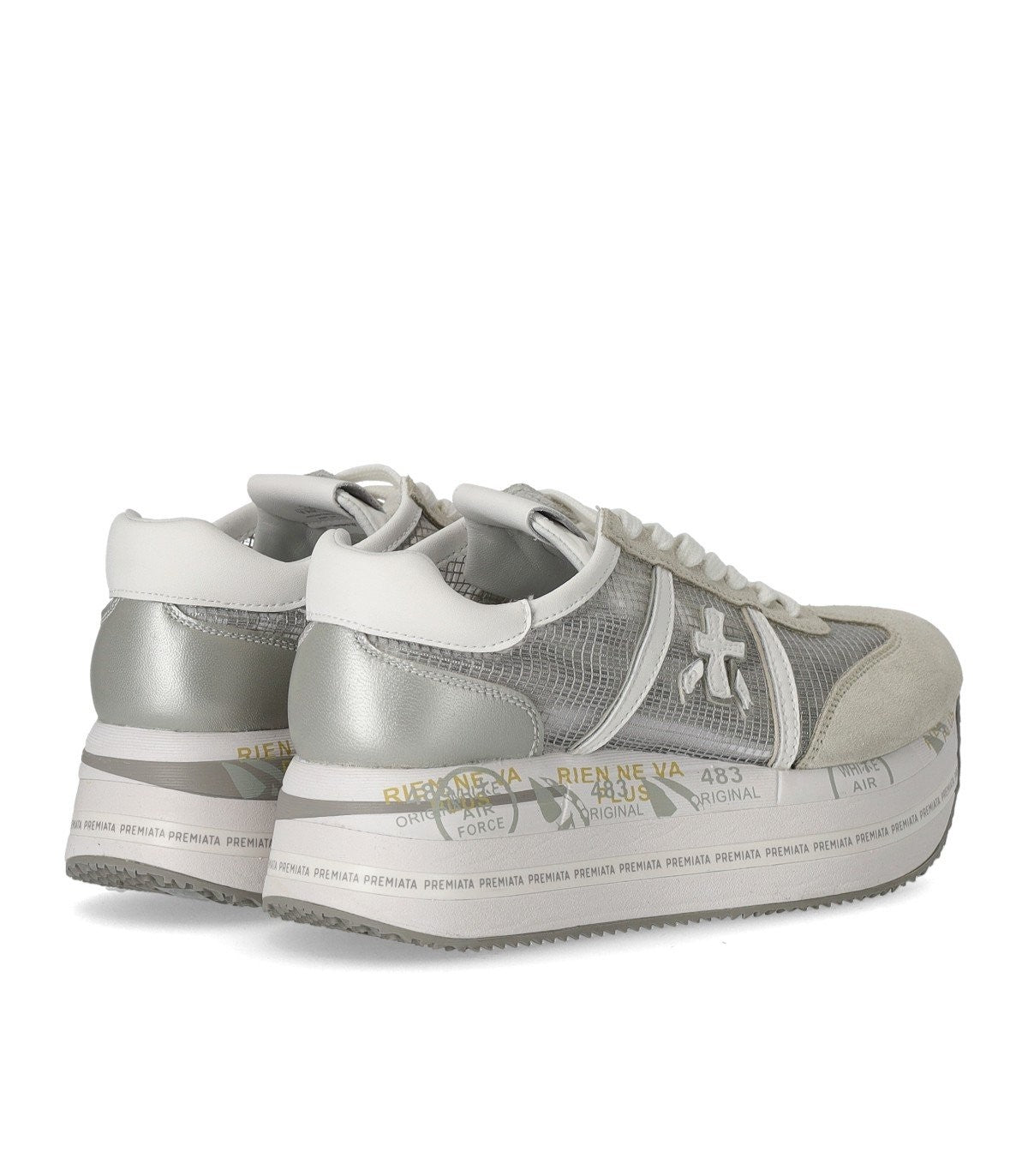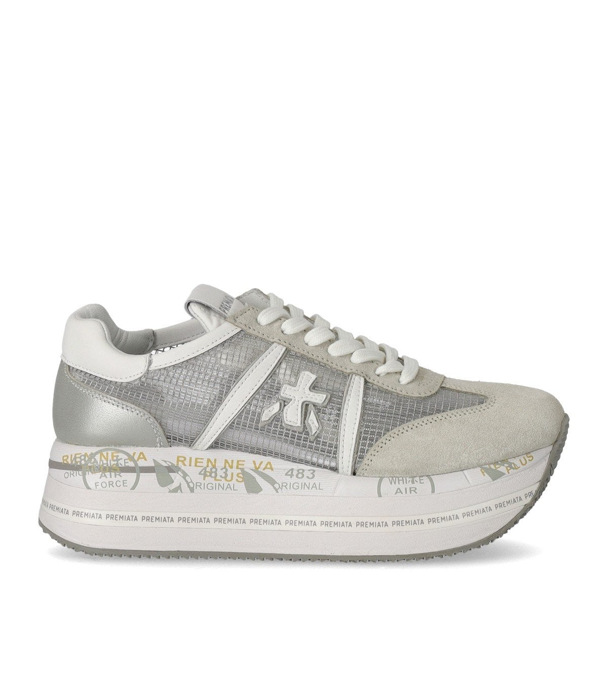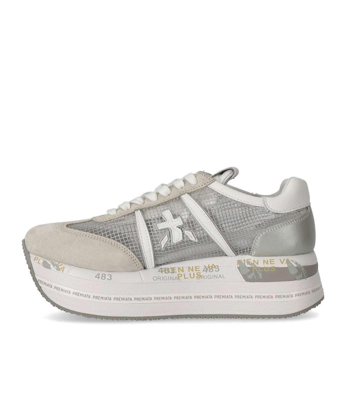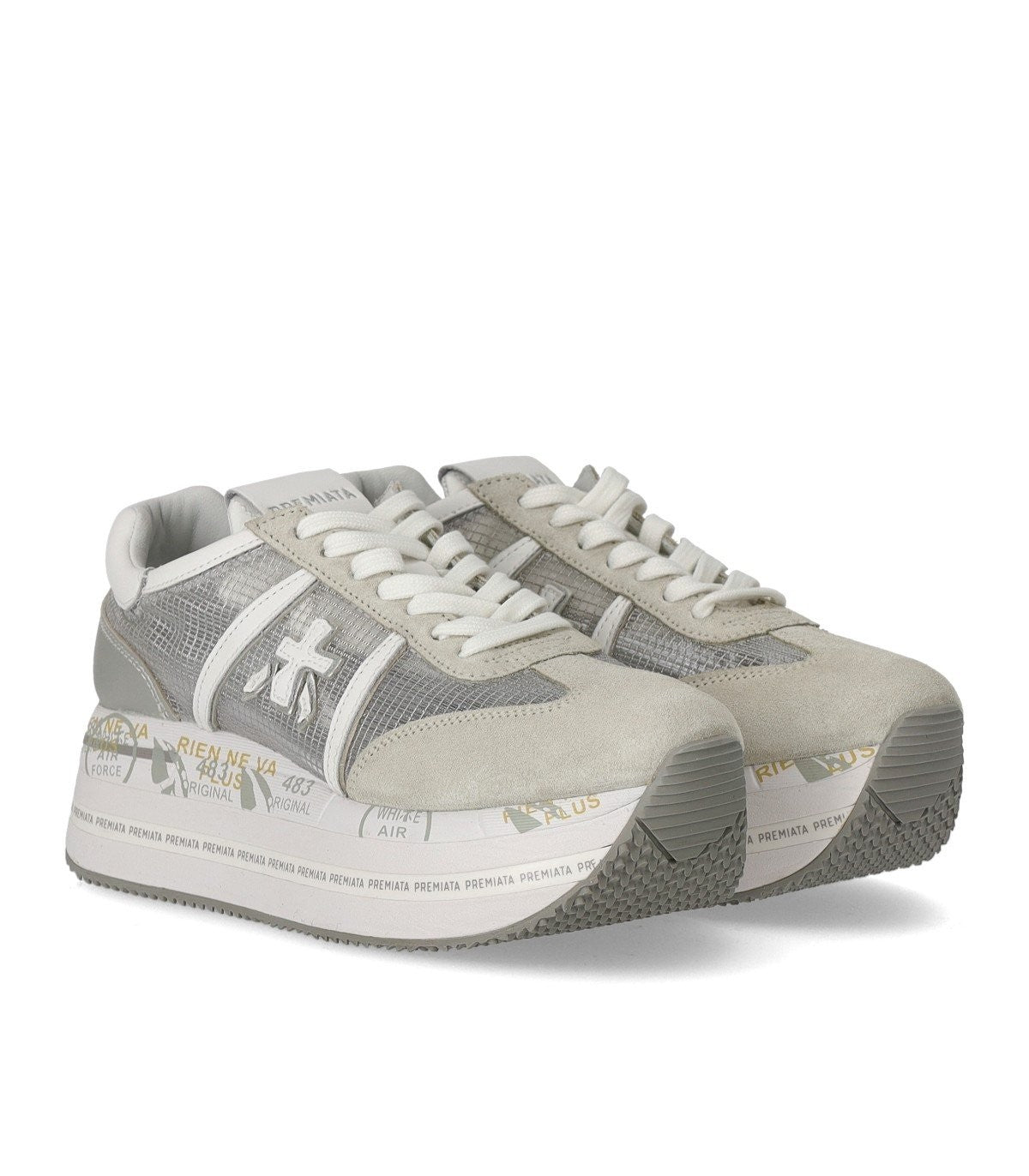 BETH 6792 Sneaker di Premiata Made di pelle scamosciata, nylon Ripstop e pelle in sfumature di beige, bianco e grigio. Fodera e insuola rimovibile in pelle morbida. Logo iconico sul suola laterale e piattaforma in gomma bianca con stampe tipiche del marchio. Altezza 5 cm.