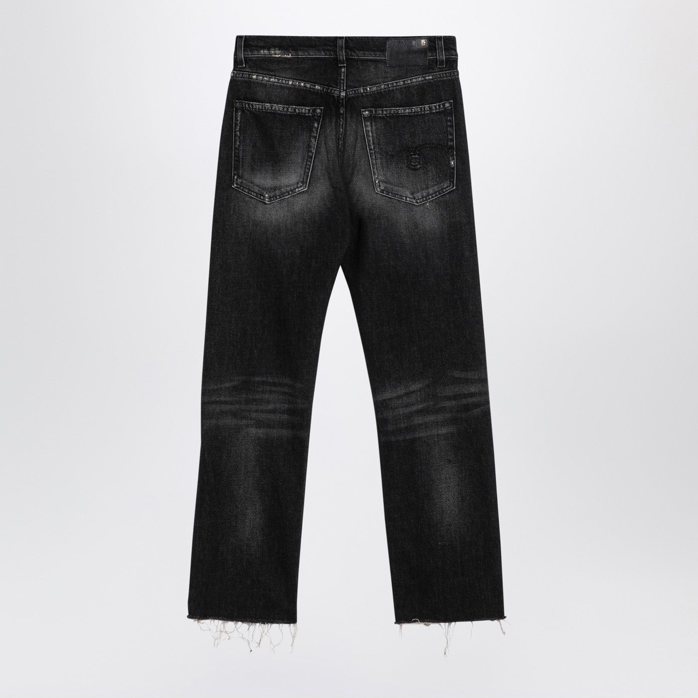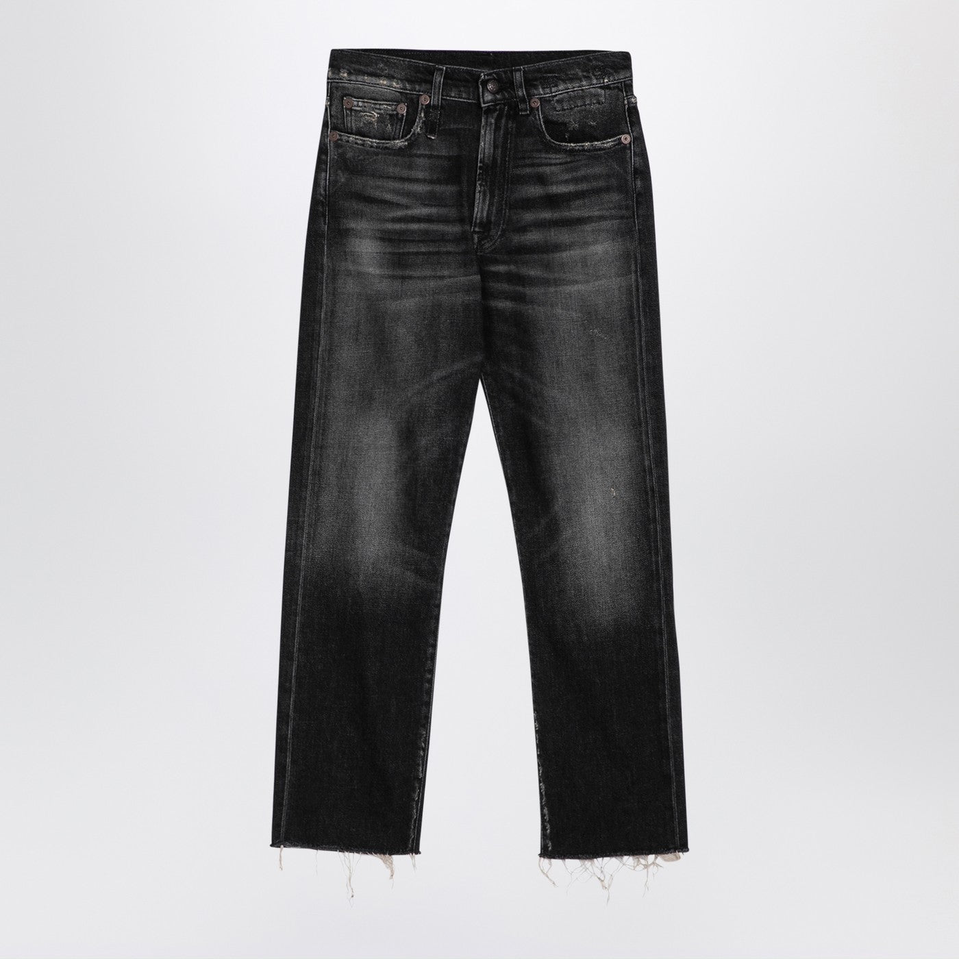 Jeans in denim in cotone a effetto a lavaggio nero da R13 con anelli della cintura, una zip anteriore e un fissaggio a bottone, un classico design a cinque tasca, una patch di logo posteriore e un orlo sfilacciato.