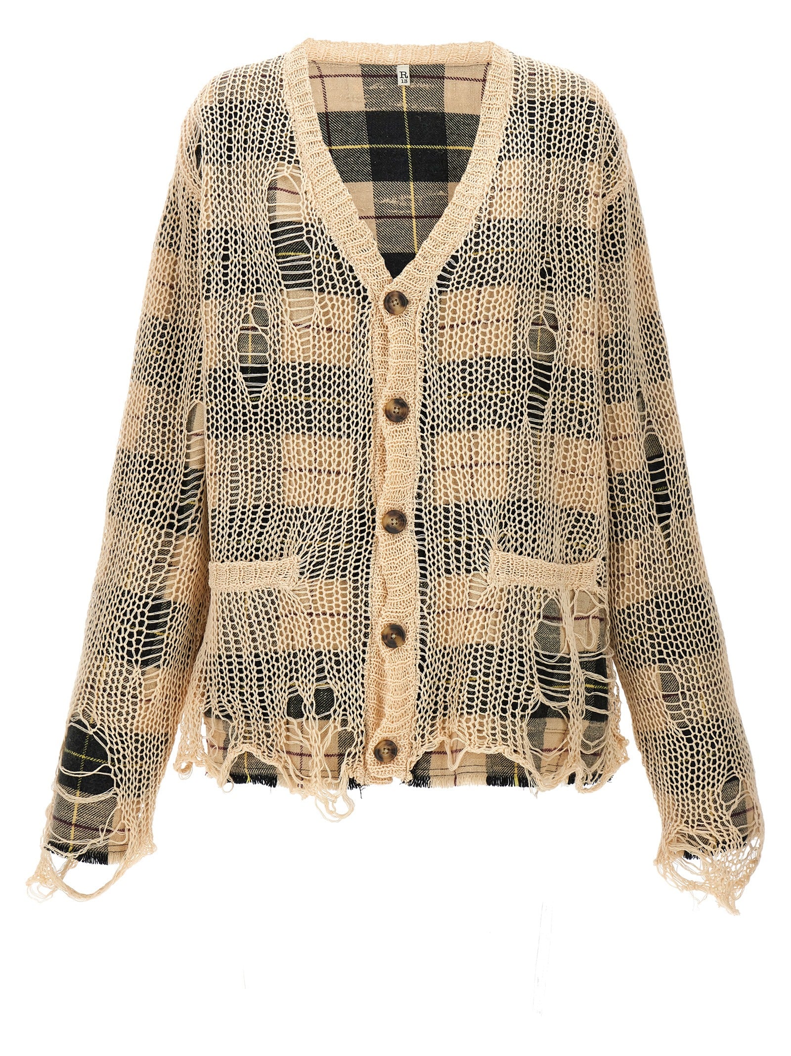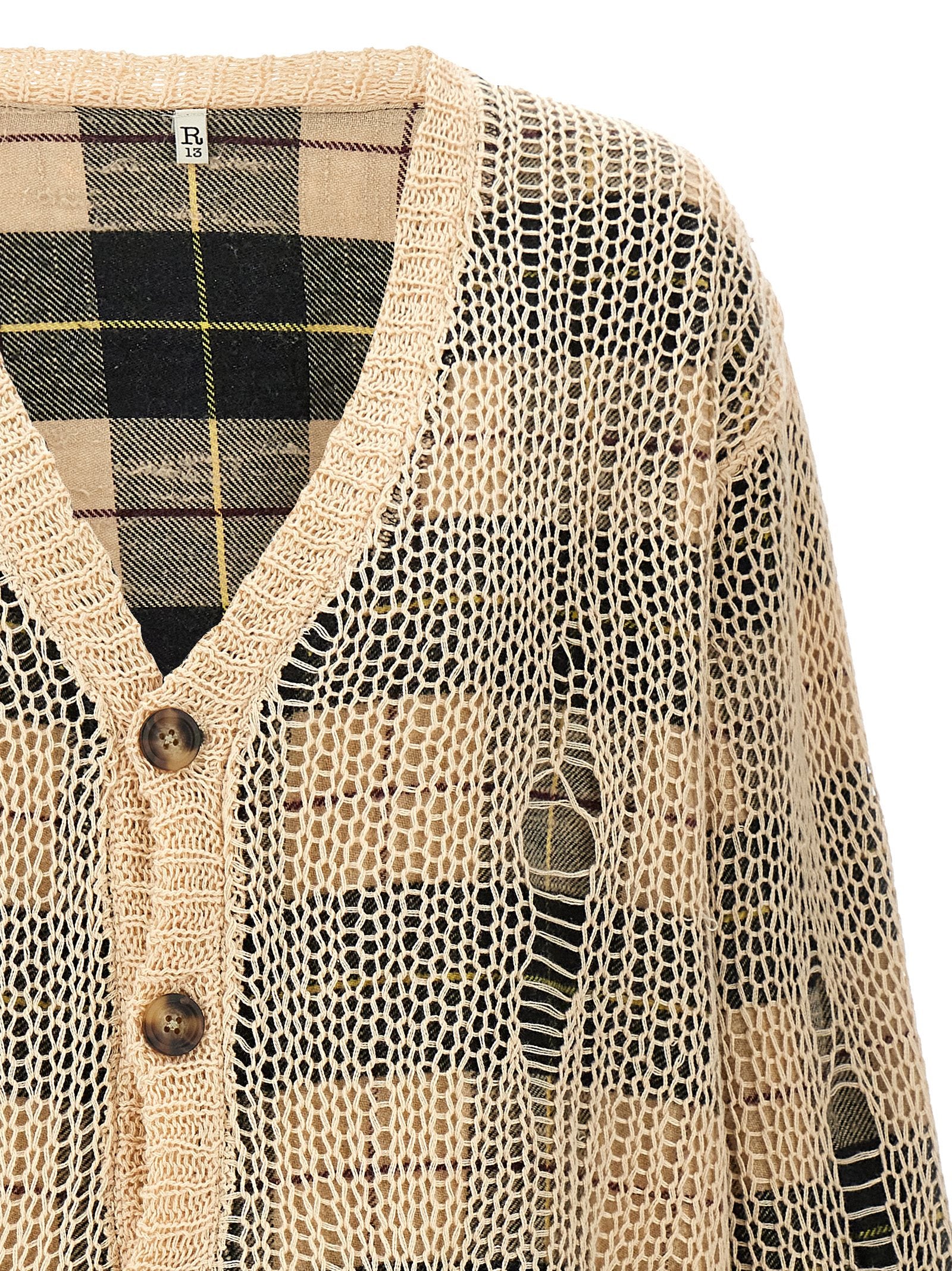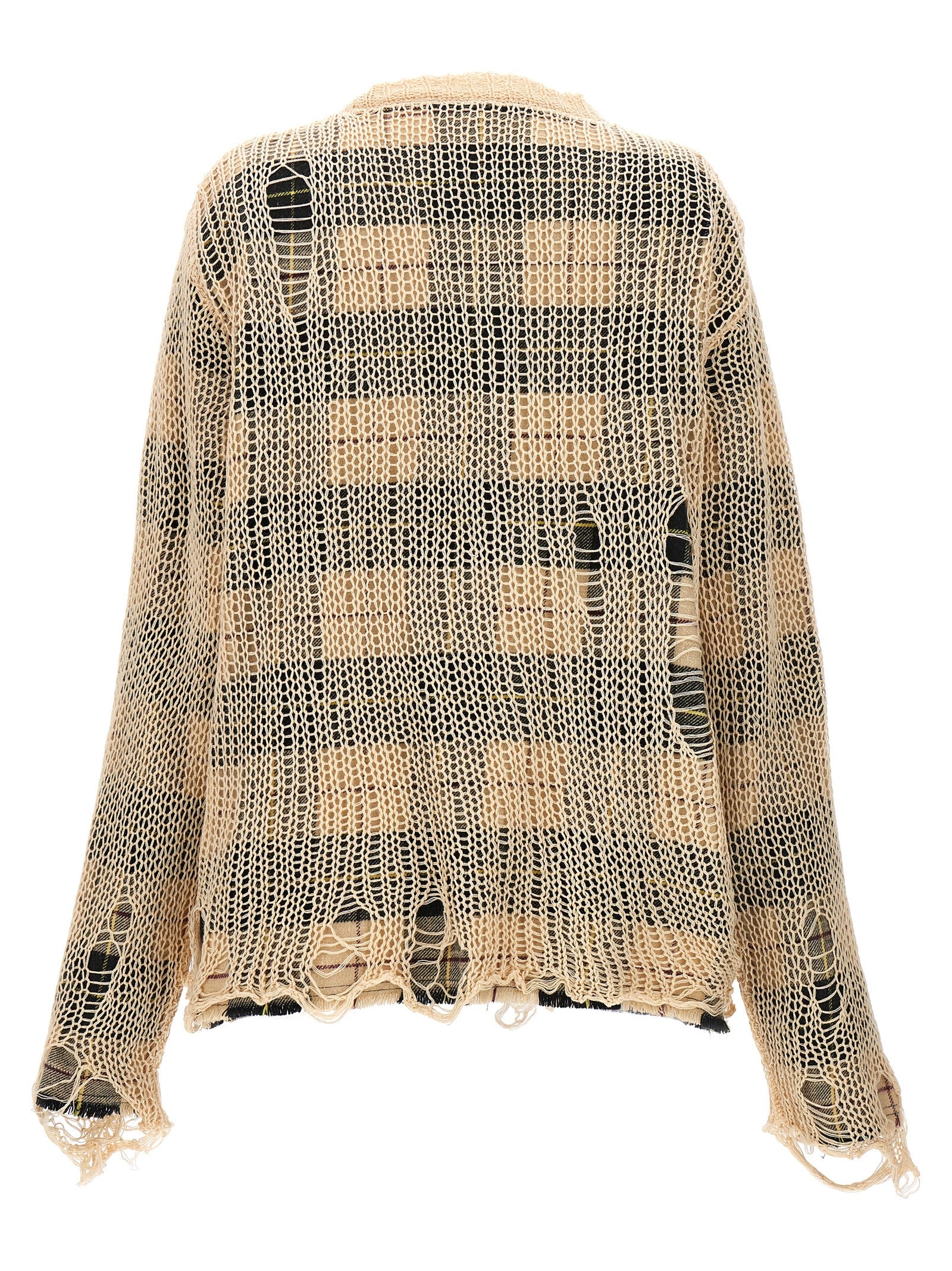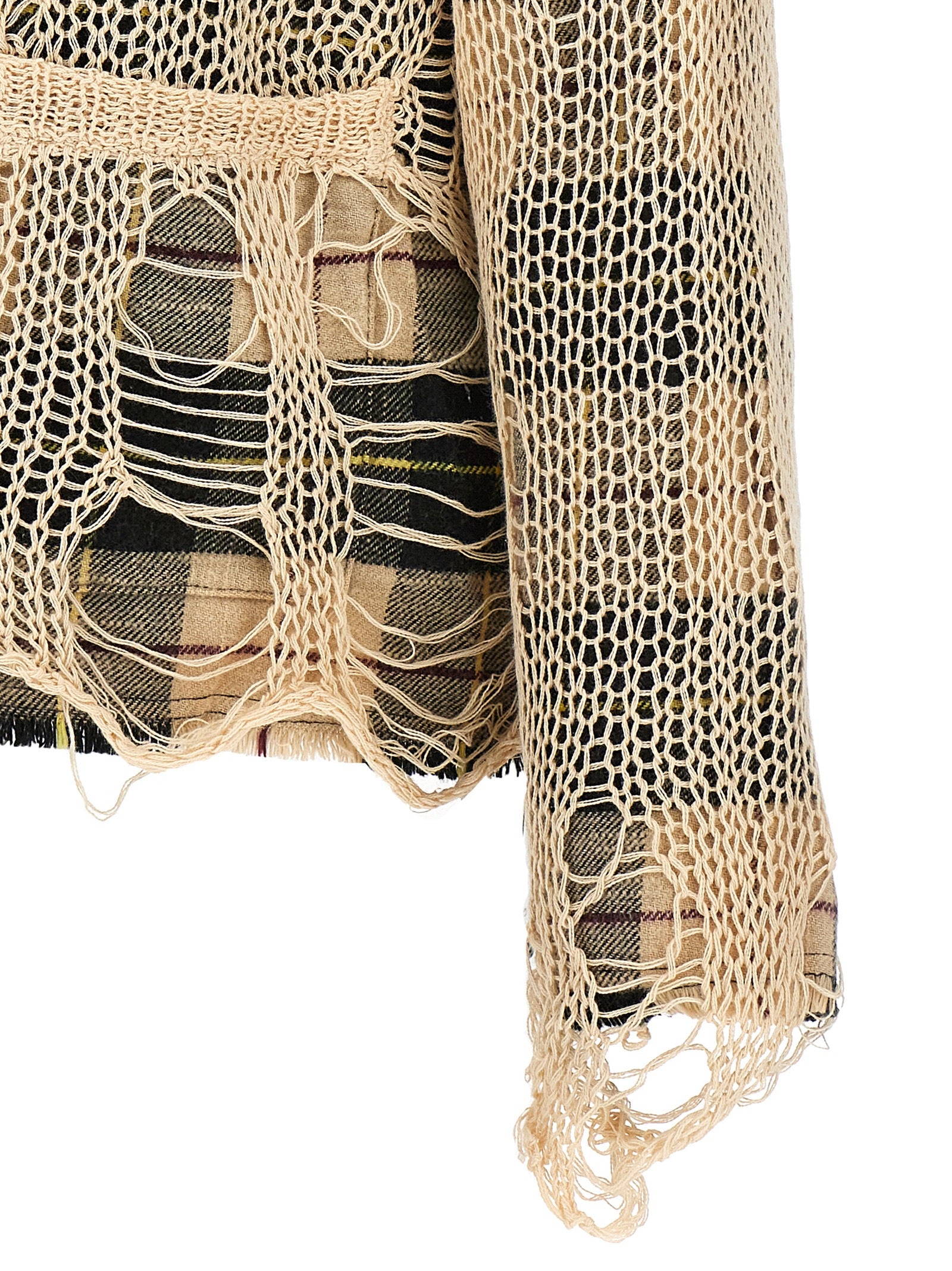 Cardigan "Overlay Anganited" composto da due strati. Il primo strato è una camicia di flanella a motivi tartan con una larga tessuta in maglia. Chiusura dei pulsanti, scollo a V.