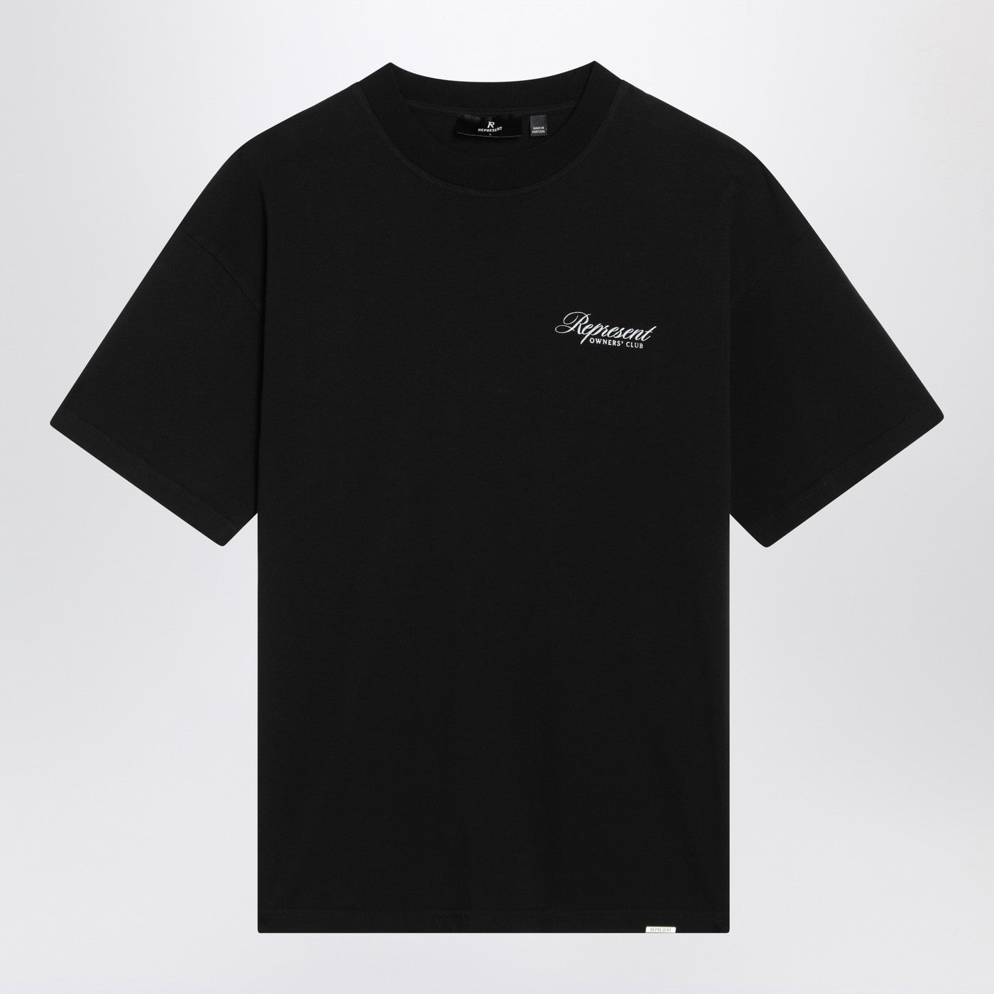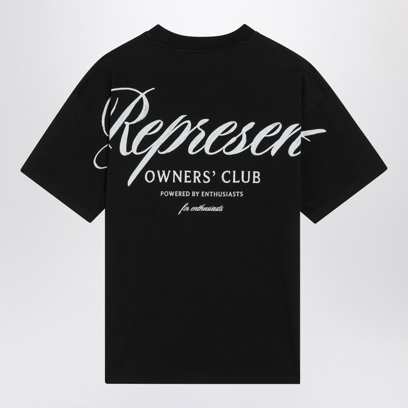 T-shirt in cotone nero di cotone, con una stampa logo a contrasto di un club dei proprietari sul retro, maniche corte, lettere di logo sul petto, orlo con targa in metallo logo e vestibilità di grandi dimensioni.