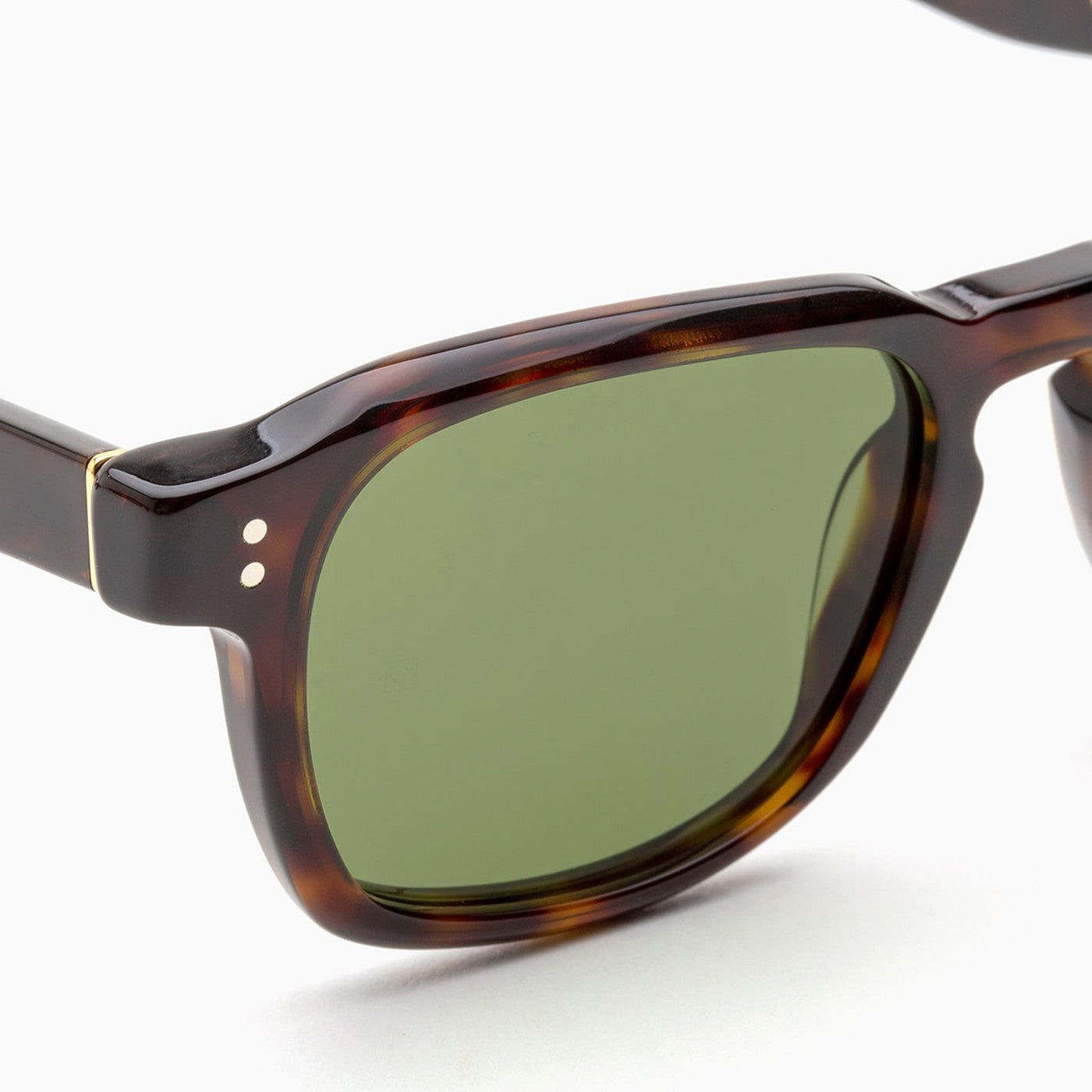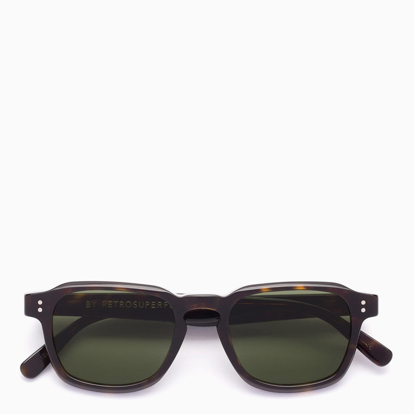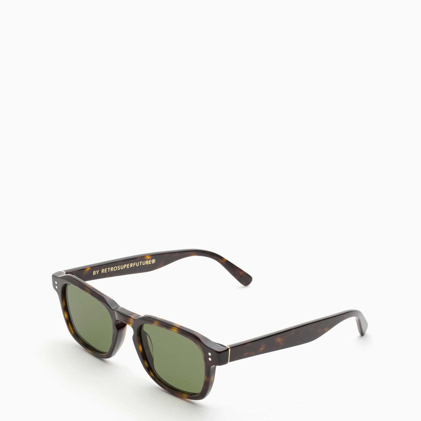 Occhiali da sole con una cornice acetata di tartaruga di Retrosuperfuture, con un logo contrastante sulle braccia e le lenti verdi della bottiglia.