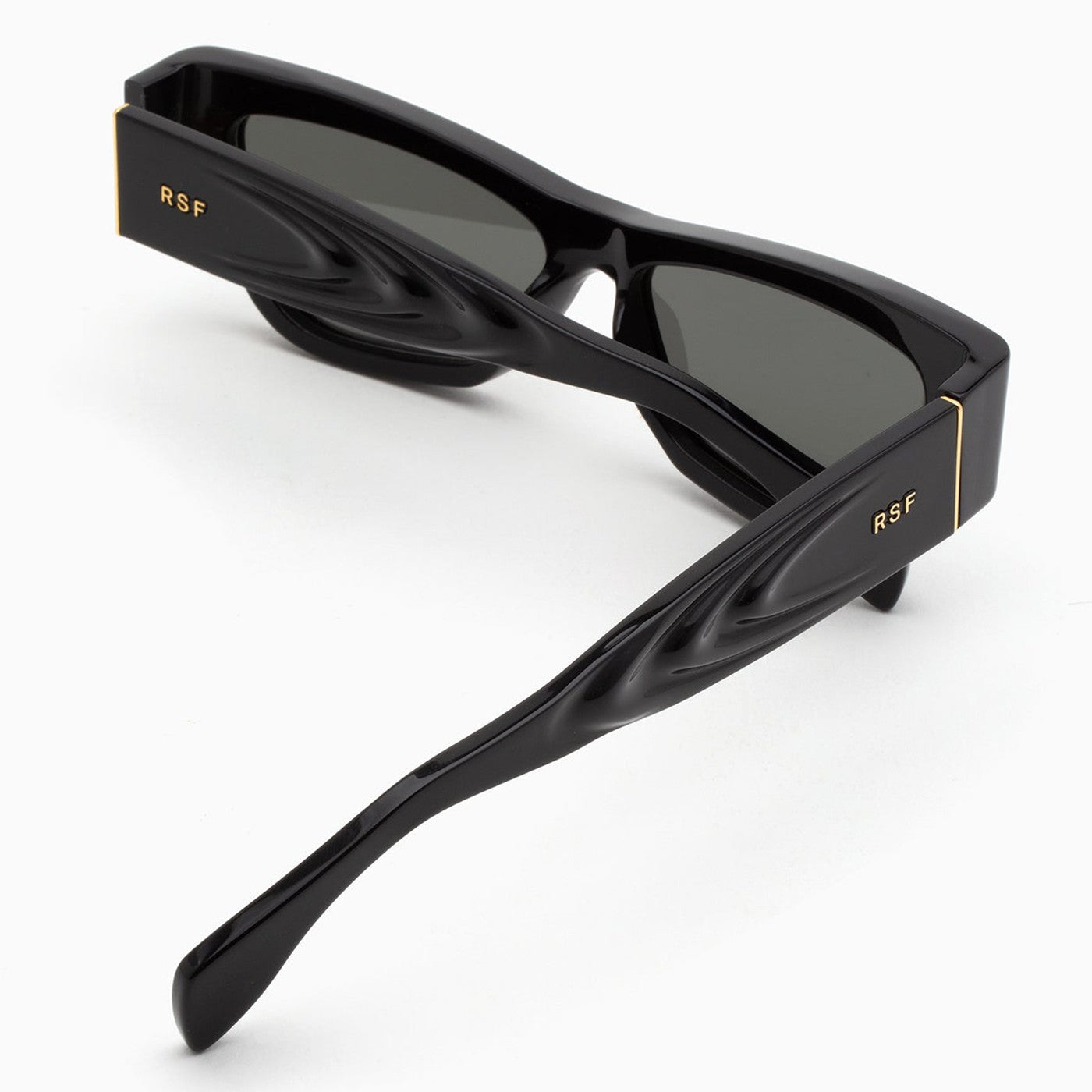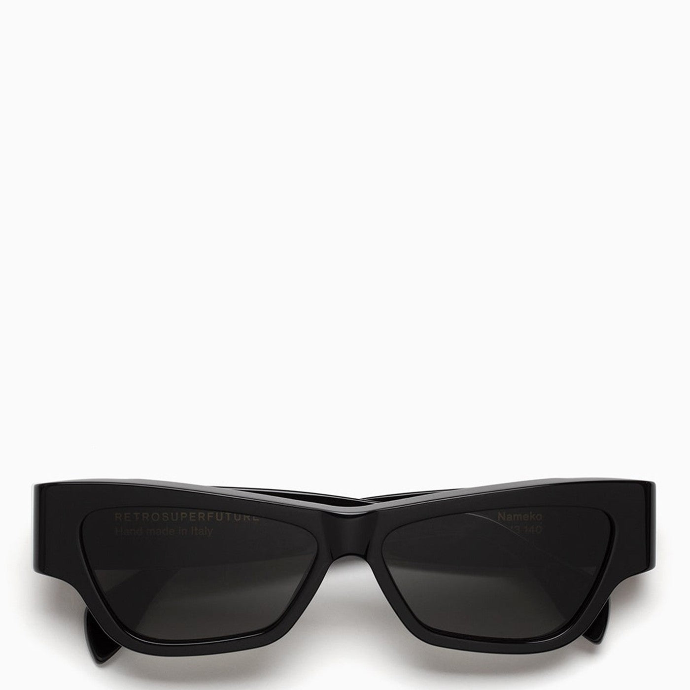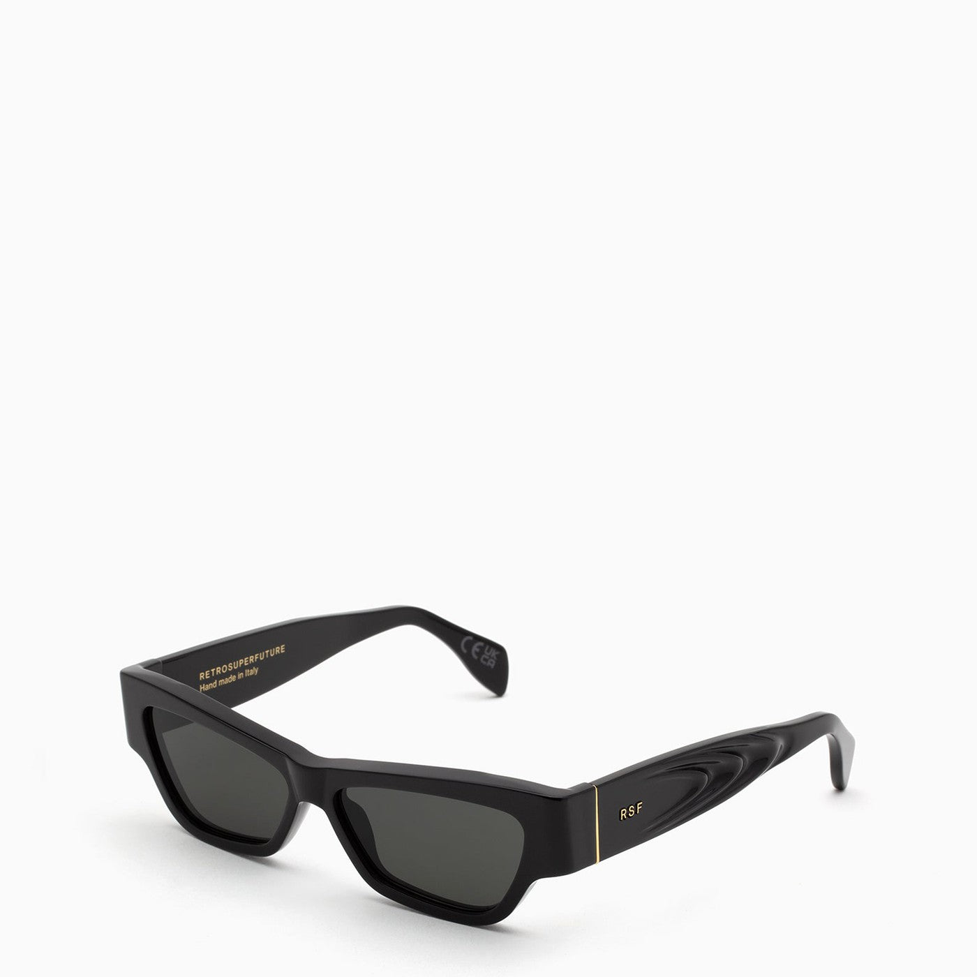 Occhiali da sole con una cornice acetata nera lucida di Retrosuperfuture, con un design geometrico, logo contrastante sulle braccia con dettagli in rilievo e lenti nere.