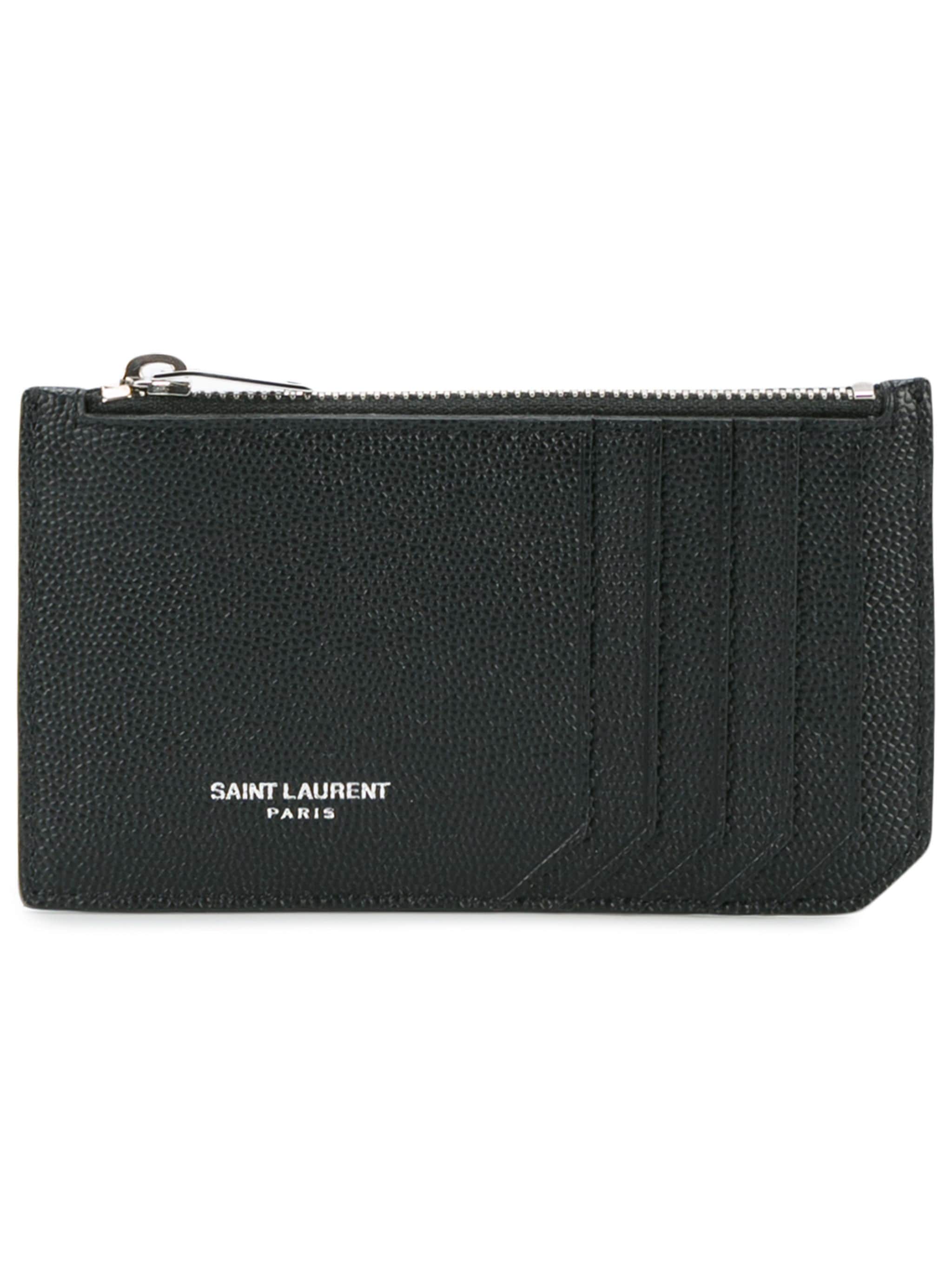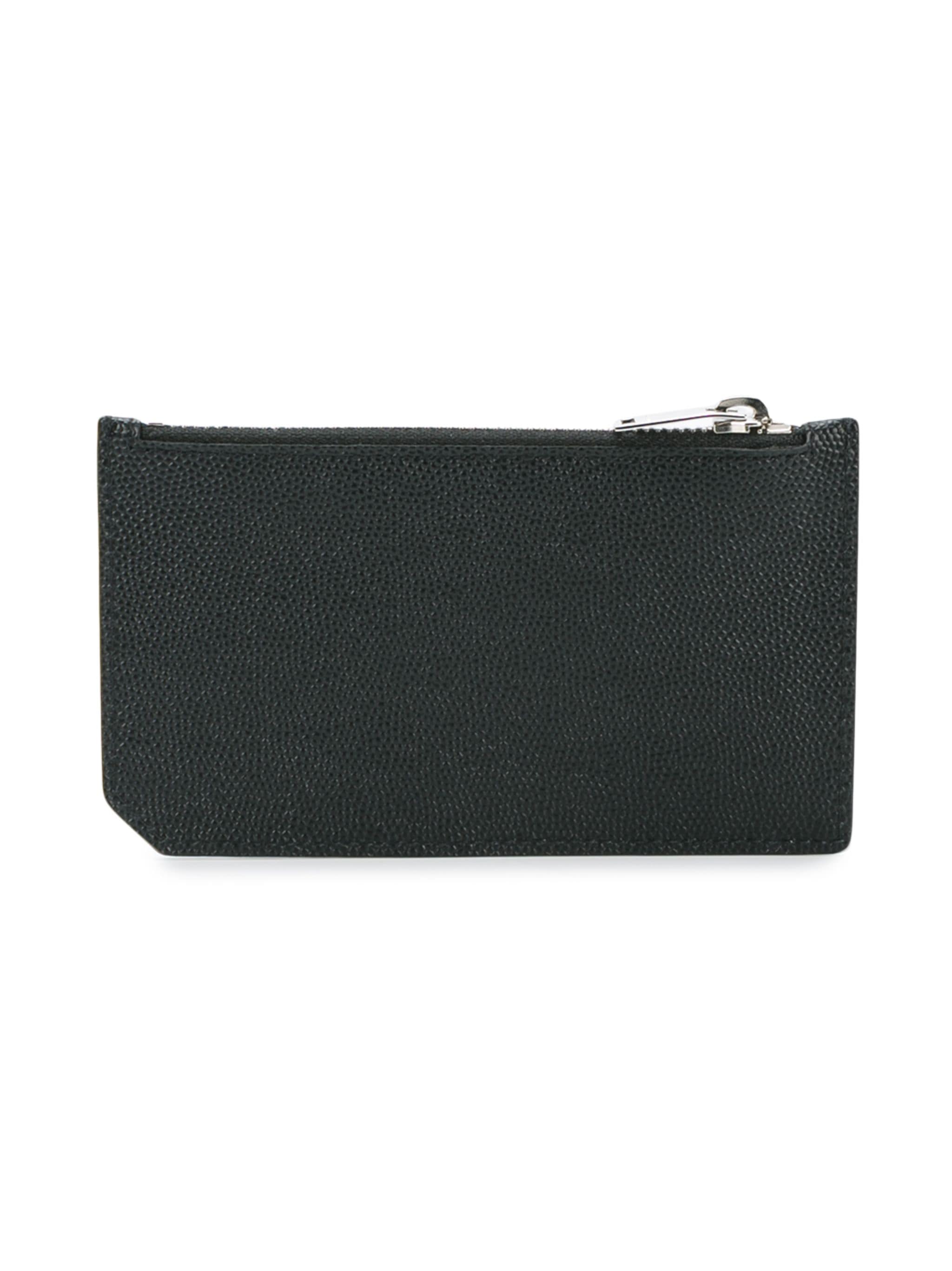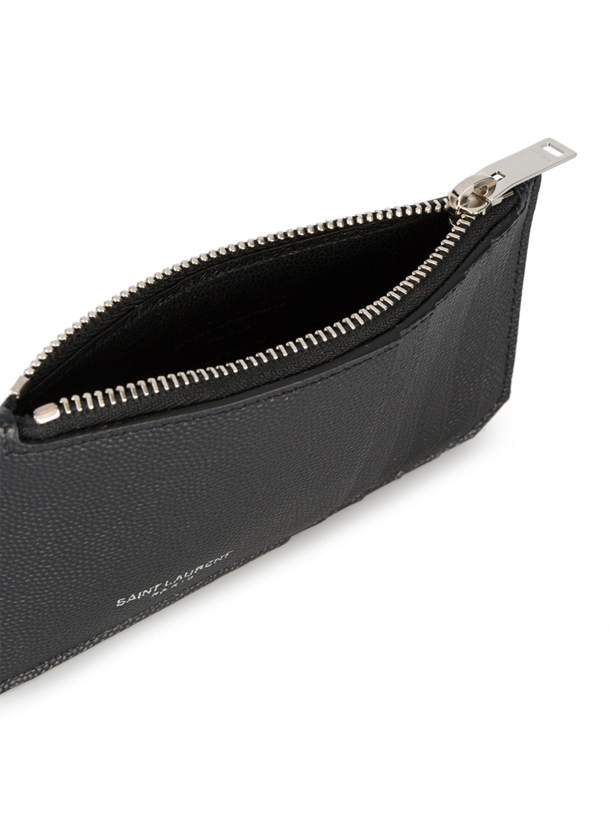 Saint Laurent's elegant case in metal-free tanned leather, characterized by a refined finish and practical details. This case includes five card slots, a zip compartment at the top and a side bellows for extra capacity.