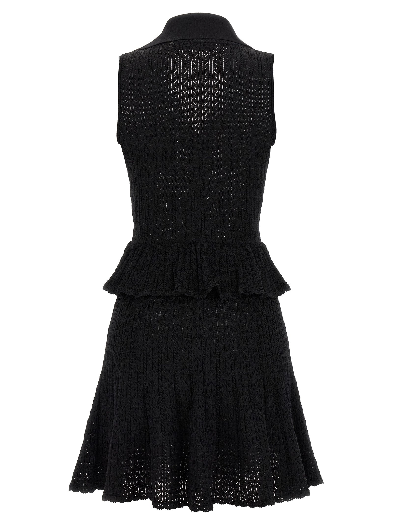 Abito "Black Pointelle Mini" in miscela di viscosa a maglia con punta, colletto, scollo a V, chiusura dei pulsanti anteriori, senza maniche, pepli in vita, gonna svasata, tasche.