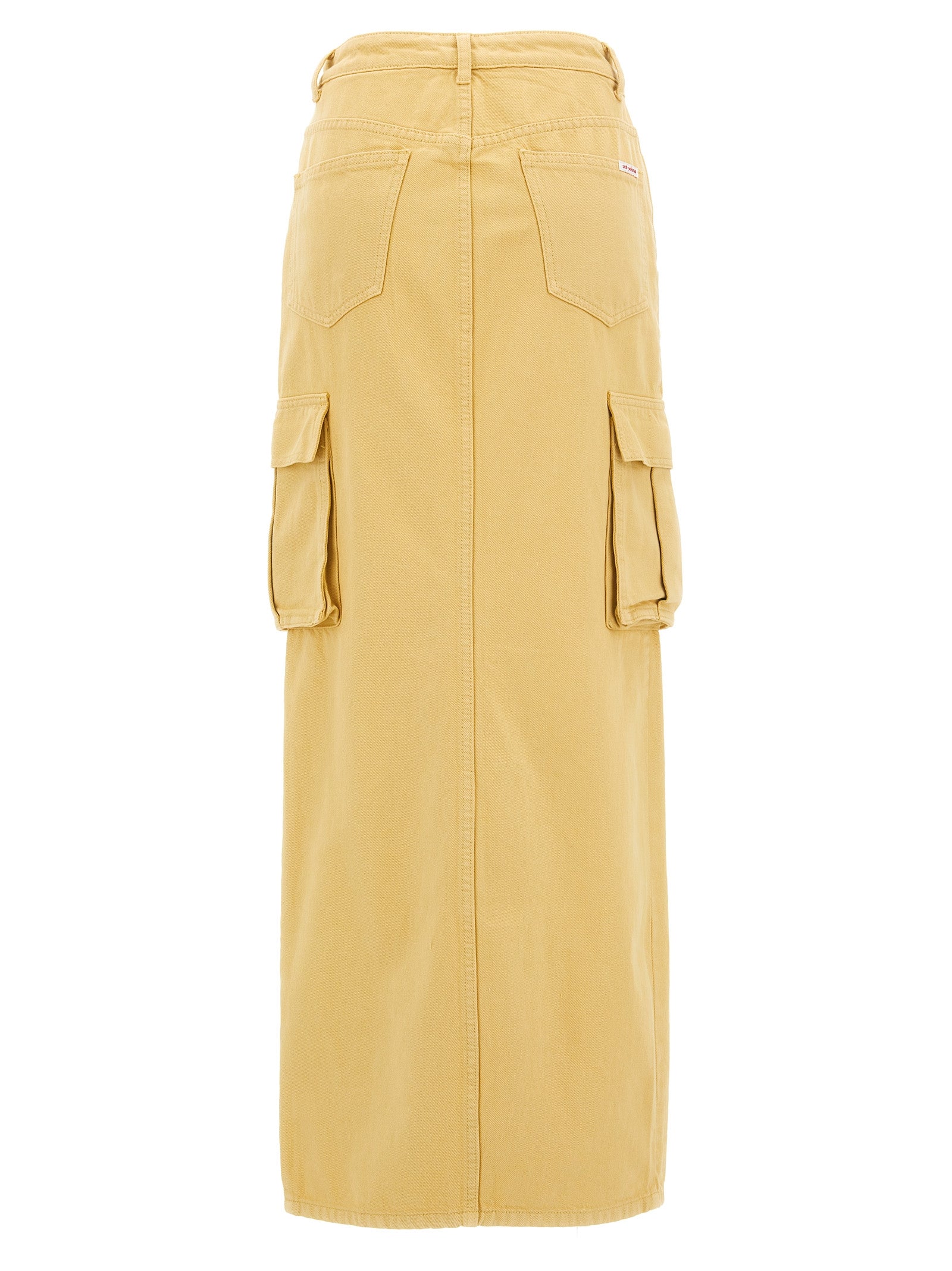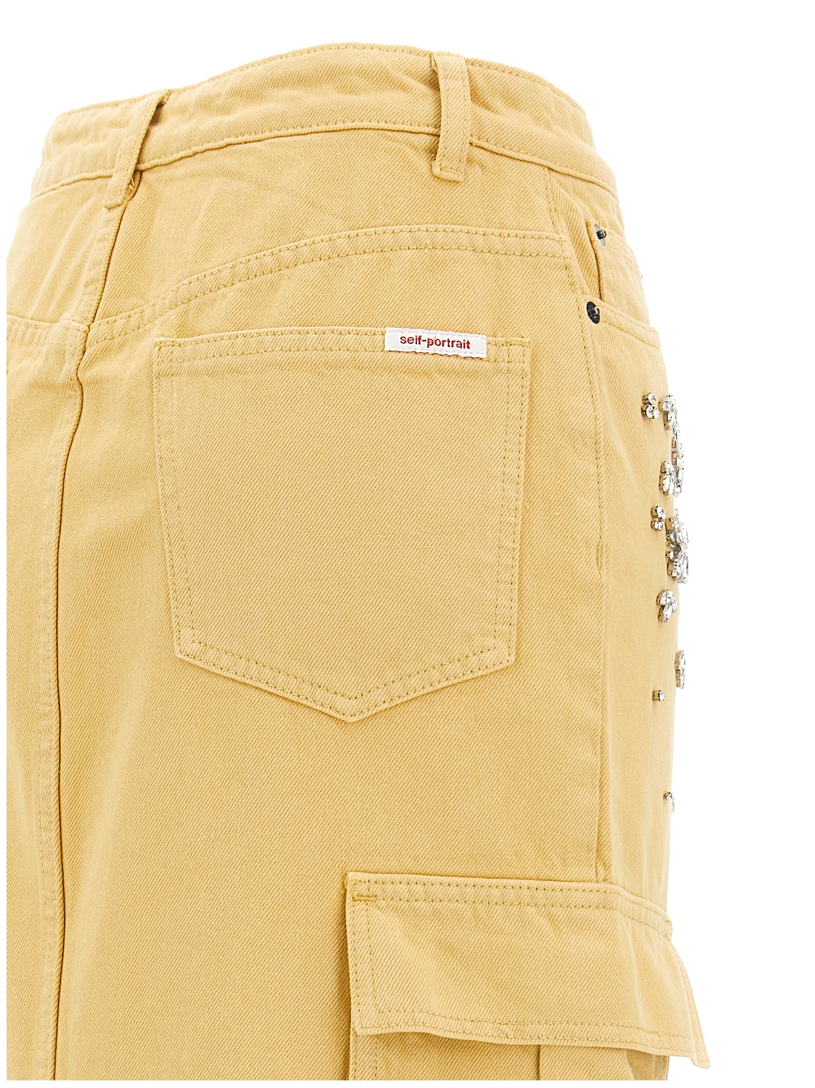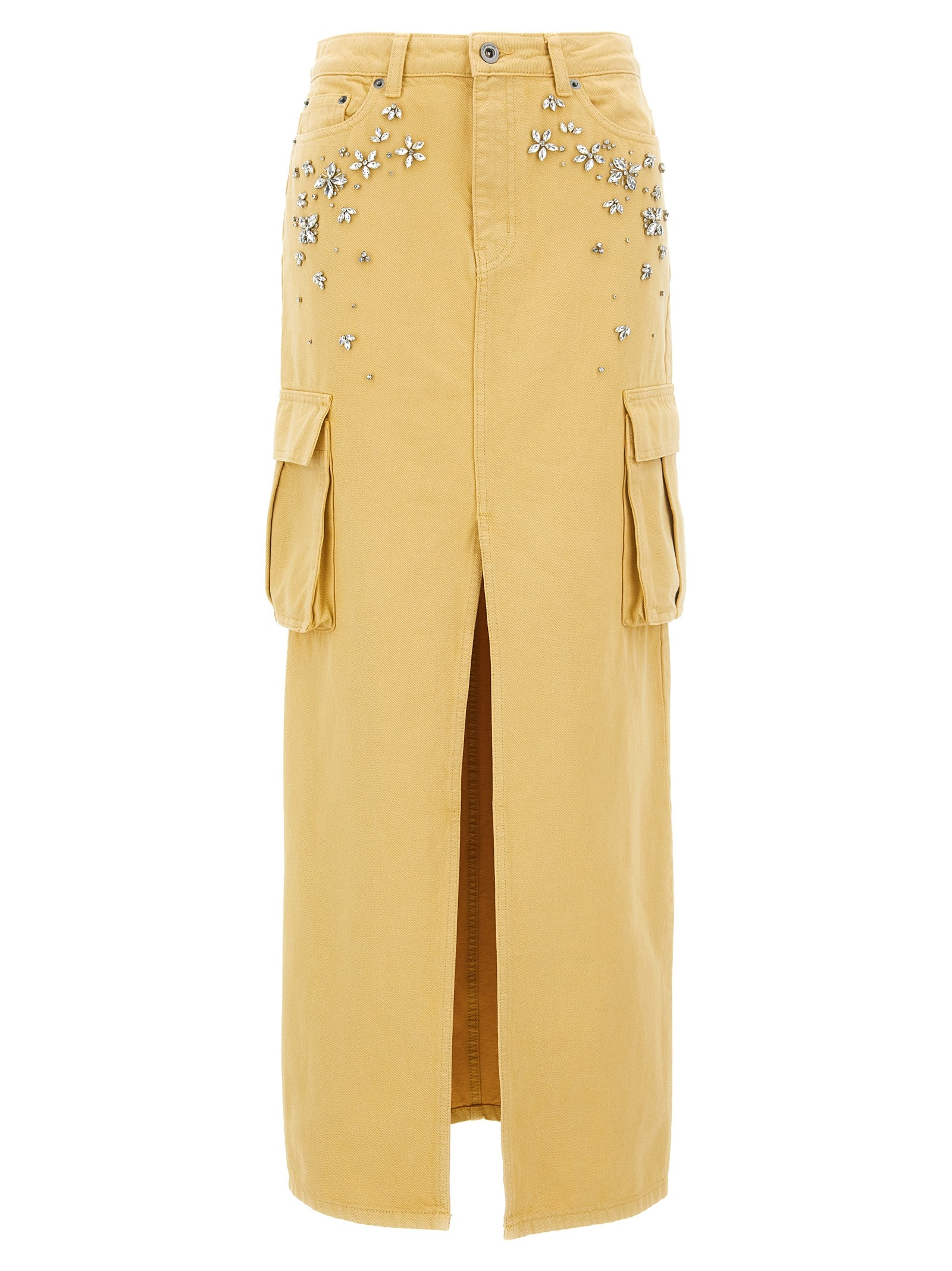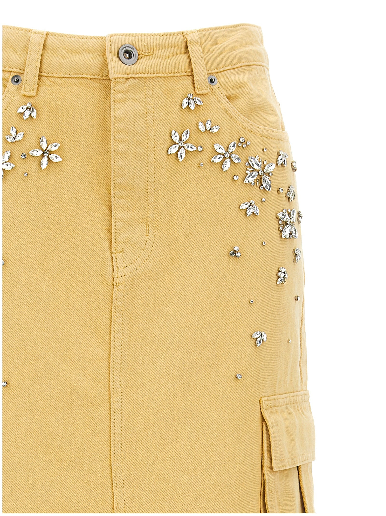 Gonna in denim in cotone "abbellito cargo di jeans maxi" con dettaglio in cristallo, chiusura a zip e pulsanti, cinque tasche, tasche laterali massime, divisione anteriore.