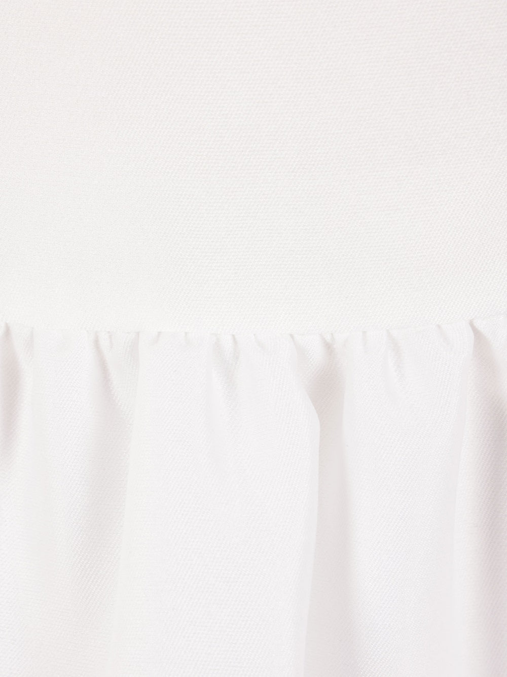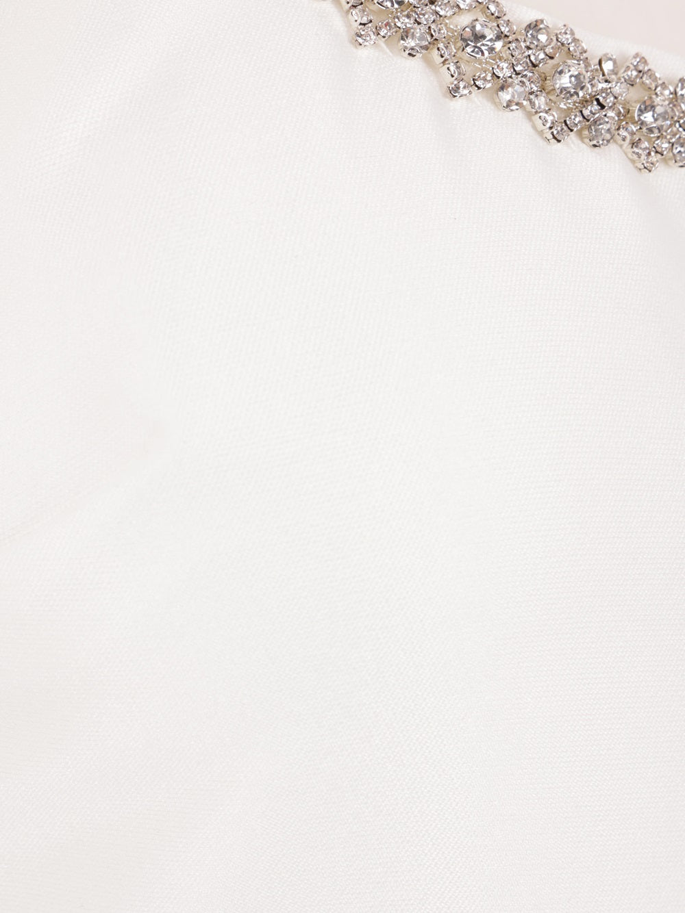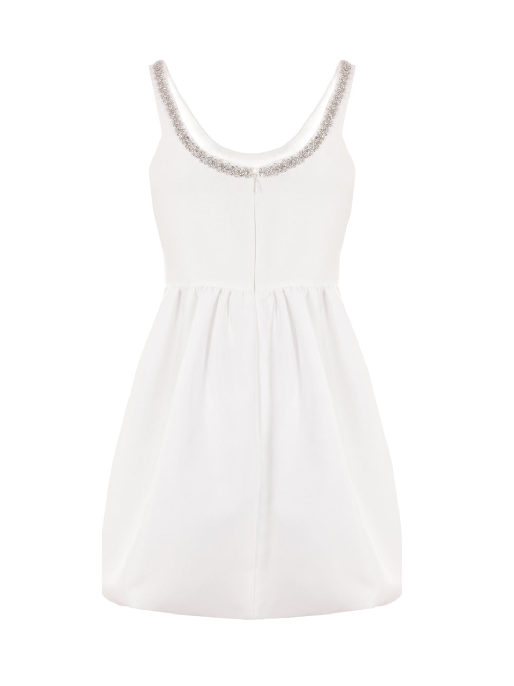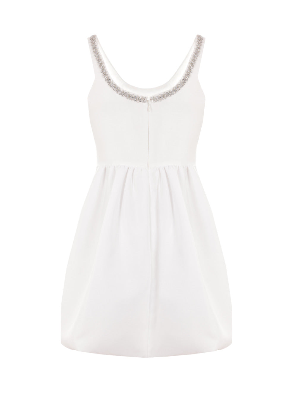 Minidress auto -ritratto realizzato in taffeta bianca con profili impreziositi da cristalli trasparenti. Con una scollatura larga, cinghie di bandeau, una fissaggio di gancio/zip sul retro, una vita raccolta, una gonna a bolle e un interno foderato.