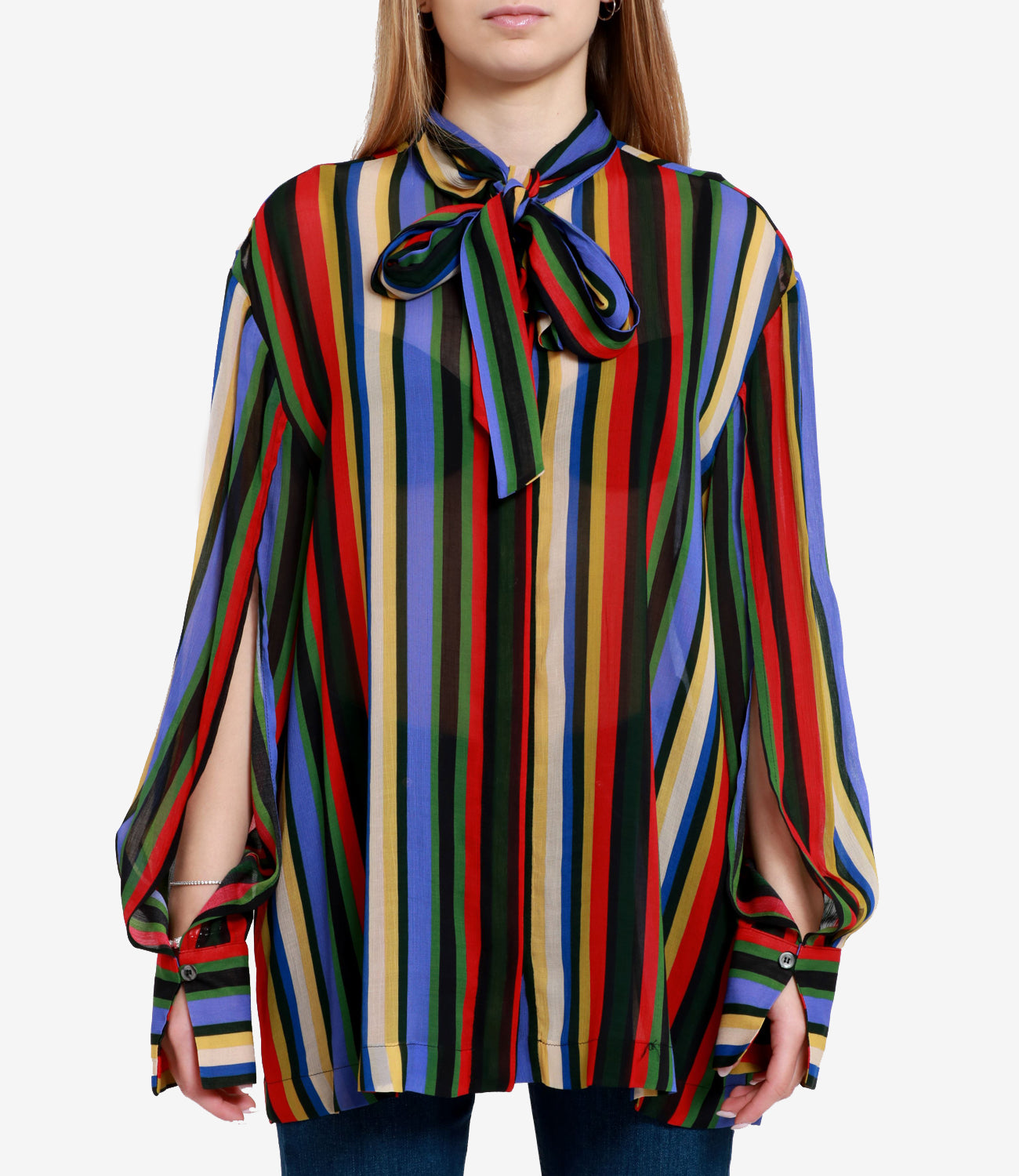 - Creponne viscosa - Pattern a strisce - collare con sciarpa nel suo tessuto - manica lunga con prese d'aria interne e polsini a bottone alti - Chiusura dei pulsanti anteriore - Lunghezza del bacino - Fit regolare - Made in Italia