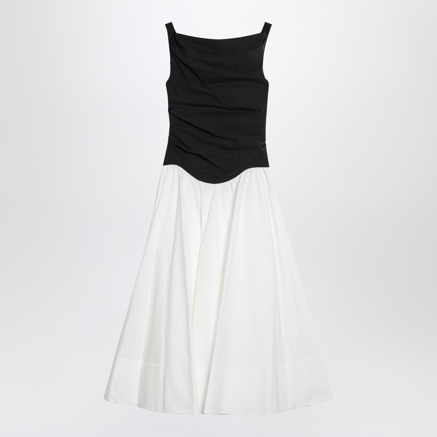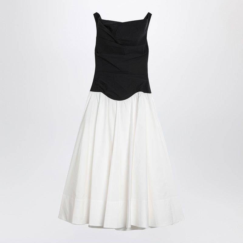 Abito midi di Simkhai in miscela di cotone con un corpetto nero e una gonna bianca larga, con un design off-the-shoulder, due tasche laterali e chiusura a zip sul lato.