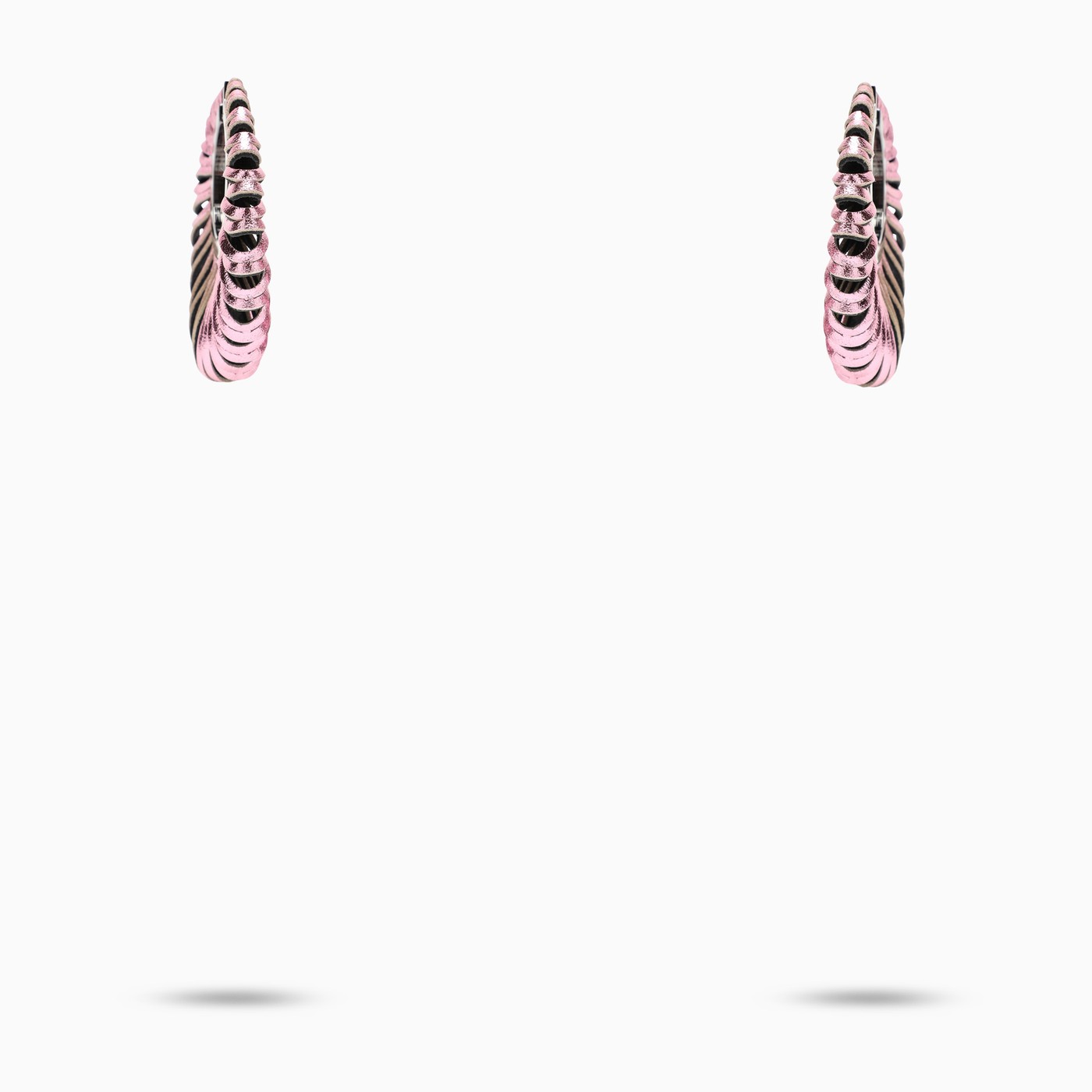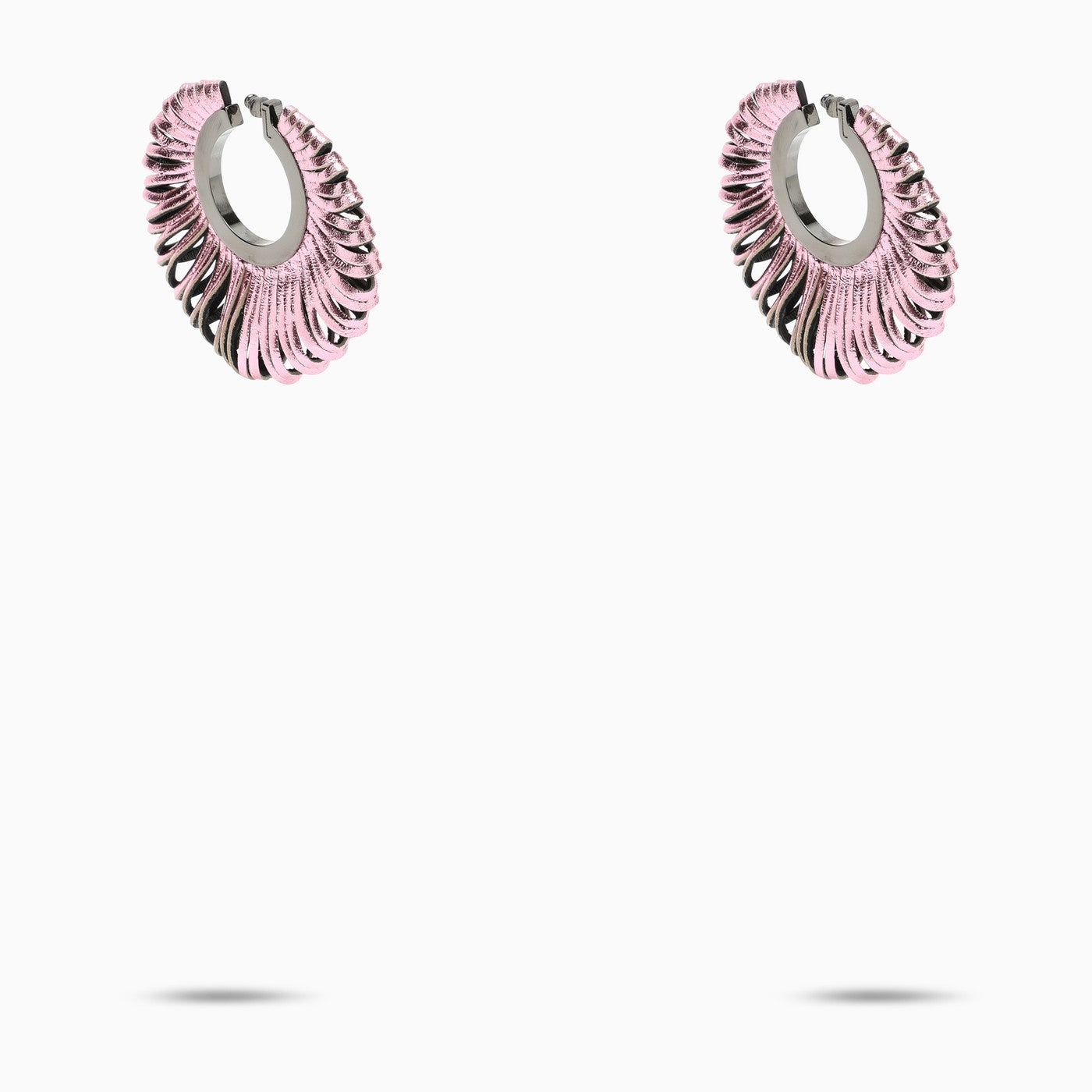 Paio di orecchini SO-LE STUDIO in pelle metallizzata rosa, caratterizzati da base e chiusura posteriore in ottone color argento.