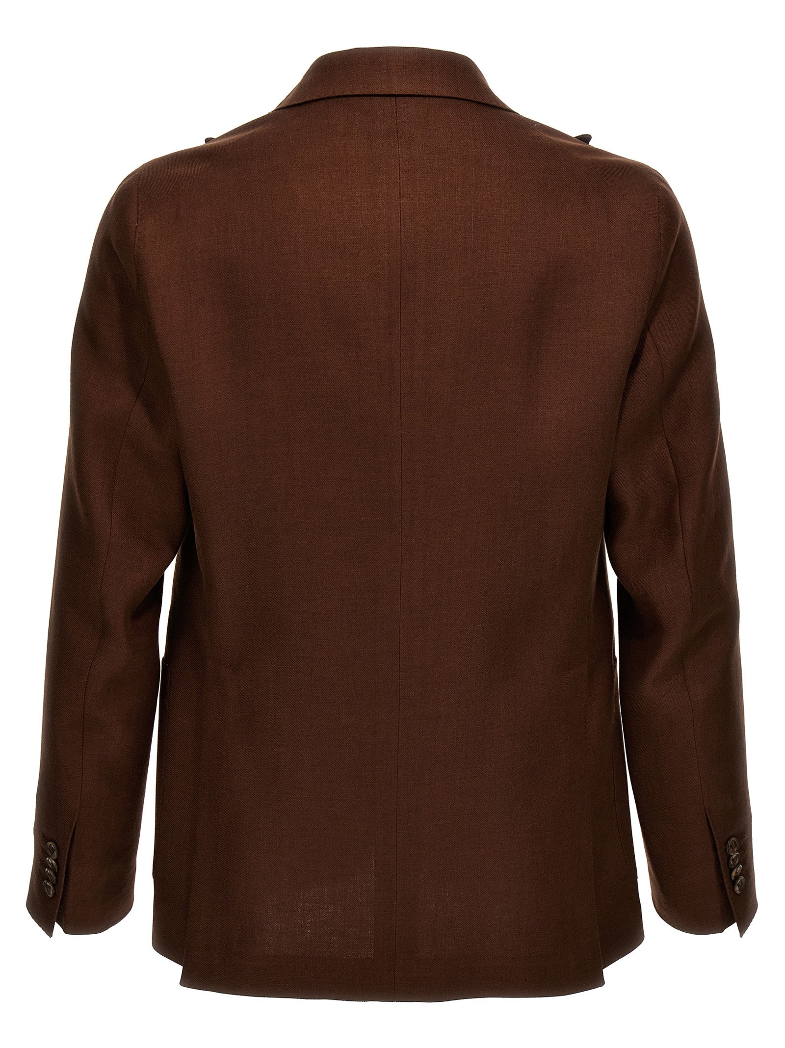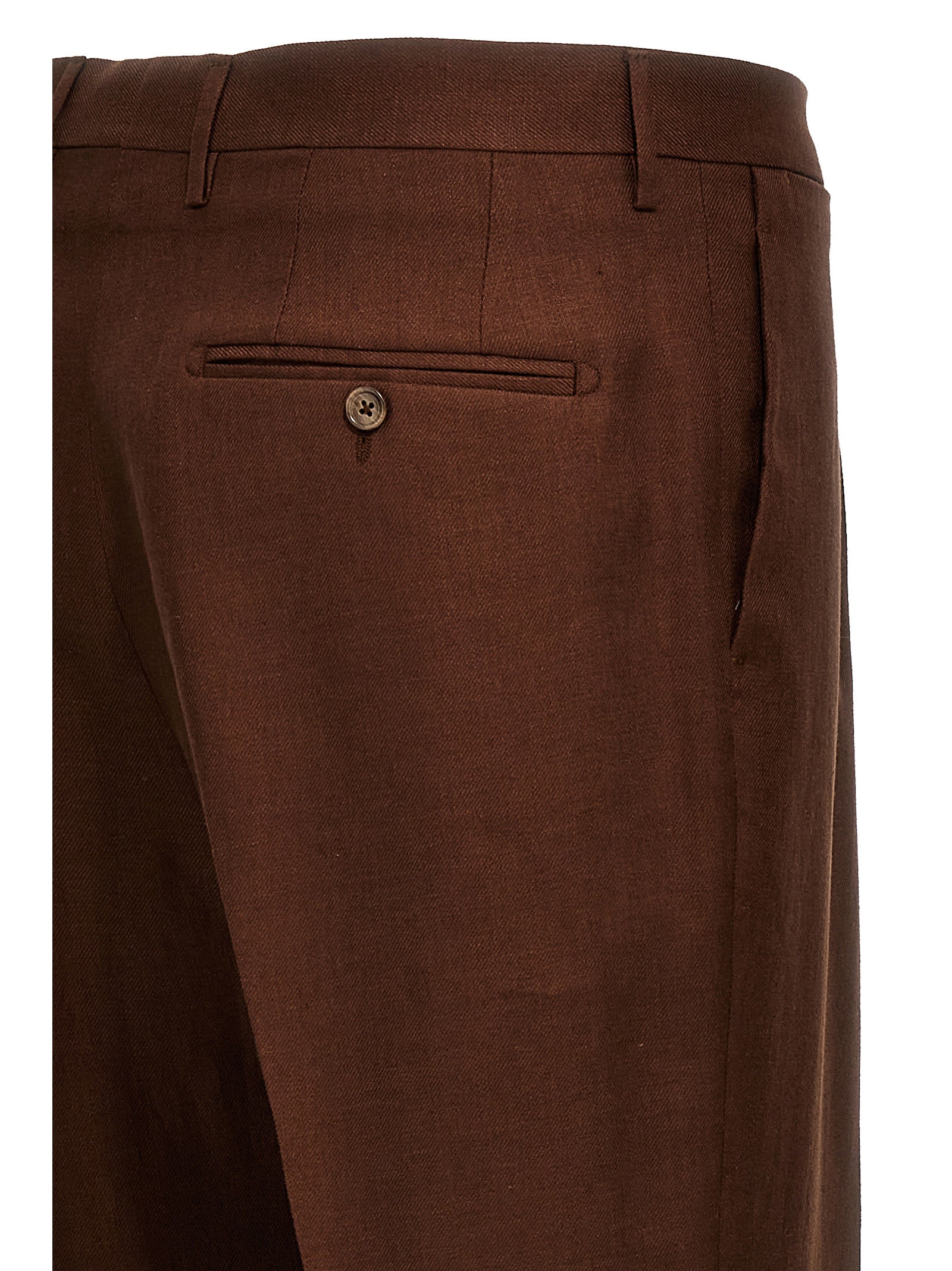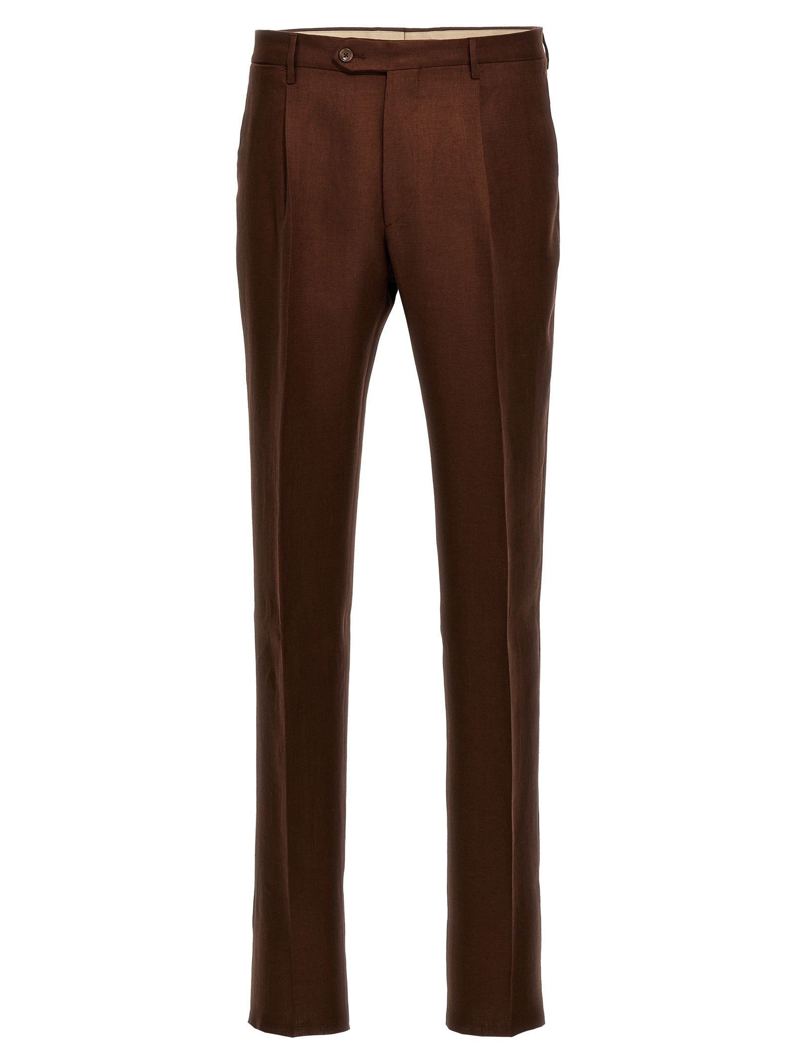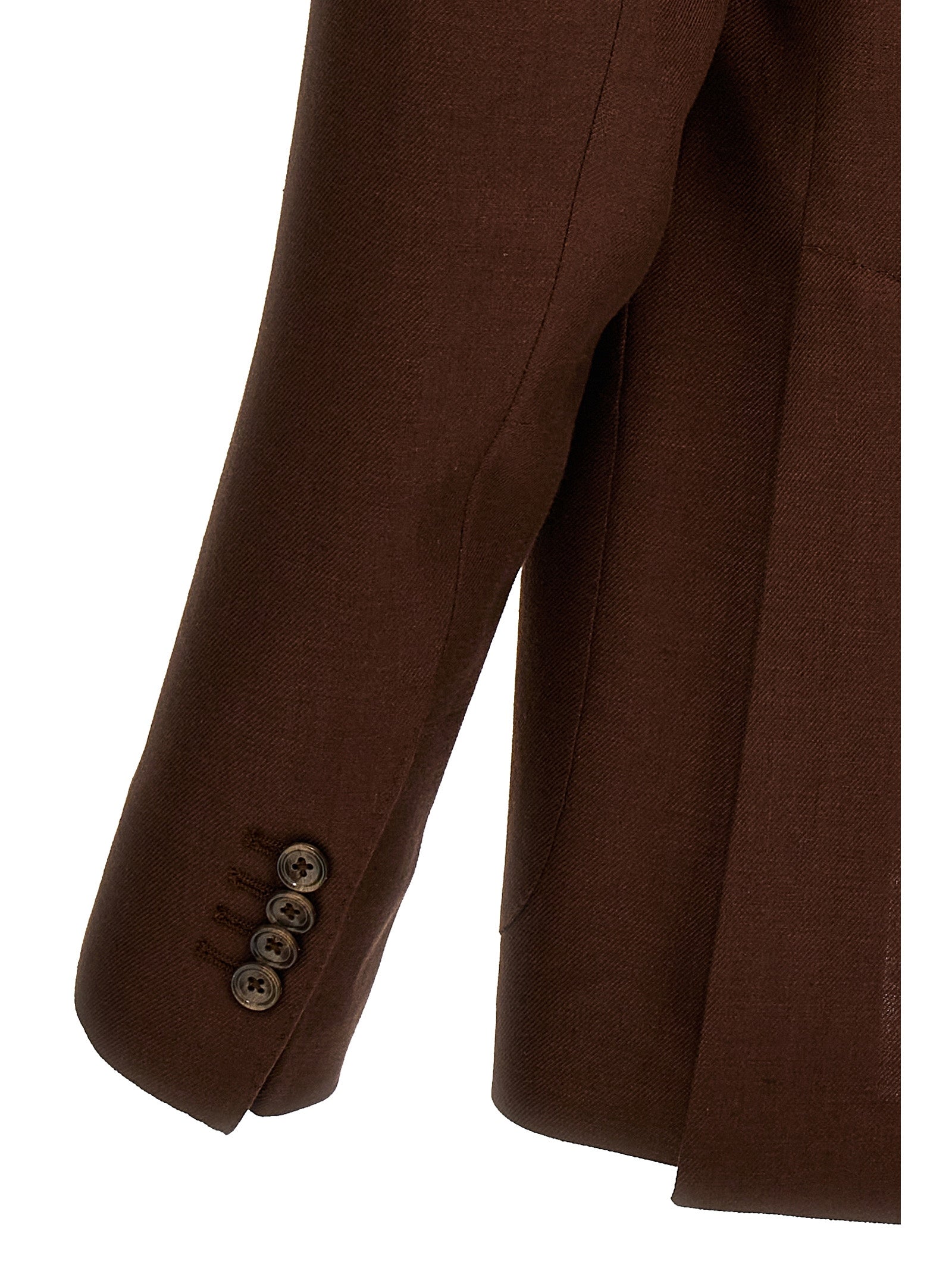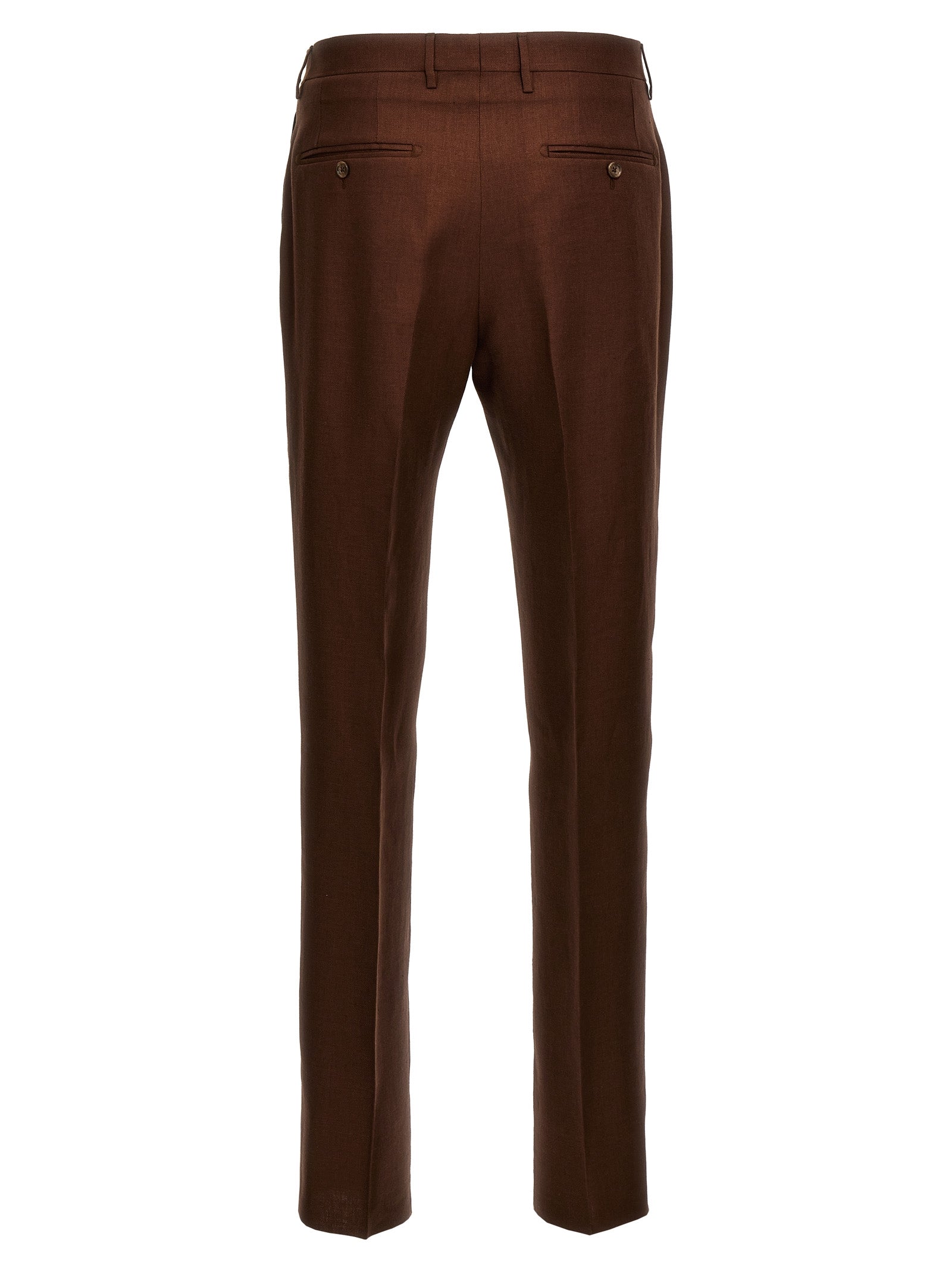 Abito di lino composto da blazer a petto singolo con chiusura a bottone, tasche, maniche lunghe, fessure posteriori, pantaloni con perno e piega con stiratura, chiusura a zip e pulsanti, tasche.
