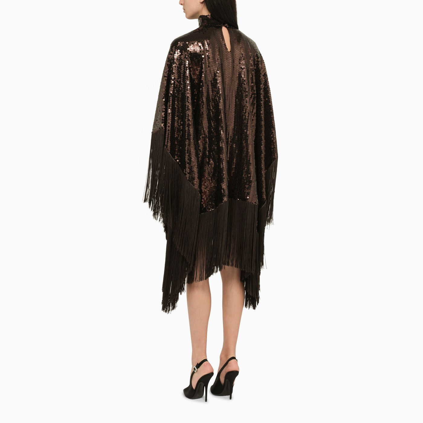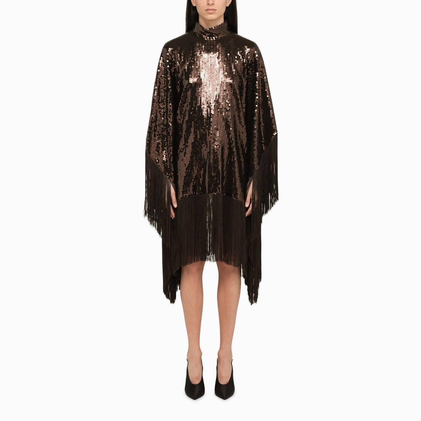 Abito tunico di Tellier Marmo in paillettes color cioccolato, con frange decorative tono su tono.